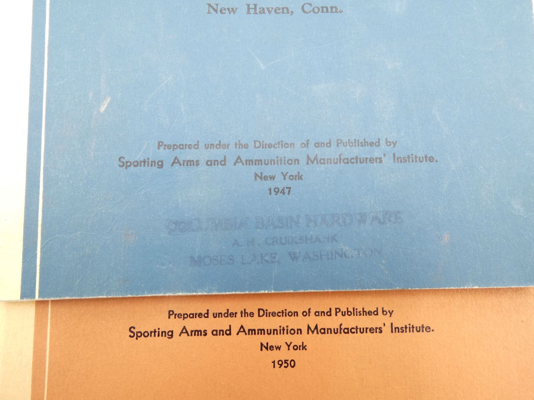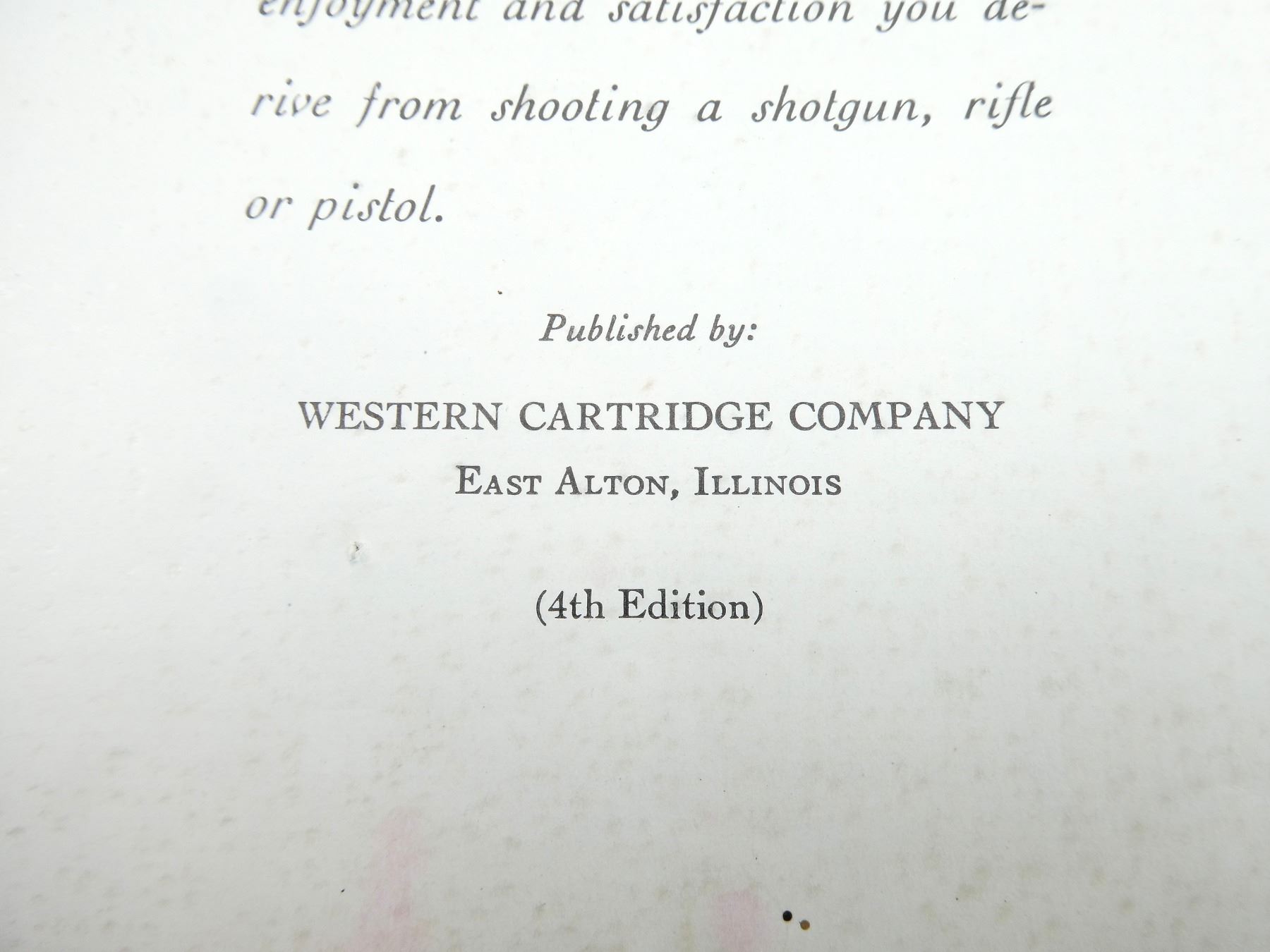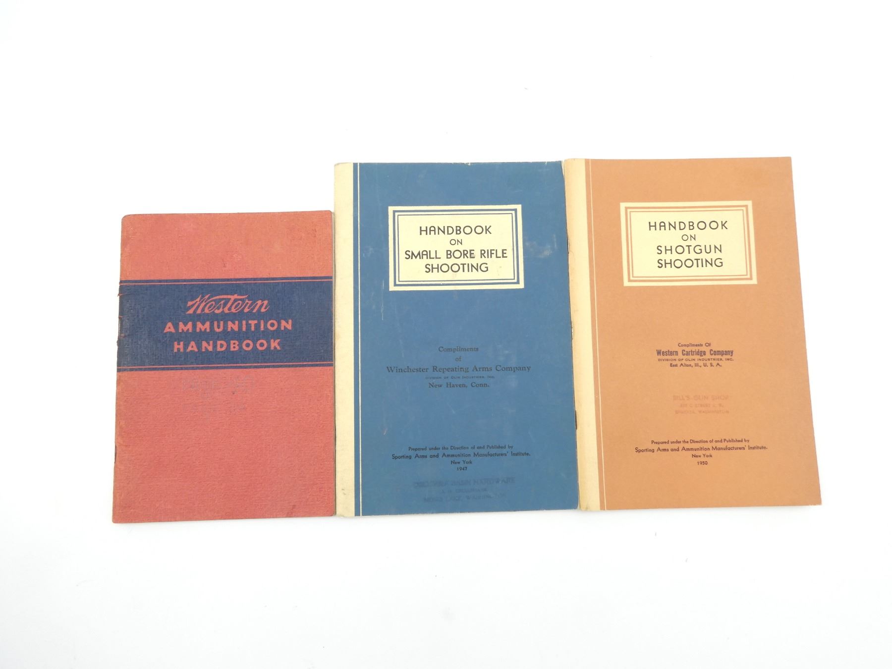 LOT INCLUDES; (1) "WESTERN AMMUNITION HANDBOOK", BY WESTERN CARTRIDGE COMPANY, SOFT COVER, (1) "HANDBOOK ON SMALL BORE RIFLE SHOOTING", BY COLONEL TOWNSEND WHELEN, SOFT COVER, DATED 1947 & (1) "HANDBOOK ON SHOTGUN SHOOTING", PUBLISHED BY SPORTING ARMS AND AMMUNITION MANUFACTURERS' INSTITUTE, SOFT COVER, COPYRIGHT 1950. SEE PHOTOS.