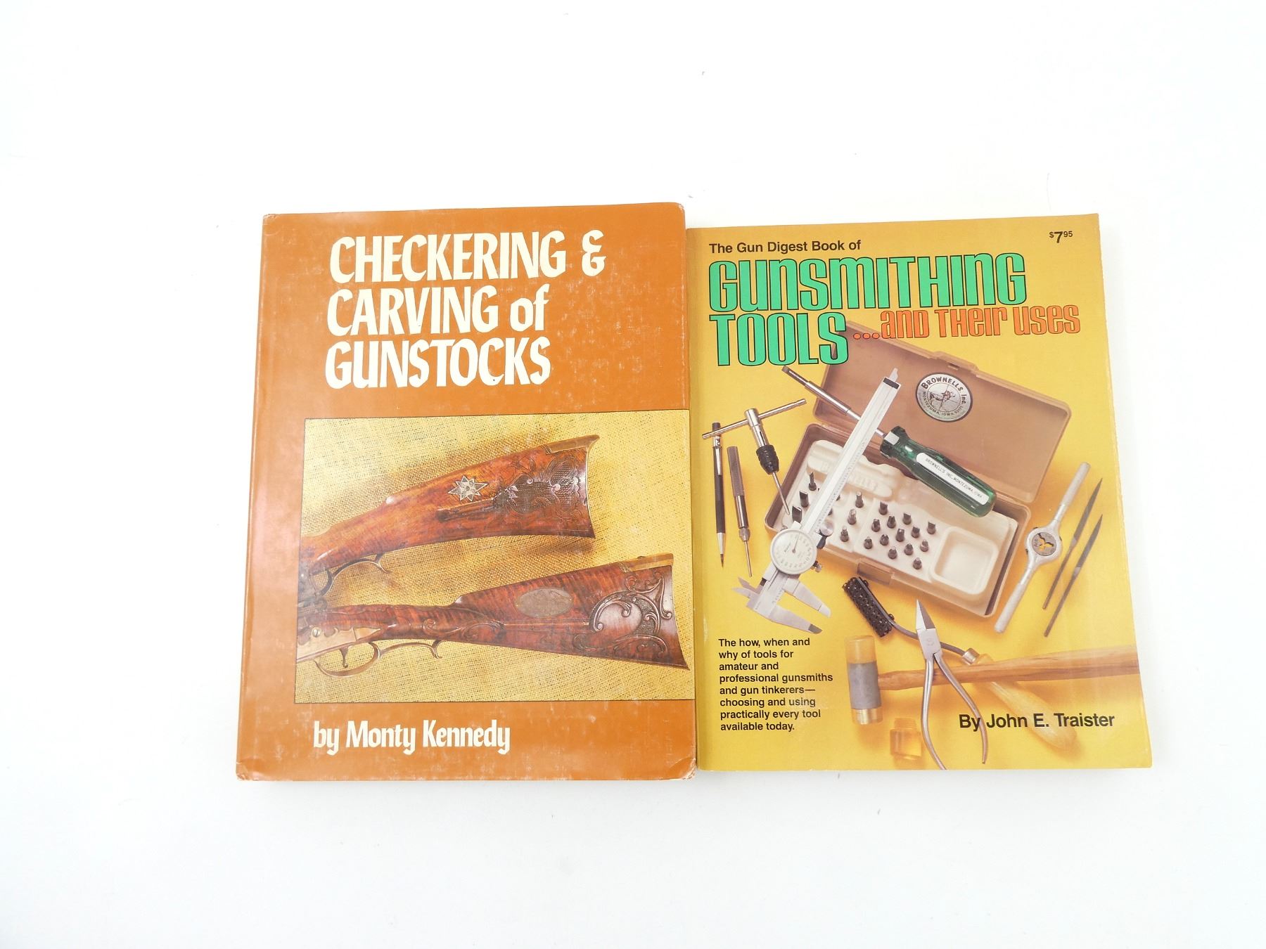 LOT INCLUDES; (1) "THE GUN DIGEST BOOK OF GUNSMITHING TOOLS…AND THEIR USES", BY JOHN E. TRAISTER, SOFT COVER, ISBN: 0-910676-08-9 & (1) "CHECKERING & CARVING OF GUNSTOCKS", BY MONTY KENNEDY, HARD COVER WITH DUST COVER, COPYRIGHT 1962. SEE PHOTOS.
