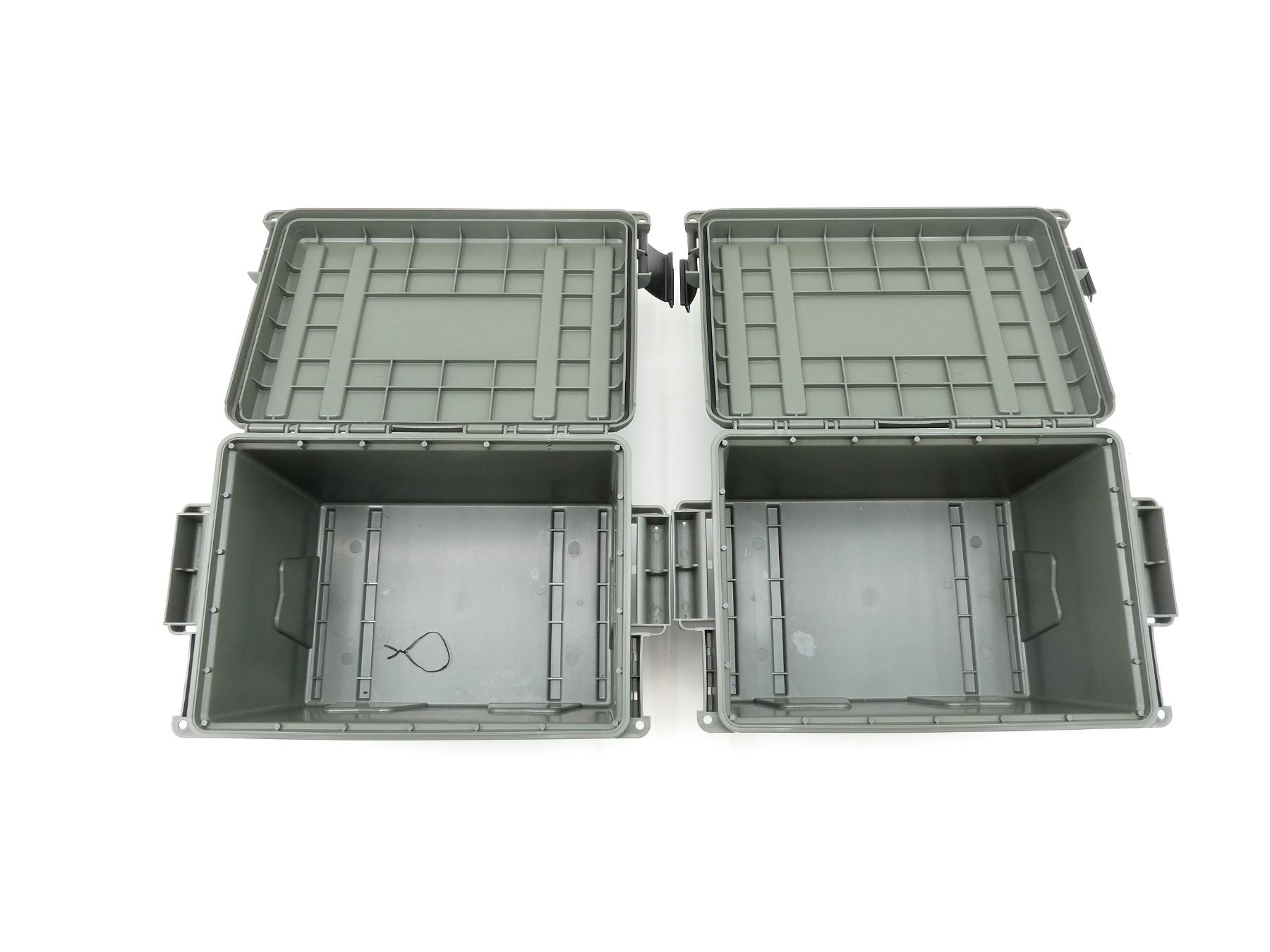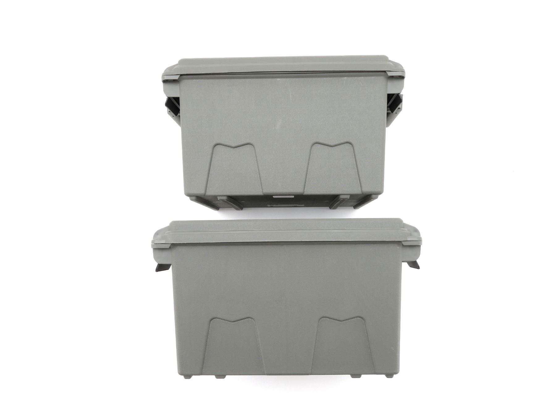 LOT INCLUDES; (2) GREEN POLYMER DRY AMMO / STORAGE BOXES, WITH CARRY HANDLES & LATCHES, MARKED: "MTM CASE-GARD", ETC. OVERALL LENGTH APPROX. 17" X 10.5" X 9". SEE PHOTOS.