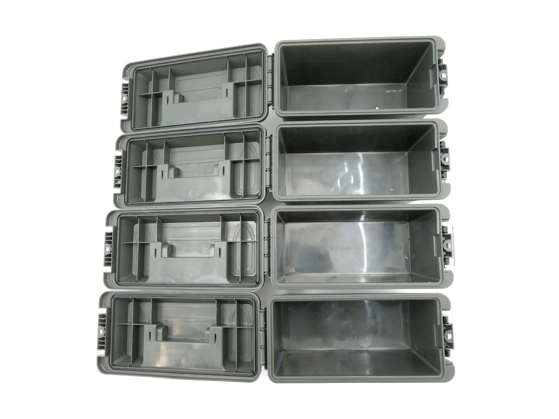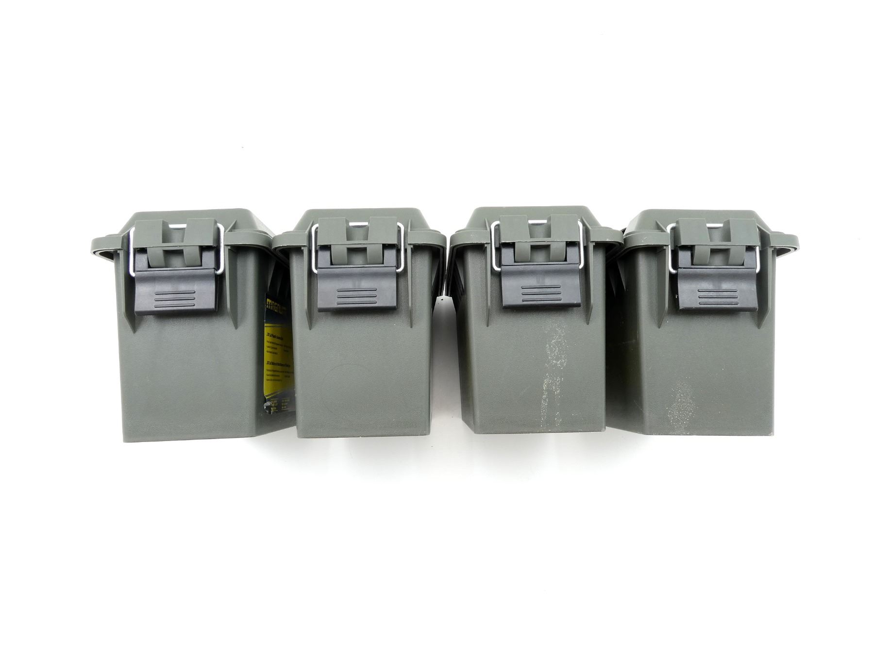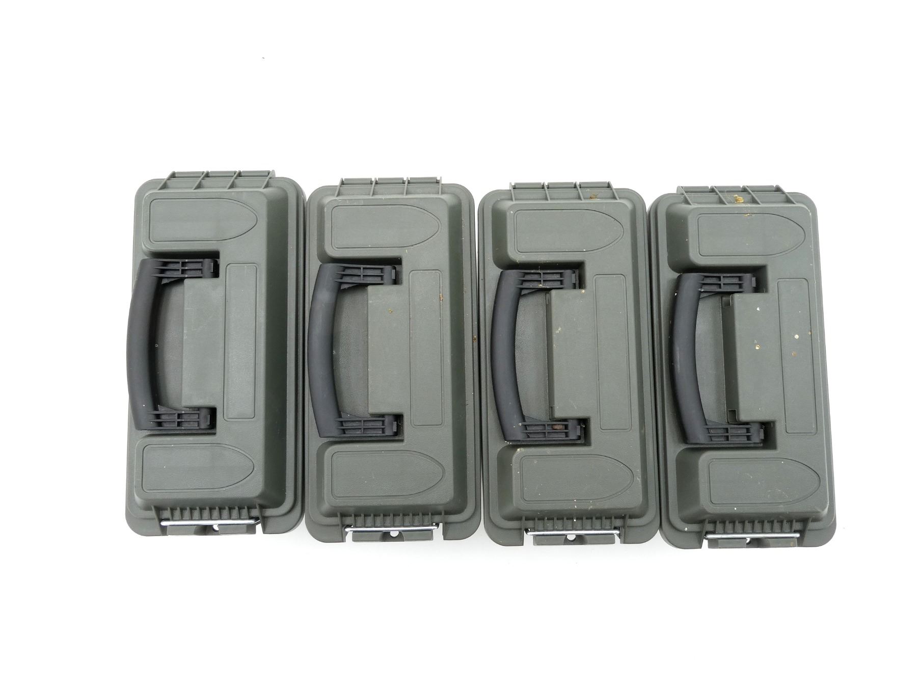 LOT INCLUDES; (4) GREEN POLYMER DRY AMMO / STORAGE BOXES, WITH CARRY HANDLE & LATCH, FITS .30 CAL., ETC. OVERALL LENGTH APPROX. 11.5" X 5" X 7.25". SEE PHOTOS.
