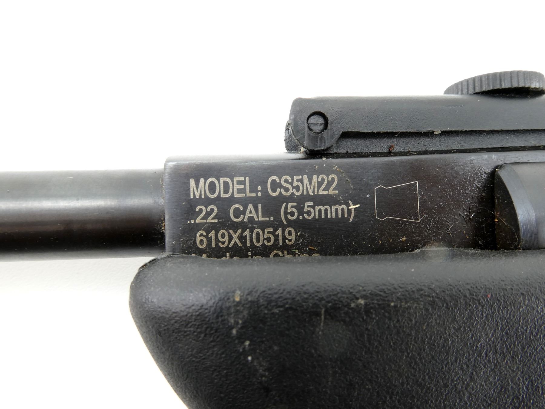 (1) .22 CAL. (5.5MM) PELLET, BREAK ACTION, STEEL & BLACK POLYMER CONSTRUCTION, SPRING POWERED, MODEL #: CS5M22, SERIAL #: 619X10519, NO COCKING ISSUES, NOT FULLY TESTED, SHOWS WEAR & TEAR / USE MARKS. SEE PHOTOS.