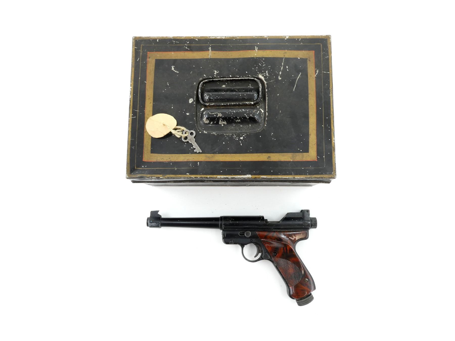 Lot 21013 CROSMAN MK I .22 CAL. CO2 PELLET PISTOL WITH LOCK AND KEY STORAGE CONTAINER LOT