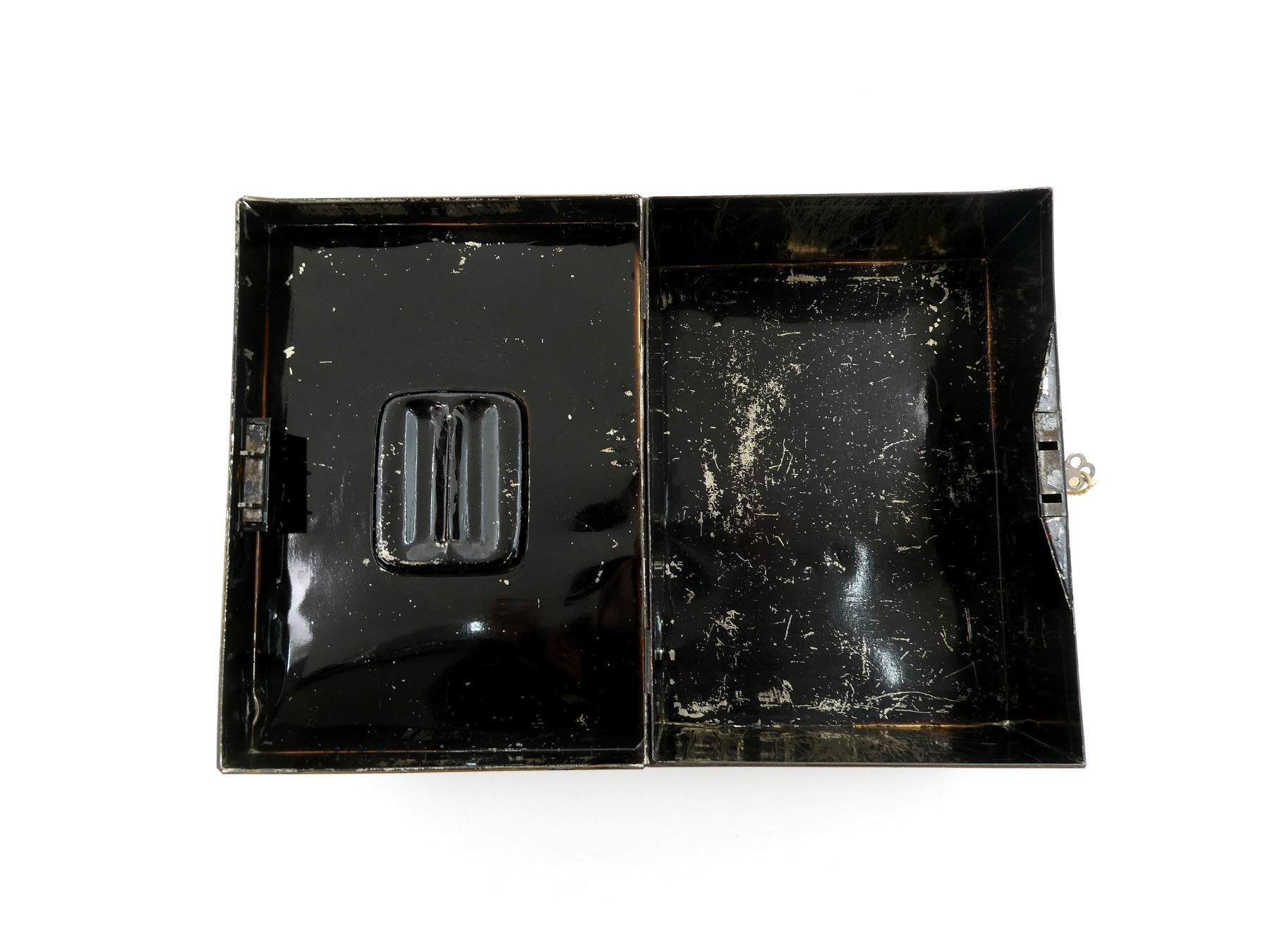 (1) CROSMAN MK I PELLET PISTOL, .22 CAL., CO2 POWERED, METAL & POLYMER CONSTRUCTION, RH THUMB REST, UNMARKED, UNTESTED & (1) UNKNOWN BLACK METAL STORAGE CONTAINER WITH LOCK AND KEY, OVERALL LENGTH APPROX. 11 1/8" X 8" X 5.25". SEE PHOTOS.