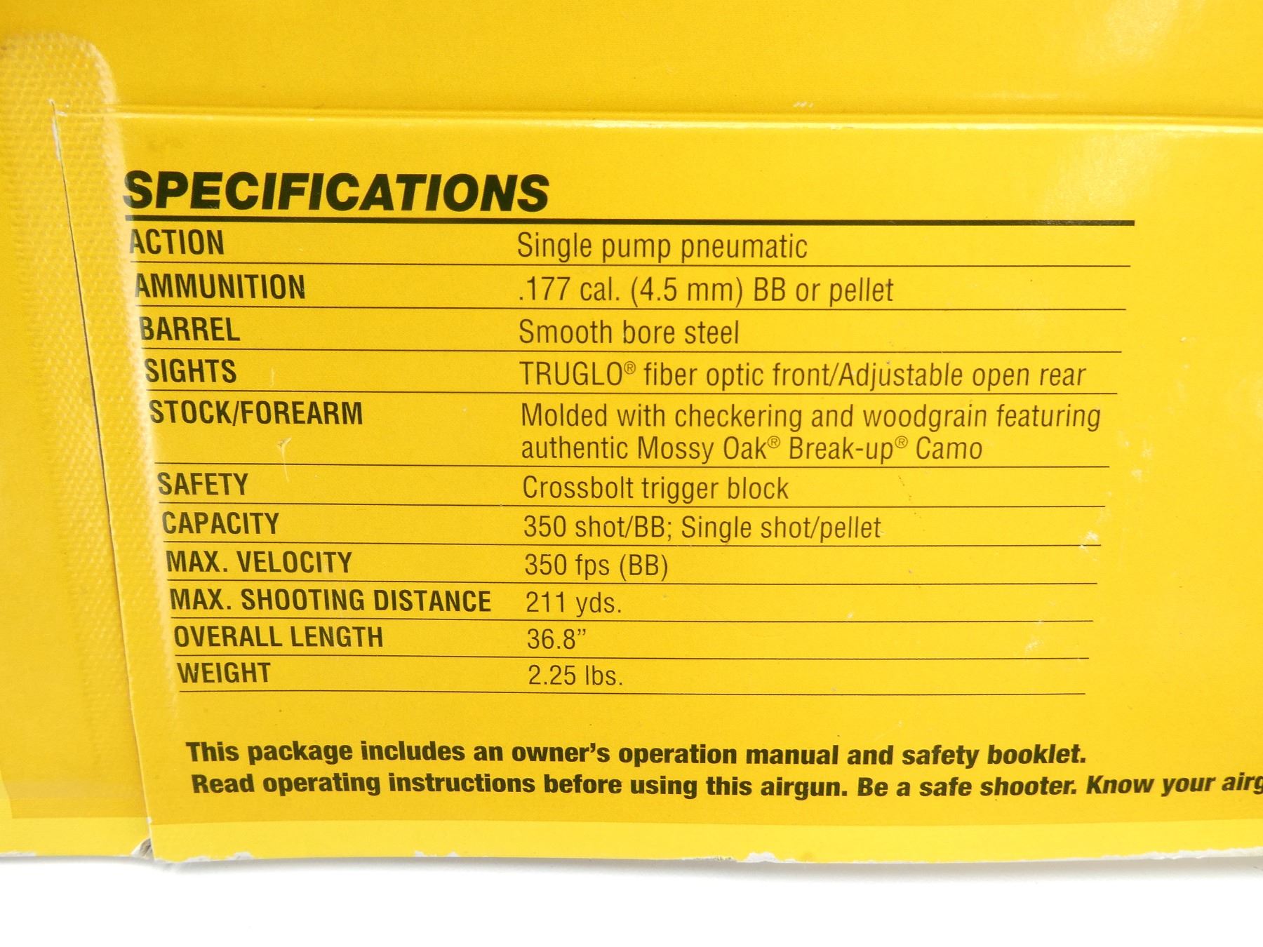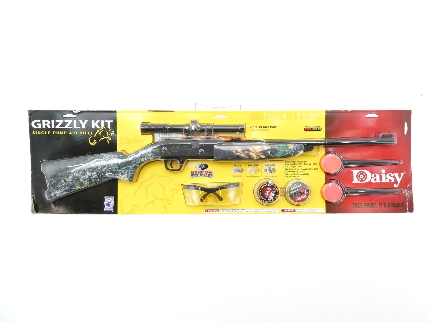 (1) .177 CAL., PUMP ACTION, FEATURING MOSSY OAK BREAK-UP CAMO, 4X15 AIR RIFLE SCOPE, SHATTERBLAST CLAY TARGETS WITH HOLDERS, AMBER TINTED SHOOTING GLASSES, 250 LEAD FREE PELLETS, 750 BB, 350 FPS, FOR AGES 10 OR OLDER, UNTESTED, NEW OLD STOCK, SEALED IN ORIGINAL PACKAGING. SEE PHOTOS.