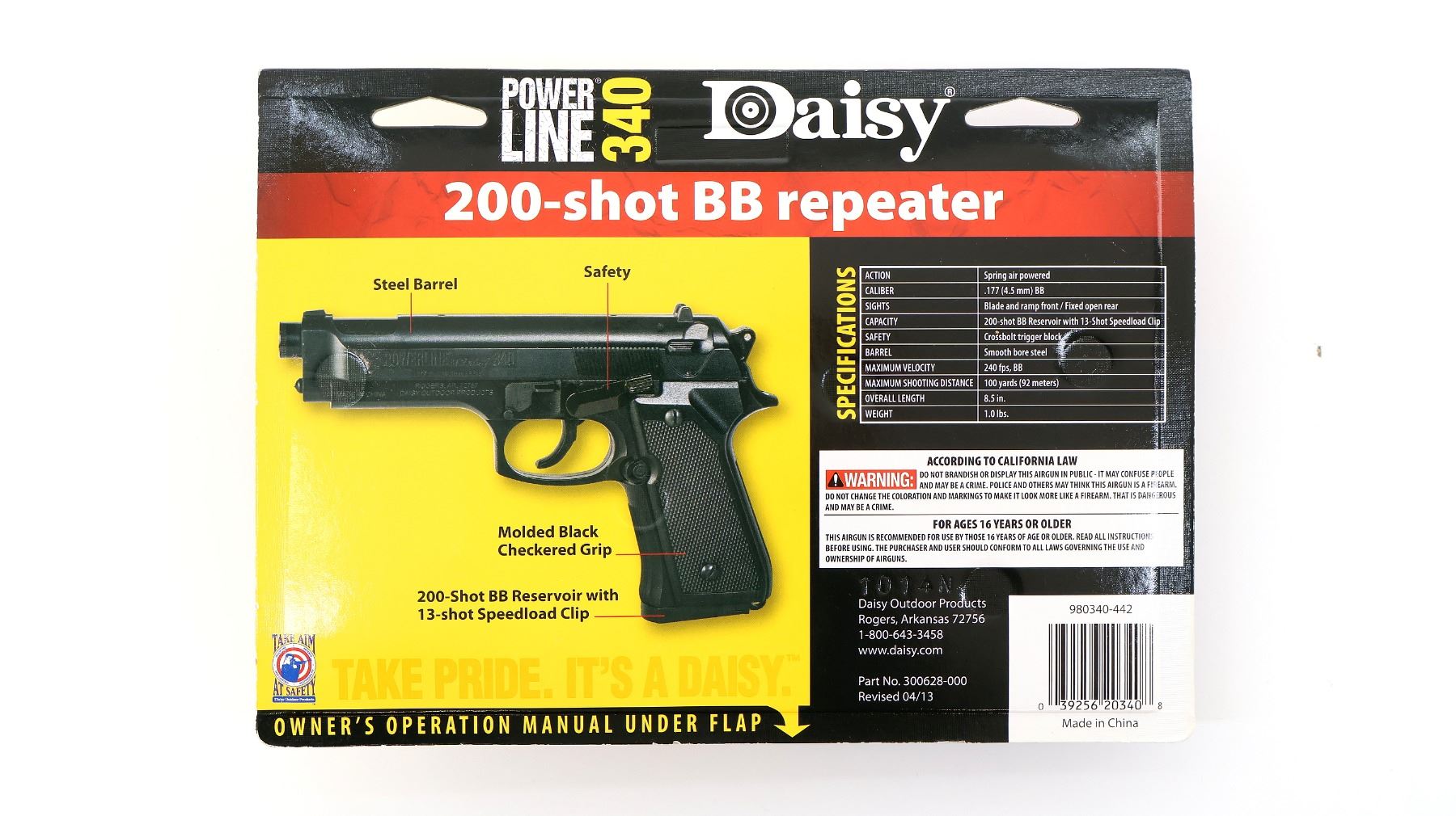 (1) .177 CAL. / 4.5MM BB, SPRING / AIR POWERED, APPROX. 240 FPS, 200-SHOT BB REPEATER WITH 13 SHOT SPEEDLOAD CLIP, BLACK POLYMER CONSTRUCTION, VARIOUS MARKINGS, UNTESTED, SEALED IN ORIGINAL PACKAGING. SEE PHOTOS.