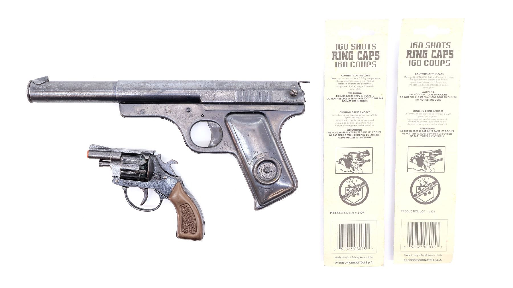 LOT INCLUDES; (1) .118 CAL., SPRING / AIR POWERED, MARKED "DAISY NO. 118 TARGETEER", ETC., DOES NOT FIRE, (1) TOY CAP GUN, DOUBLE ACTION REVOLVER, 8 SHOTS, MARKED "VICTORY", ETC., NO COCKING ISSUES, NOT FULLY TESTED & (2) 160 SHOTS RING CAPS, MAY NOT BE COMPLETE / PIECES MAY BE MISSING, SEALED IN ORIGINAL PACKAGING. SEE PHOTOS.