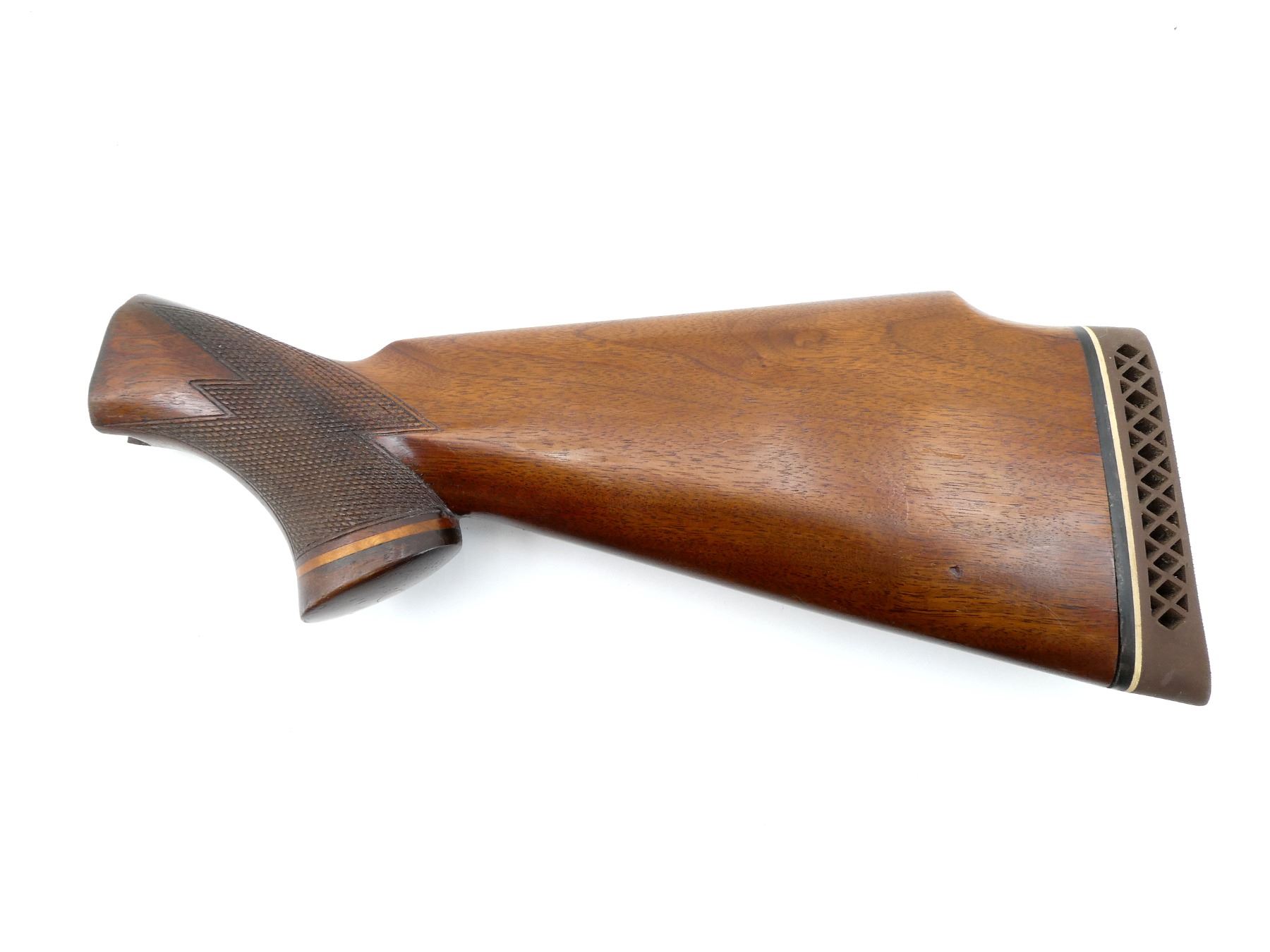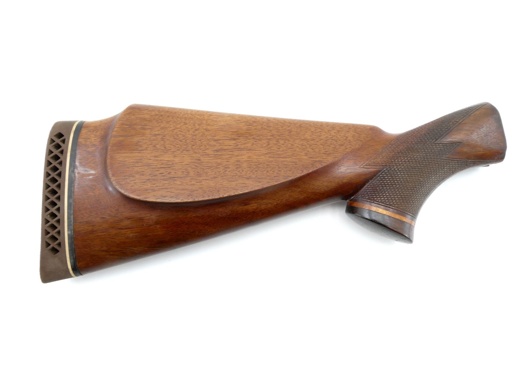(1) WOODEN BUTT STOCK, CHECKERED, UNMARKED, WITH LH CHEEK REST & PACHMAYR RECOIL PAD, OVERALL LENGTH APPROX. 13.25". MAY REQUIRE FITTING. SEE PHOTOS.