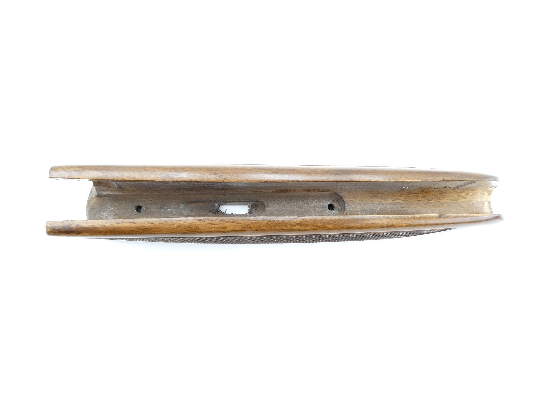 (1) WOODEN FOREND, CHECKERED, UNMARKED, CONSIGNOR STATES "O&U", CHANNEL WIDTH APPROX. 18MM, OVERALL LENGTH APPROX. 9 3/8". MAY REQUIRE FITTING. SEE PHOTOS.