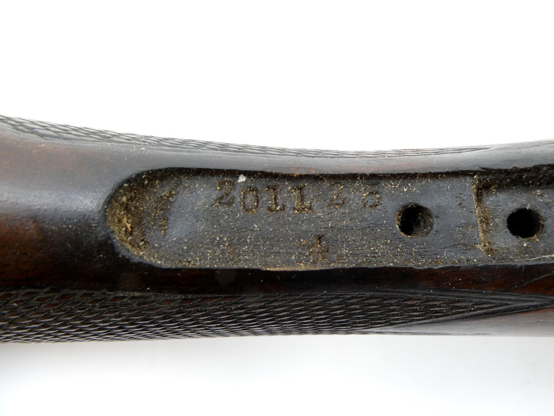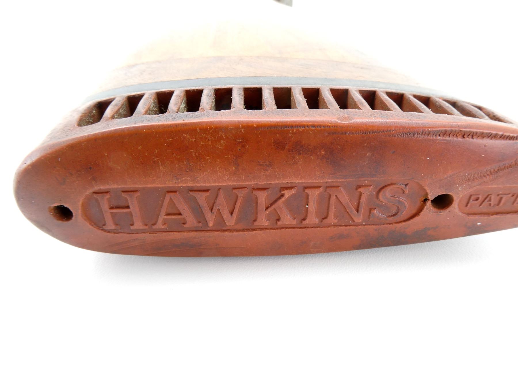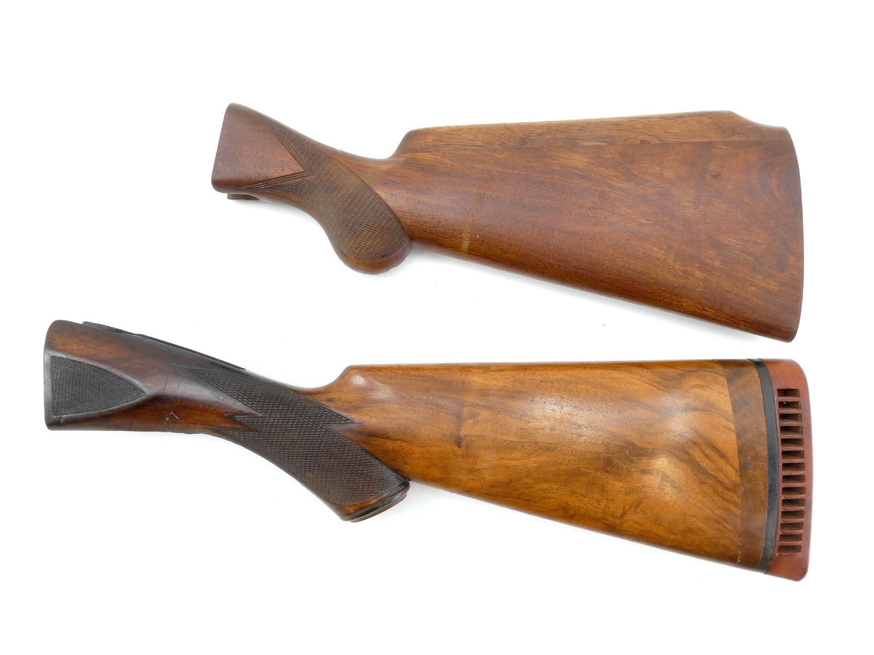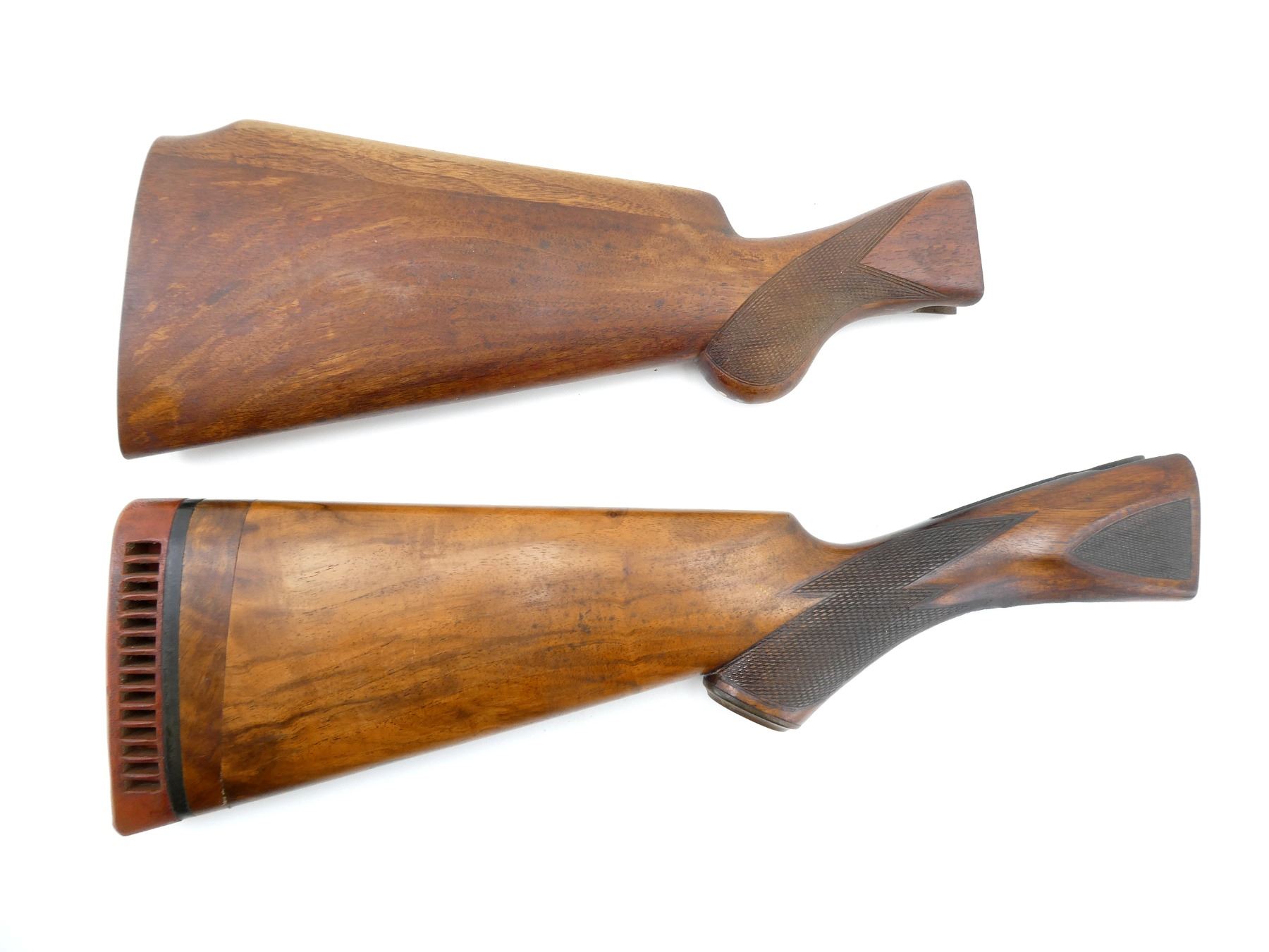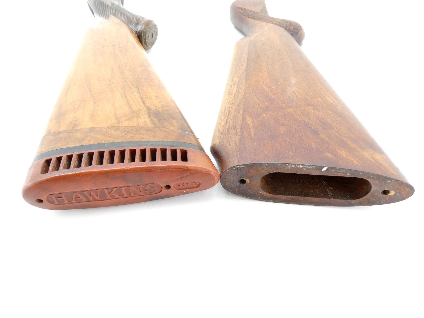 LOT INCLUDES; (1) WOODEN BUTT STOCK, CHECKERED, UNMARKED, WITH MISSING BUTT PLATE, OVERALL LENGTH APPROX. 13" & (1) WOODEN BUTT STOCK, CHECKERED, GRIP CAP MARKED "PARKER BROS.", WITH HAWKINS RECOIL PAD, OVERALL LENGTH APPROX. 16". MAY REQUIRE FITTING. SEE PHOTOS.