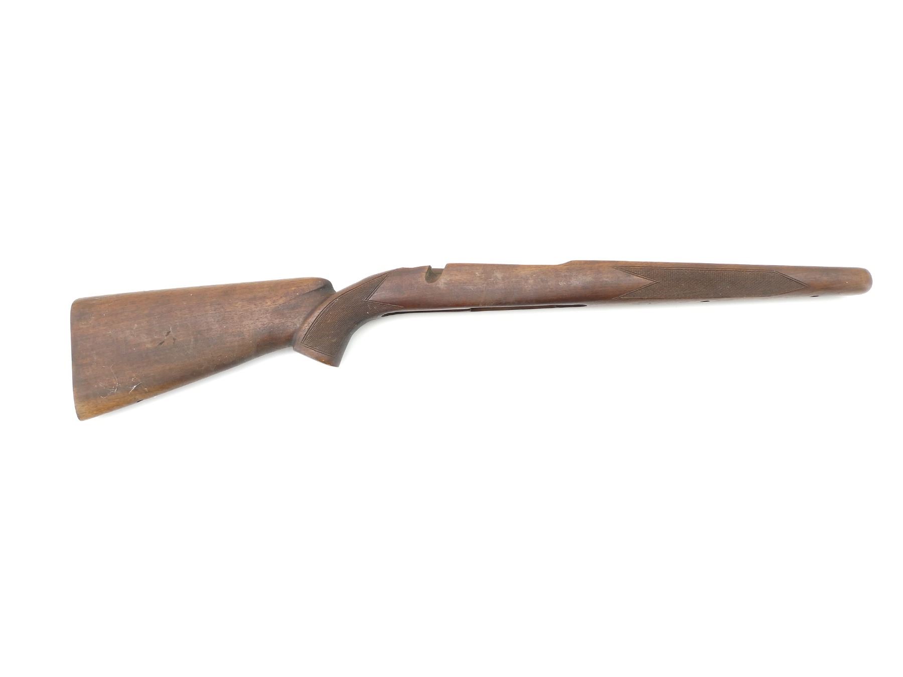 (1) WOODEN STOCK, CHECKERED, UNMARKED, WITH MISSING BUTT PLATE, OVERALL LENGTH APPROX. 32". MAY REQUIRE FITTING. SEE PHOTOS.