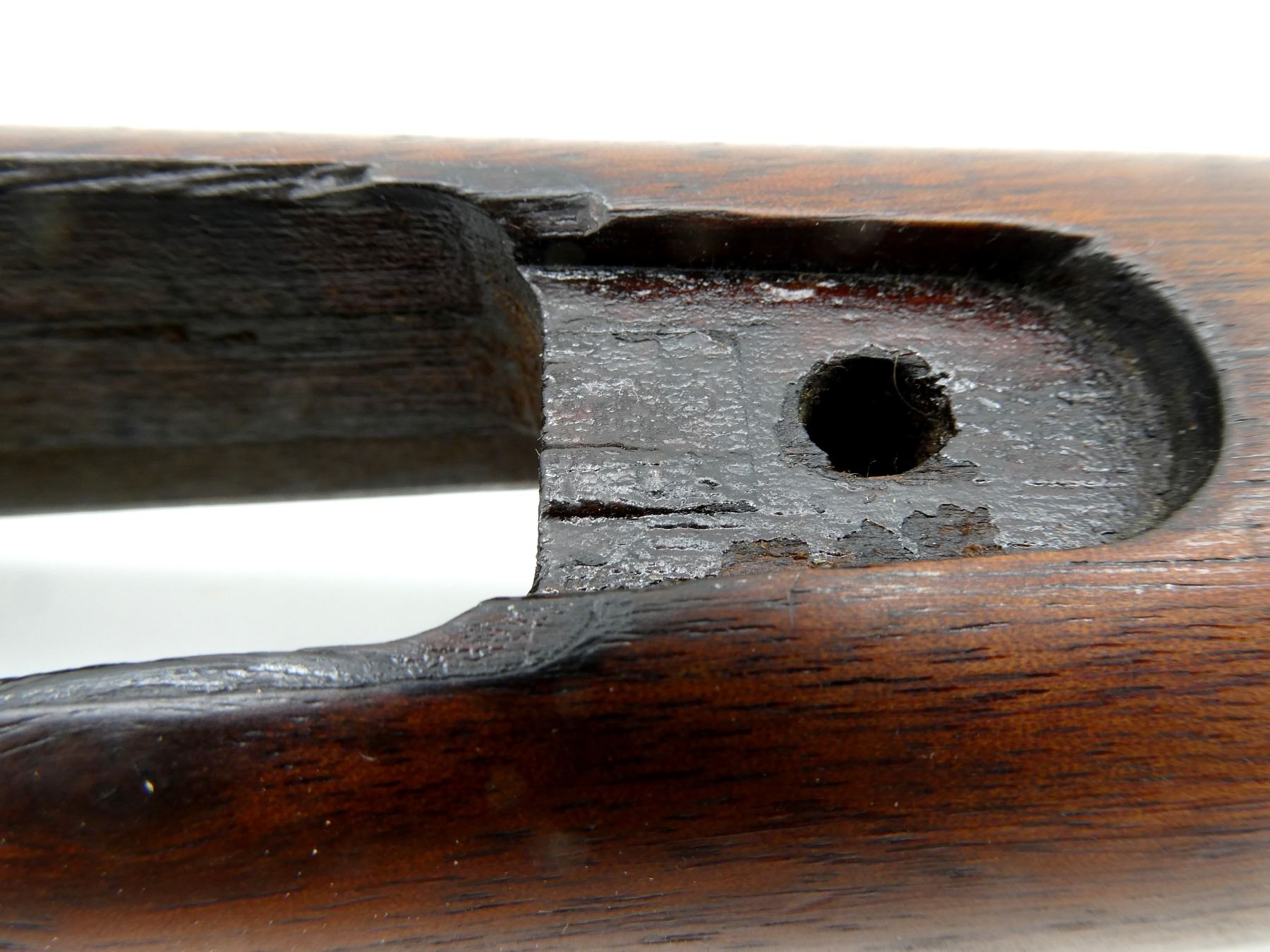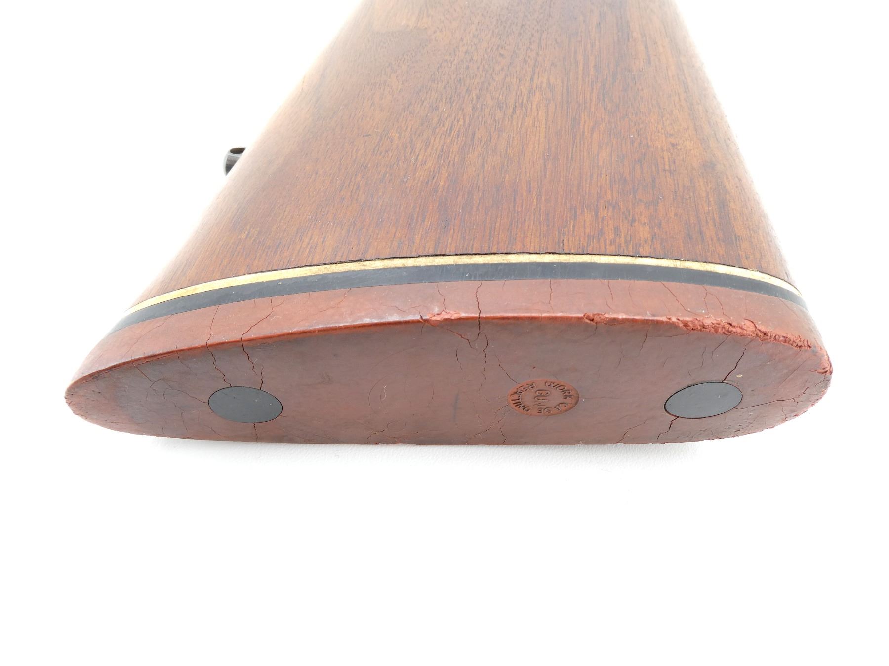 (1) WOODEN STOCK, CHECKERED, UNMARKED, OVERALL LENGTH APPROX. 32". MAY REQUIRE FITTING. SEE PHOTOS.