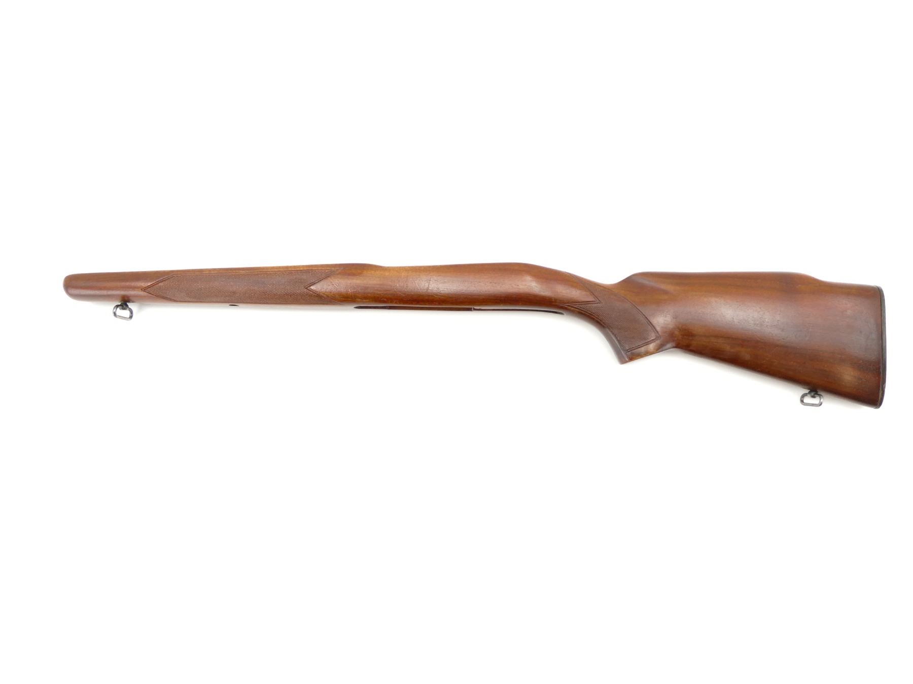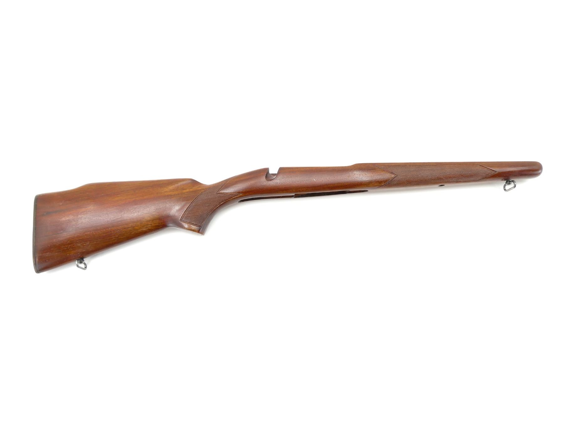 (1) WOODEN STOCK, CHECKERED, UNMARKED, WITH SLING SWIVELS, OVERALL LENGTH APPROX. 32.25". MAY REQUIRE FITTING. SEE PHOTOS.