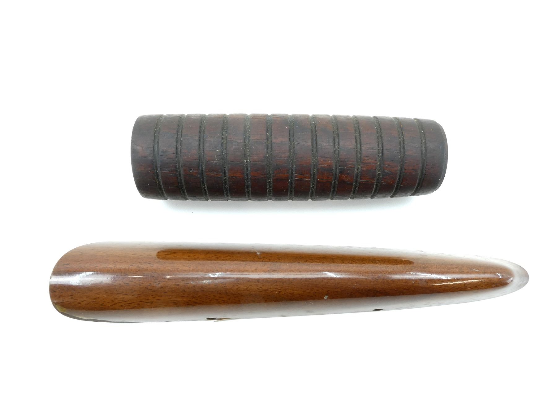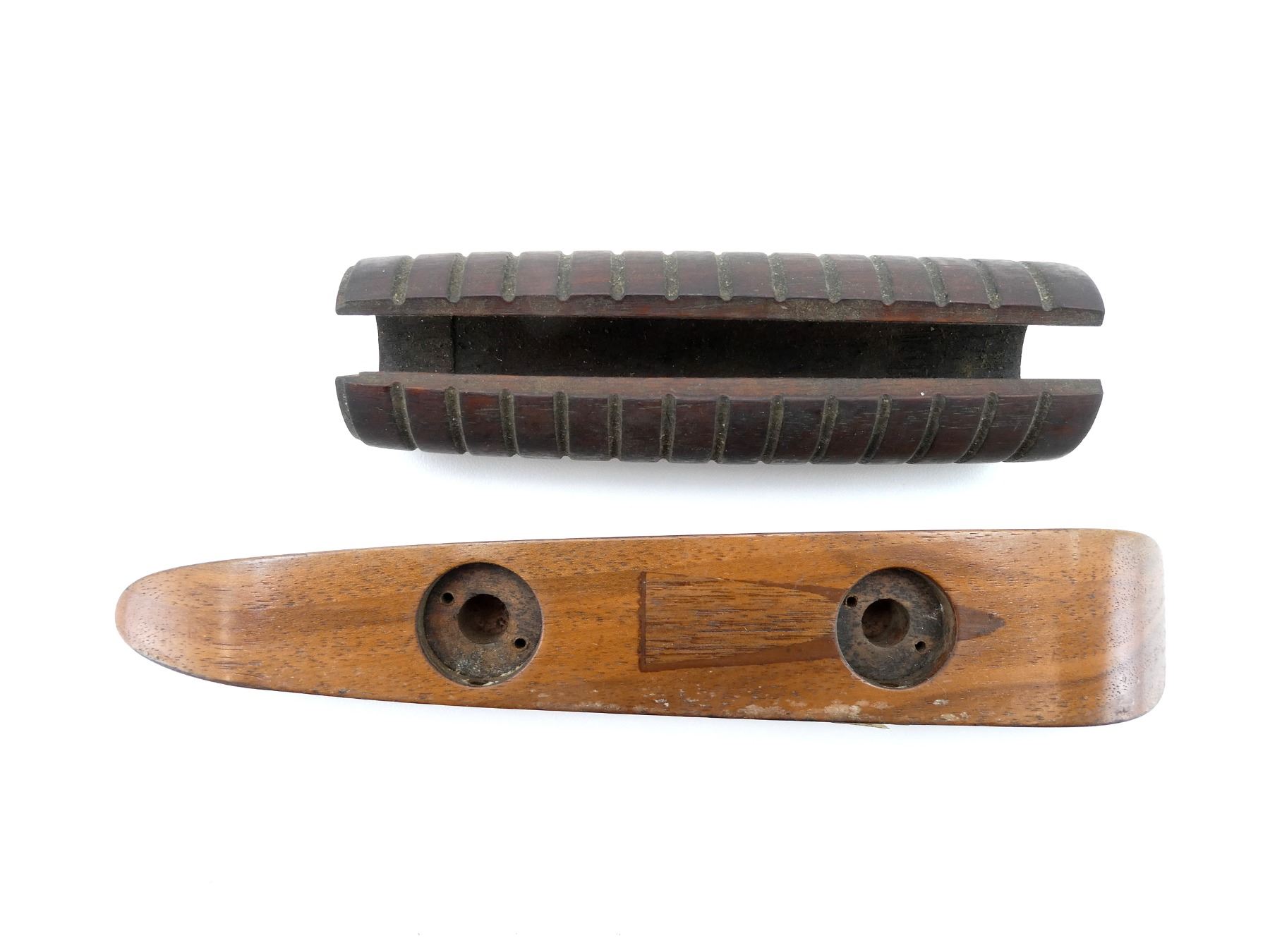 LOT INCLUDES; (1) UNKNOWN WOODEN SHOTGUN FOREND, GROOVED, UNMARKED, MAY HAVE SMALL CRACKS & CHIPS, OVERALL LENGTH APPROX. 5 1/8" & (1) UNKNOWN WOODEN RIFLE COMB, UNMARKED, MAY HAVE SMALL CRACKS & CHIPS, OVERALL LENGTH APPROX. 8.25". MAY REQUIRE FITTING. SEE PHOTOS.