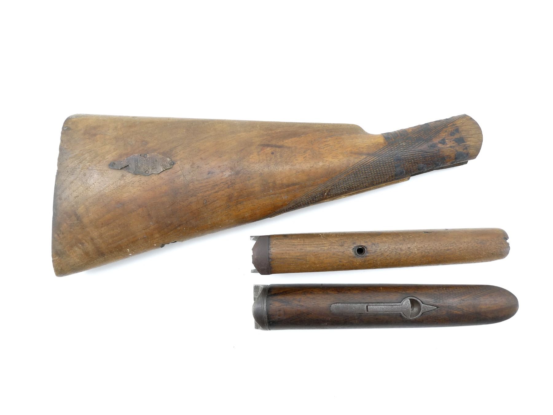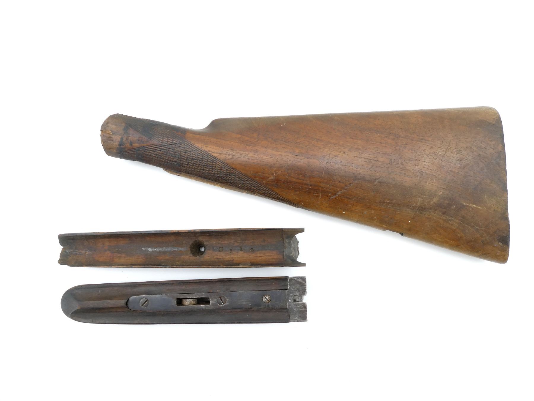LOT INCLUDES; (1) UNKNOWN WOODEN BUTT STOCK, CHECKERED, UNMARKED, WITH DECAL & MISSING BUTT PLATE, MAY HAVE SMALL CRACKS & CHIPS, OVERALL LENGTH APPROX. 14", (1) UNKNOWN WOODEN SINGLE SHOT SHOTGUN FOREND, SMOOTH, MARKINGS UNCLEAR, MAY HAVE SMALL CRACKS & CHIPS, OVERALL LENGTH APPROX. 8 1/8" & (1) UNKNOWN WOODEN SXS SHOTGUN FOREND, CHECKERED, UNMARKED, MAY HAVE SMALL CRACKS & CHIPS, OVERALL LENGTH APPROX. 8 3/8". MAY REQUIRE FITTING. SEE PHOTOS.