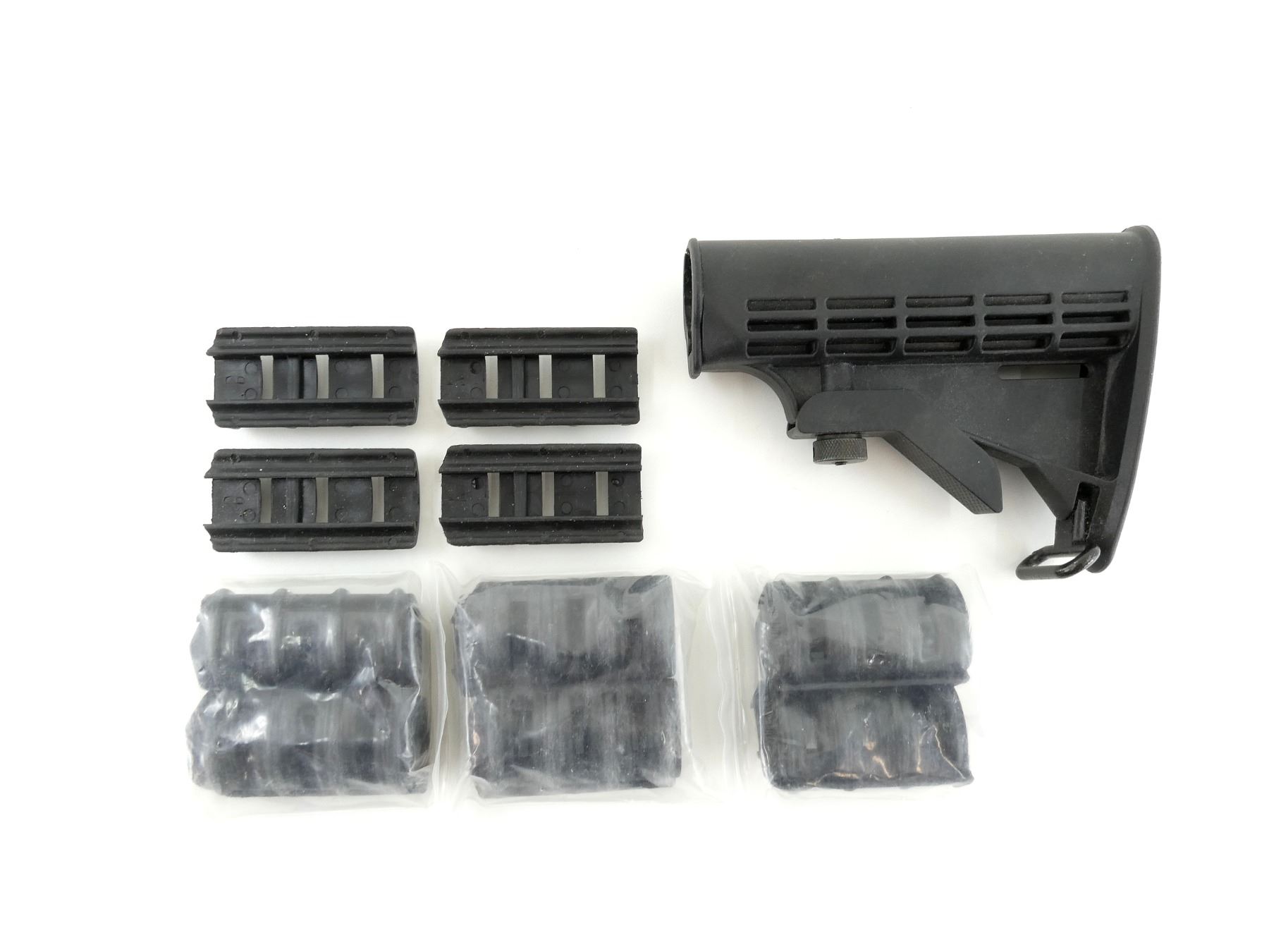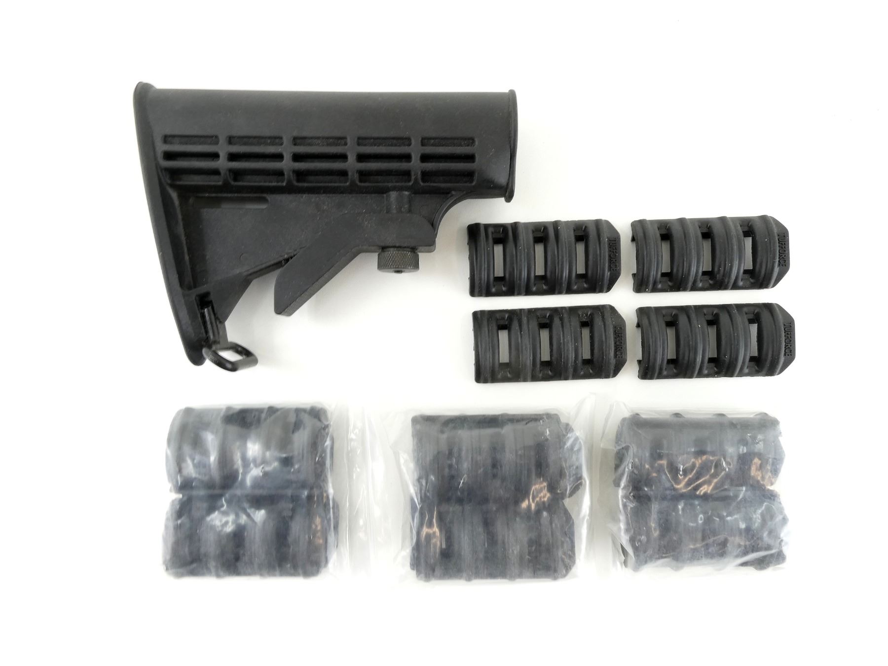 LOT INCLUDES; (1) POLYMER BUTT STOCK, UNMARKED, OVERALL LENGTH APPROX. 6.5" & (4) PACKS OF TUFFORCE RUBBER RAIL COVERS, APPEARS NEW OLD STOCK. MAY REQUIRE FITTING. SEE PHOTOS.