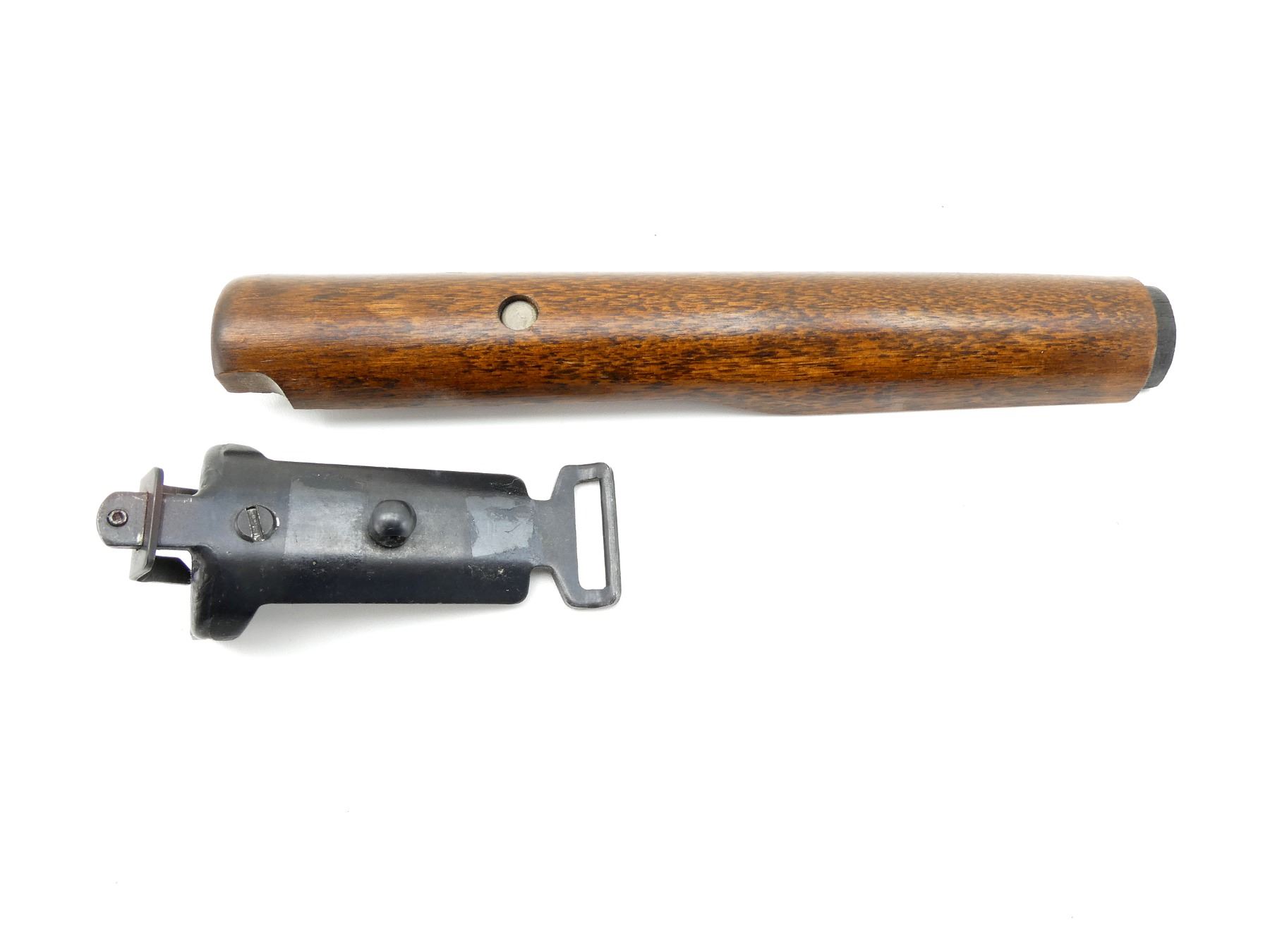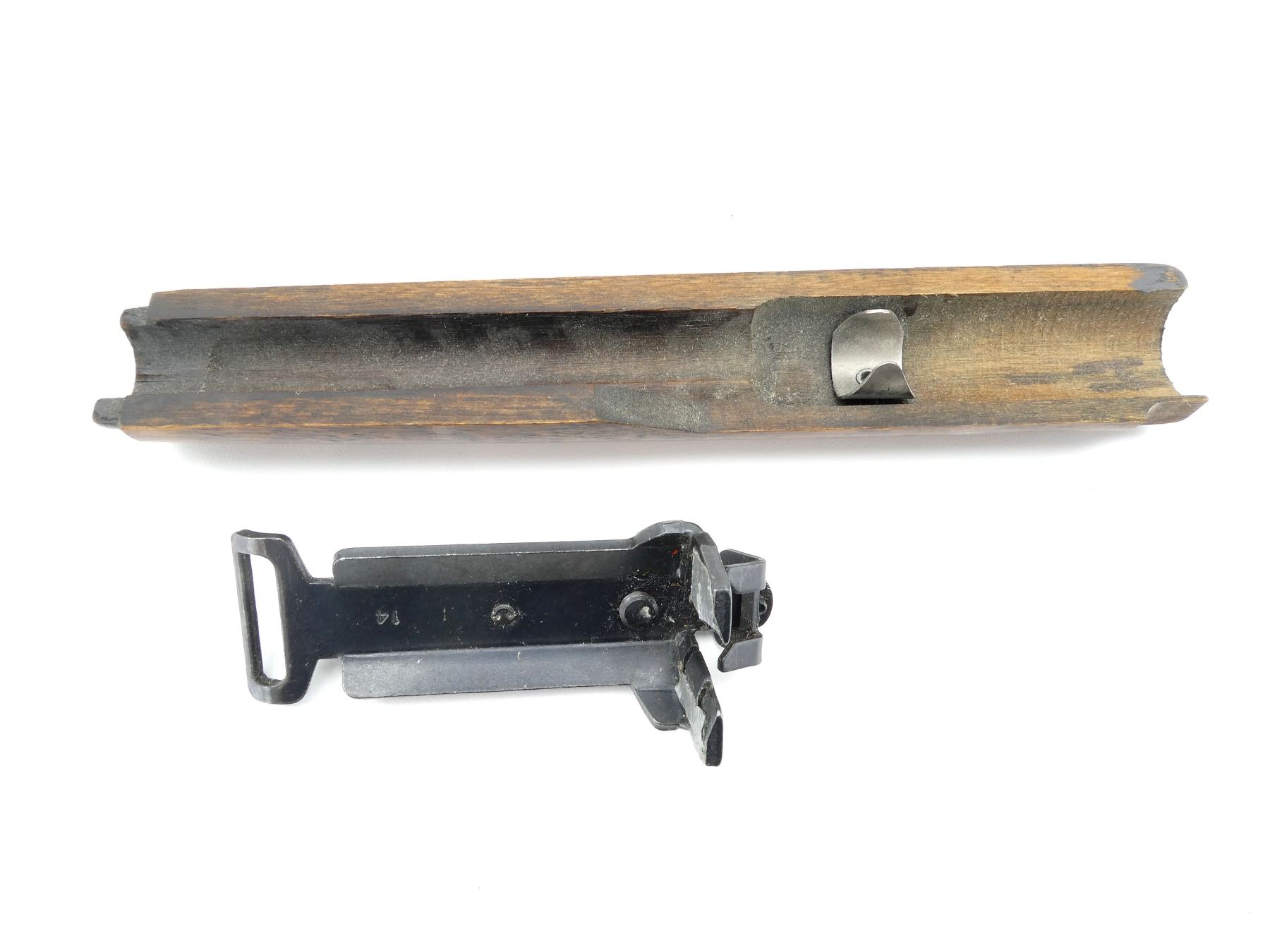 (1) WOODEN FOREND, SMOOTH, UNMARKED, MAY HAVE SMALL CRACKS & CHIPS, OVERALL LENGTH APPROX. 9 1/8" & (1) UNKNOWN BIPOD MOUNT, MARKED "14", OVERALL LENGTH APPROX. 4.25". MAY REQUIRE FITTING. SEE PHOTOS.