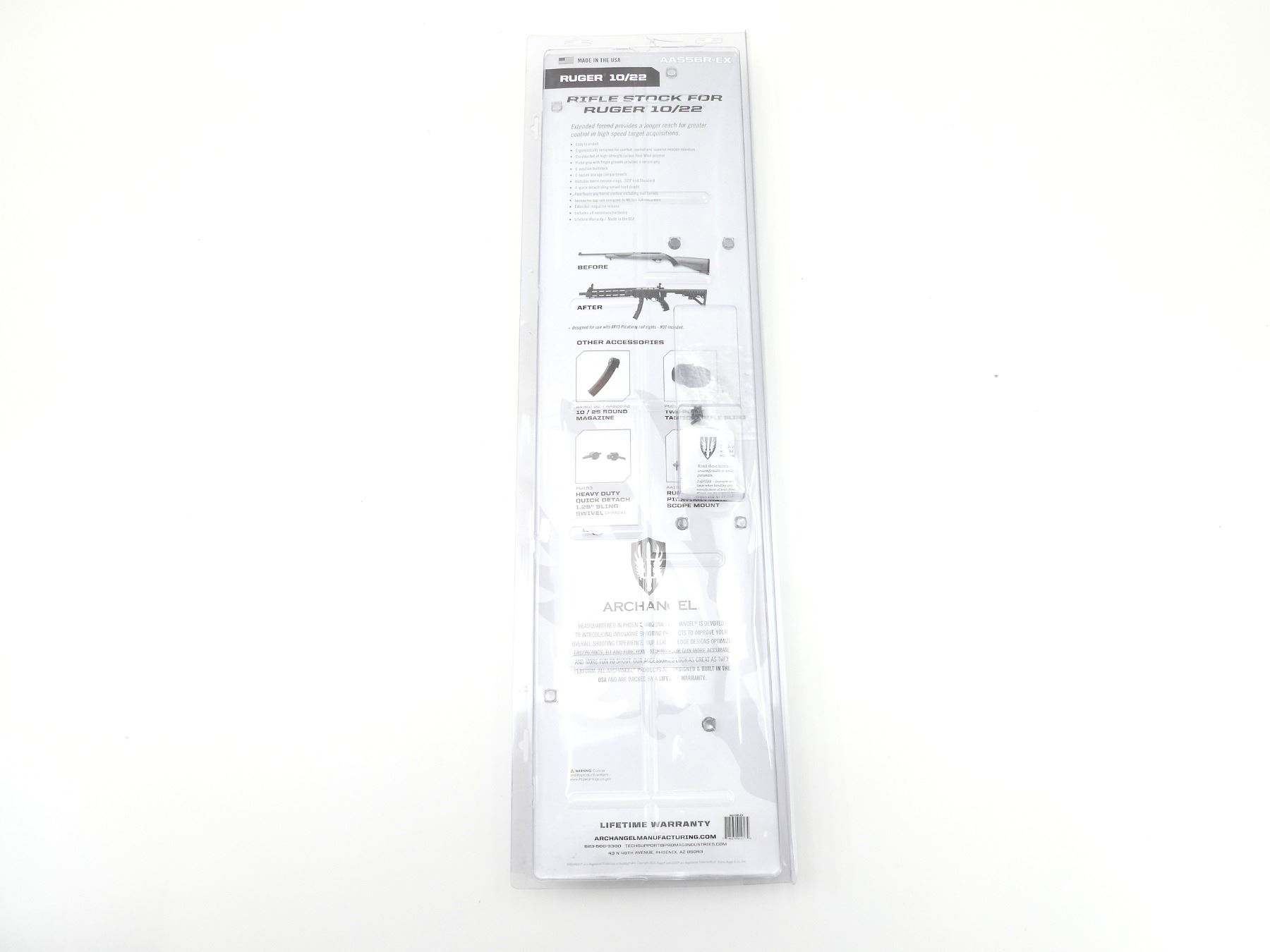 (1) BLACK POLYMER CONSTRUCTION, MARKED "ARCHANGEL 5.56", FITS RUGER 10/22, OVERALL LENGTH APPROX. 30.25", APPEARS NEW OLD STOCK, IN ORIGINAL PACKAGING. MAY REQUIRE FITTING. SEE PHOTOS.