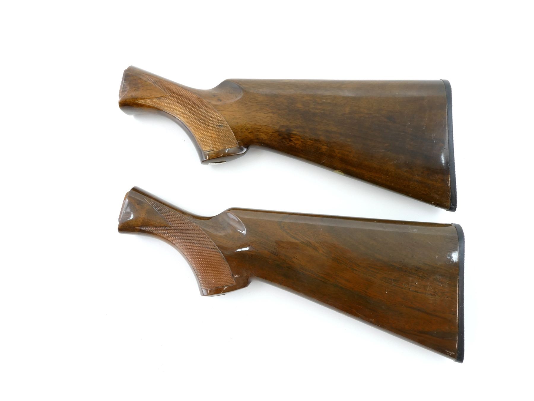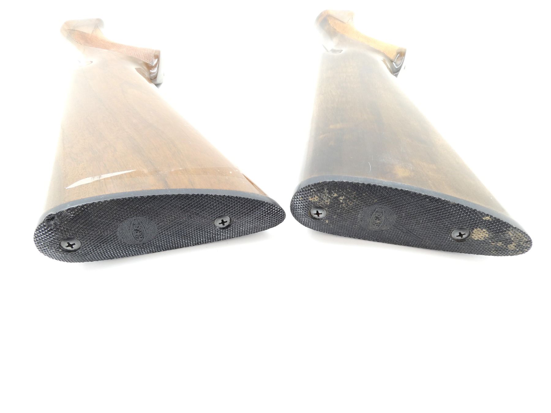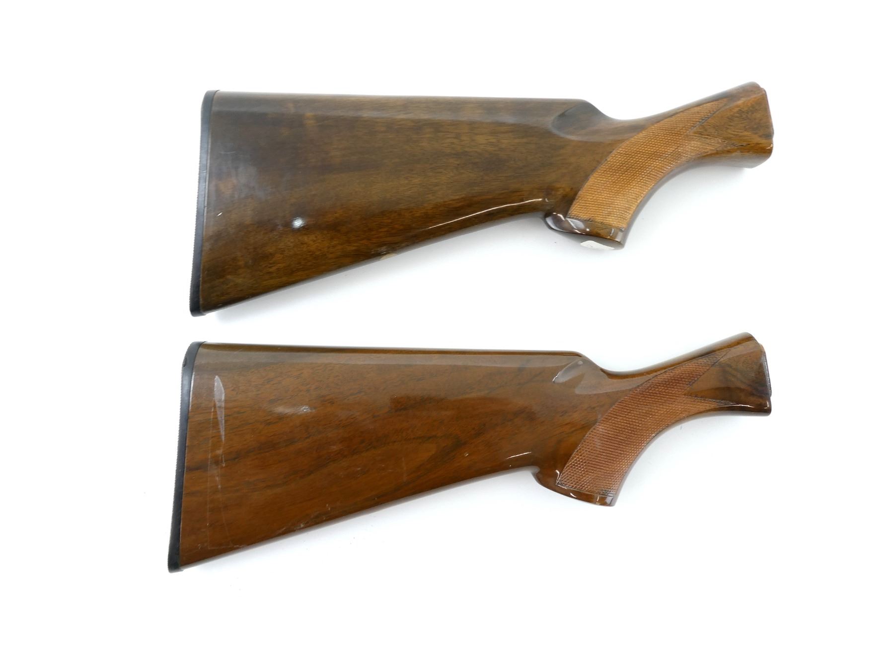 LOT INCLUDES; (2) WOODEN BUTT STOCKS, CHECKERED, MARKED: "KFC", CHECKERED BLACK POLYMER BUTT PLATE, MAY HAVE SMALL CRACKS & CHIPS, OVERALL LENGTH APPROX. 13.25". MAY REQUIRE FITTING. SEE PHOTOS.