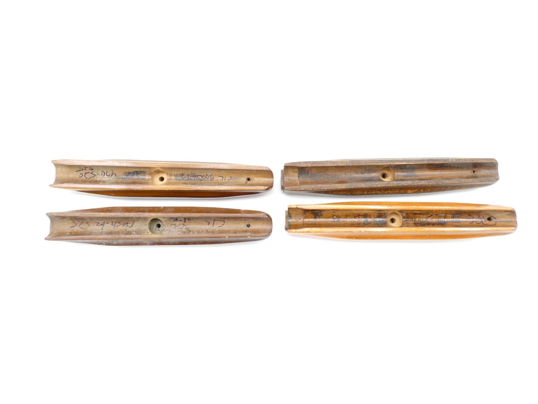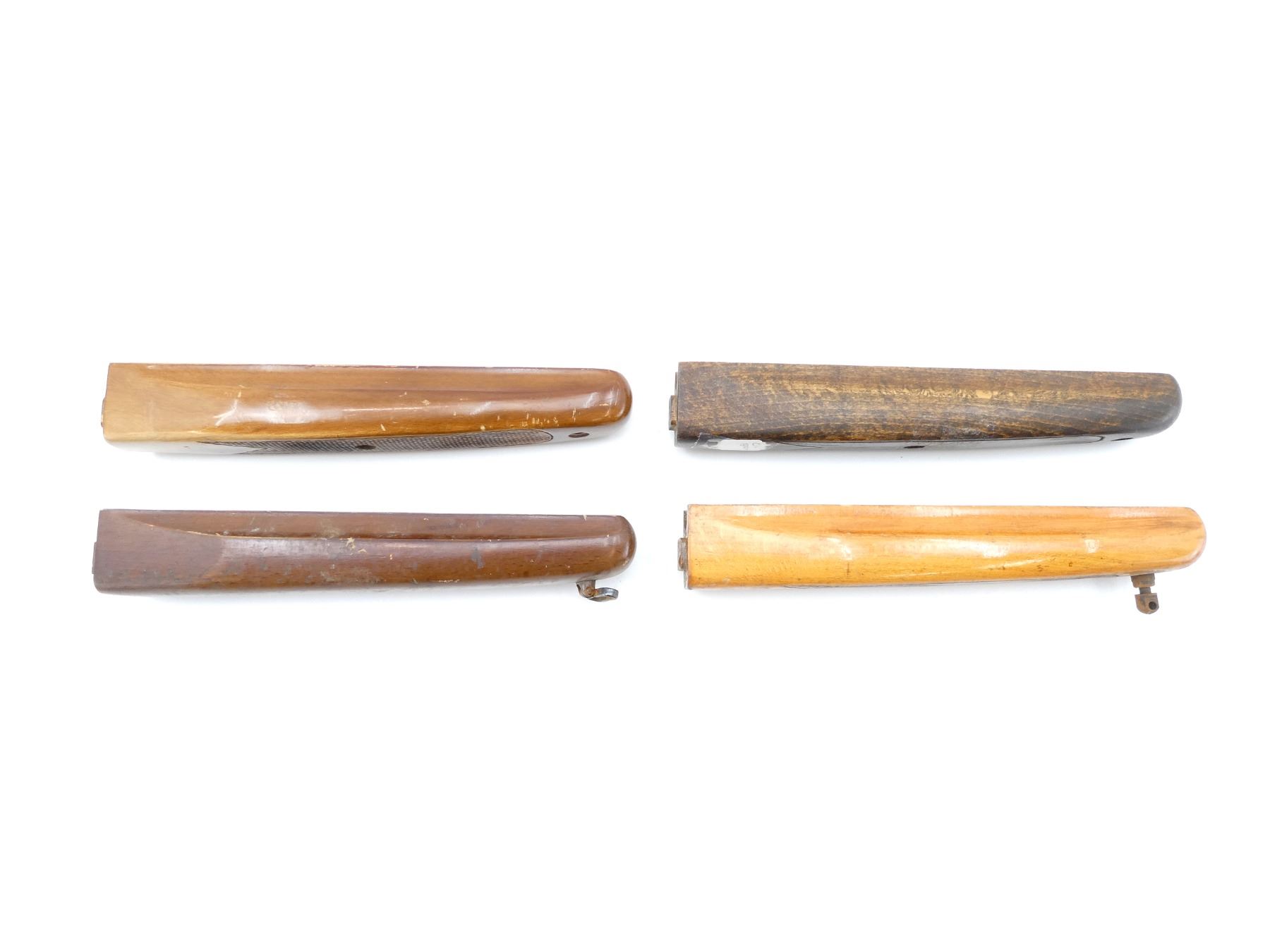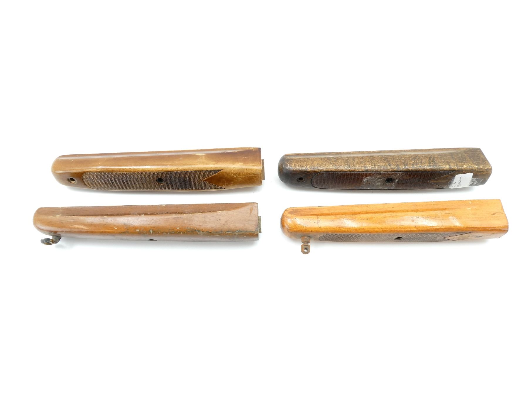 LOT INCLUDES; (4) WOODEN FORENDS, THREE CHECKERED / ONE SMOOTH, MAY HAVE SMALL CRACKS & CHIPS, OVERALL LENGTH APPROX. 9.5". MAY REQUIRE FITTING. SEE PHOTOS.