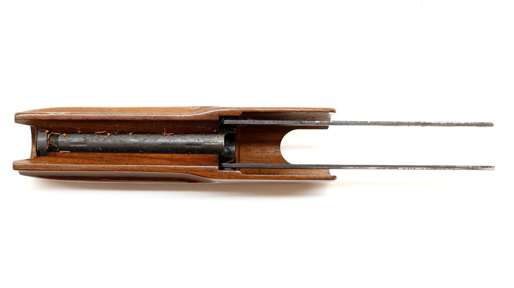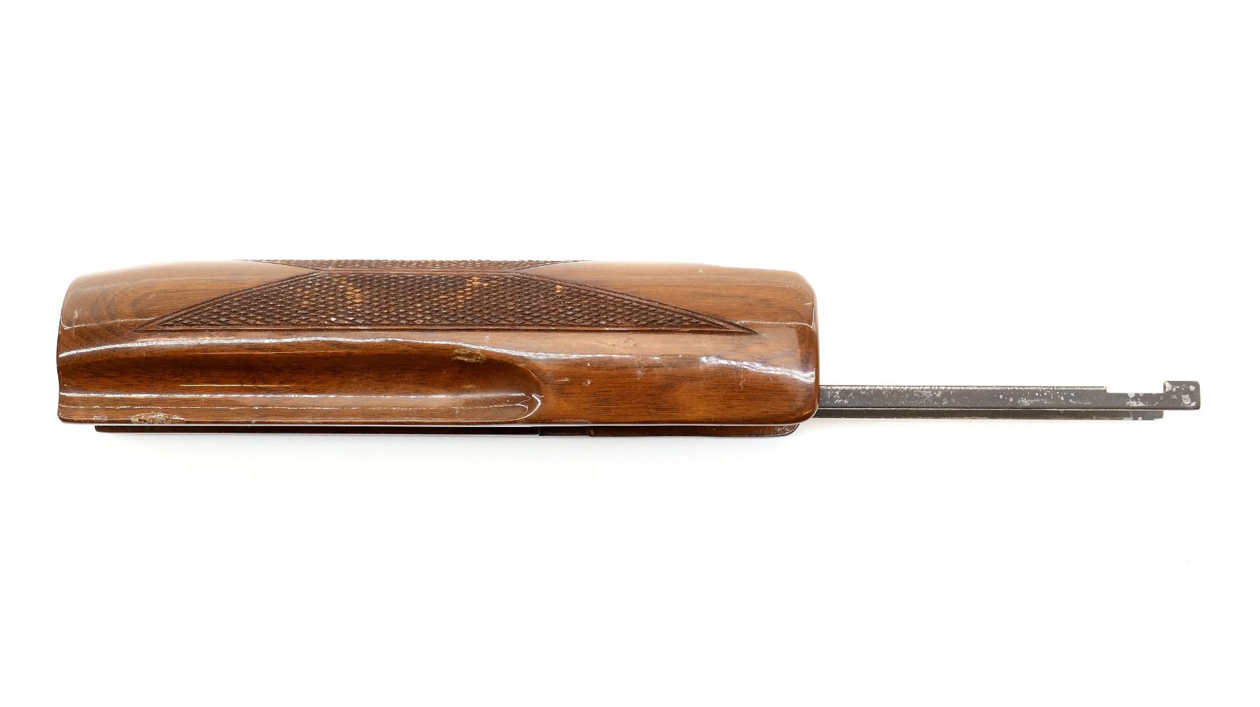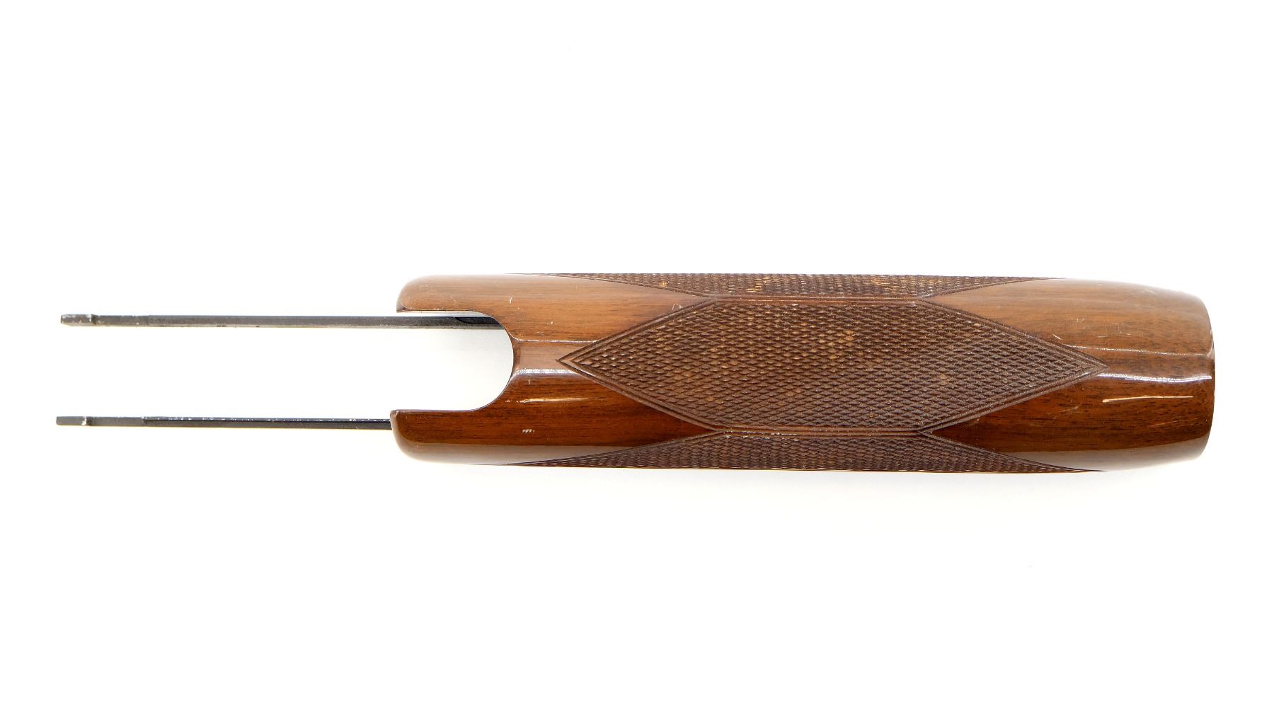 (1) WOODEN FOREND, CHECKERED, UNMARKED, WITH ACTION BARS, MAY HAVE SMALL CRACKS & CHIPS, OVERALL LENGTH APPROX. 12". MAY REQUIRE FITTING. SEE PHOTOS.