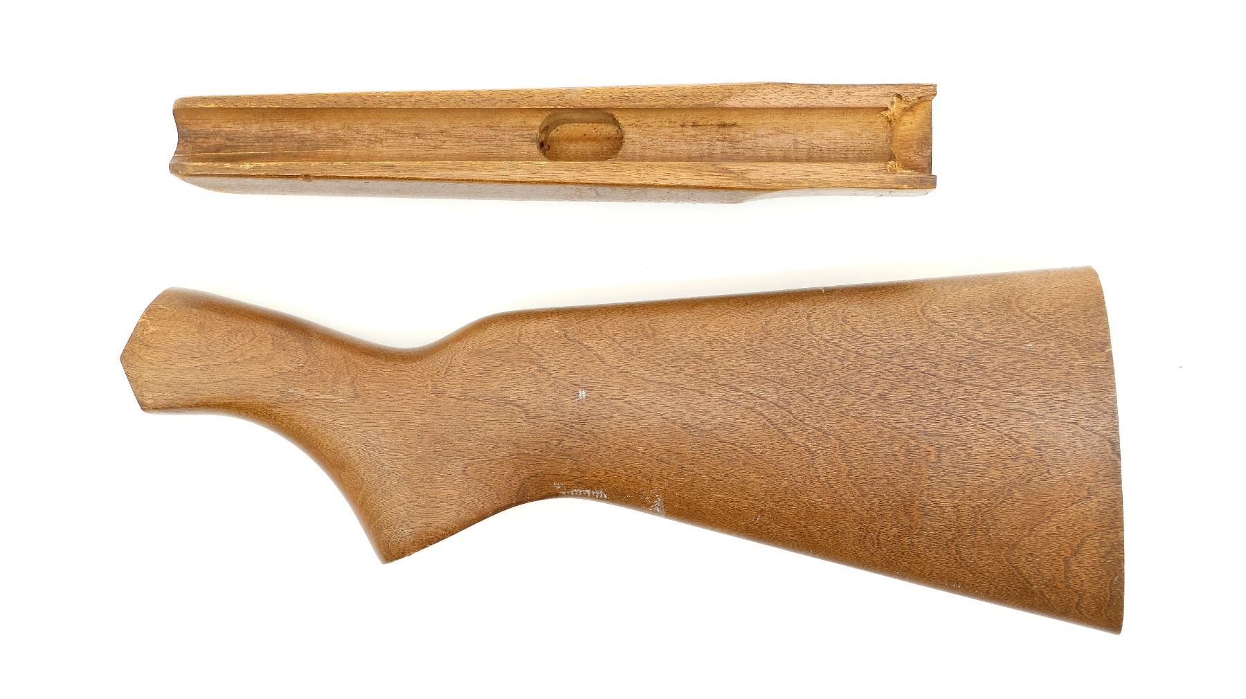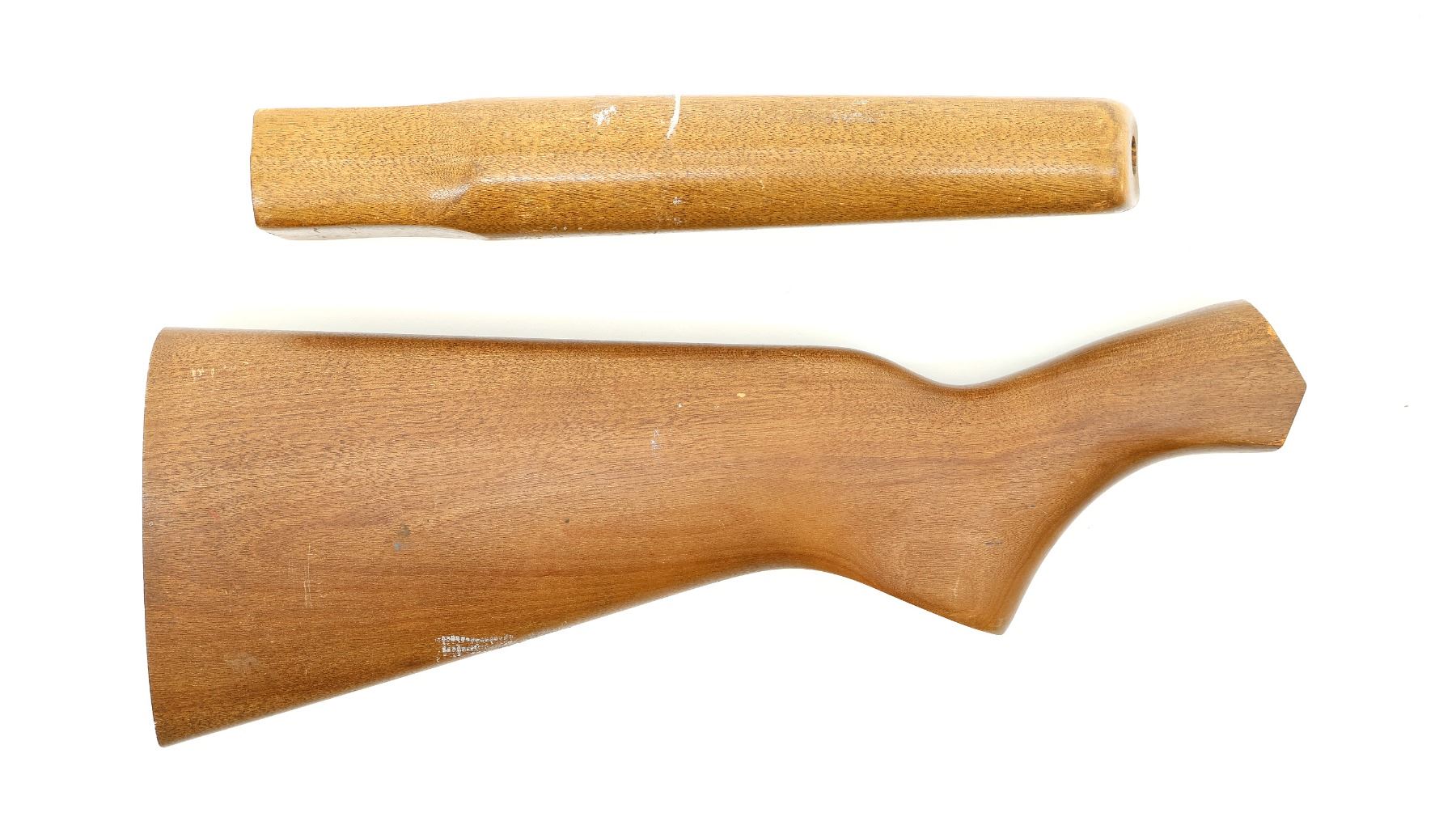 LOT INCLUDES; (1) WOODEN BUTT STOCK, SMOOTH, UNMARKED, WITH RECOIL PAD, OVERALL LENGTH APPROX. 13", SHOWS WEAR / TEAR FROM USE & (1) WOODEN FOREND, SMOOTH, UNMARKED, MAY HAVE SMALL CRACKS & CHIPS, OVERALL LENGTH APPROX. 10", SHOWS WEAR / TEAR FROM USE. MAY REQUIRE FITTING. SEE PHOTOS.
