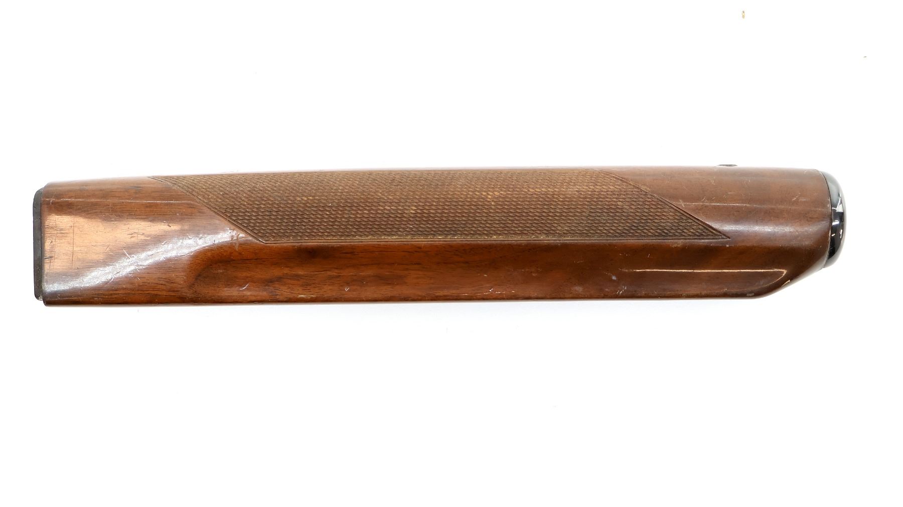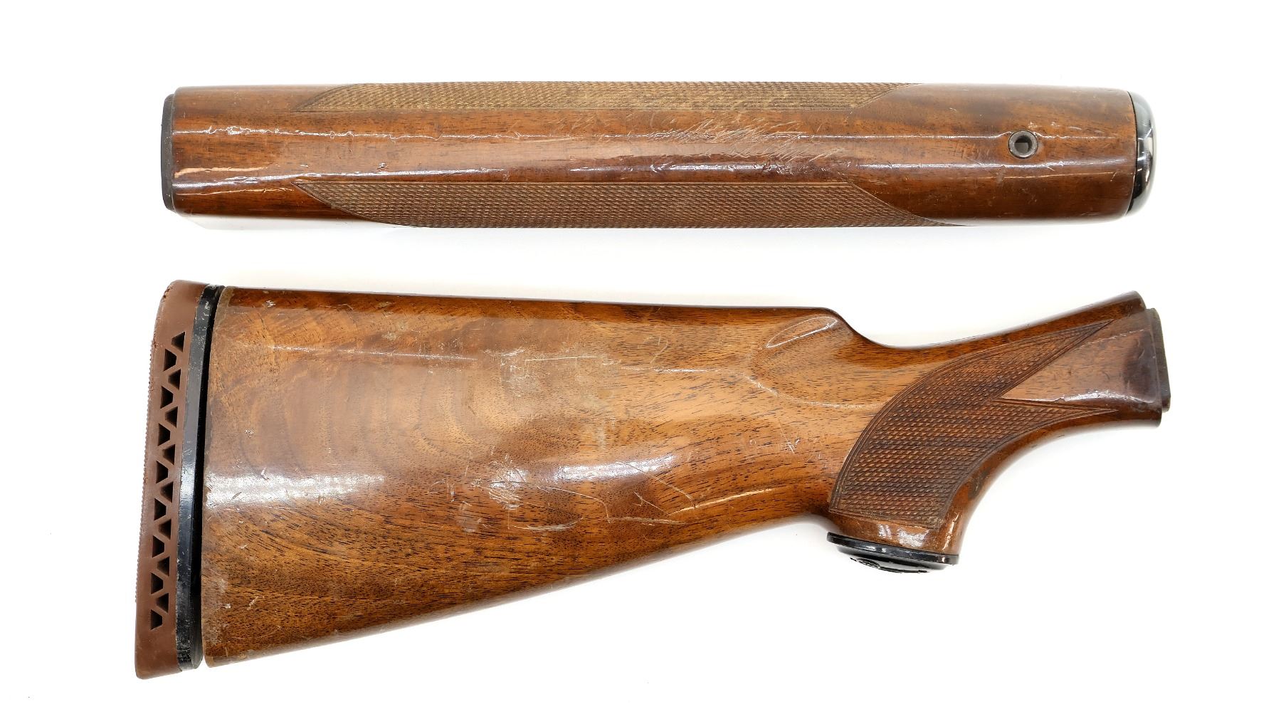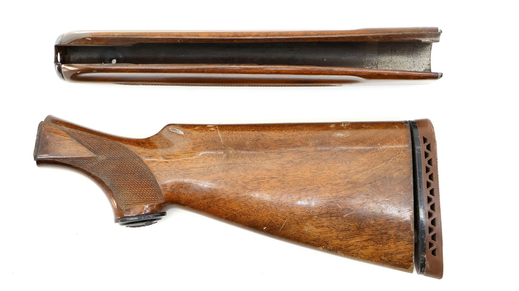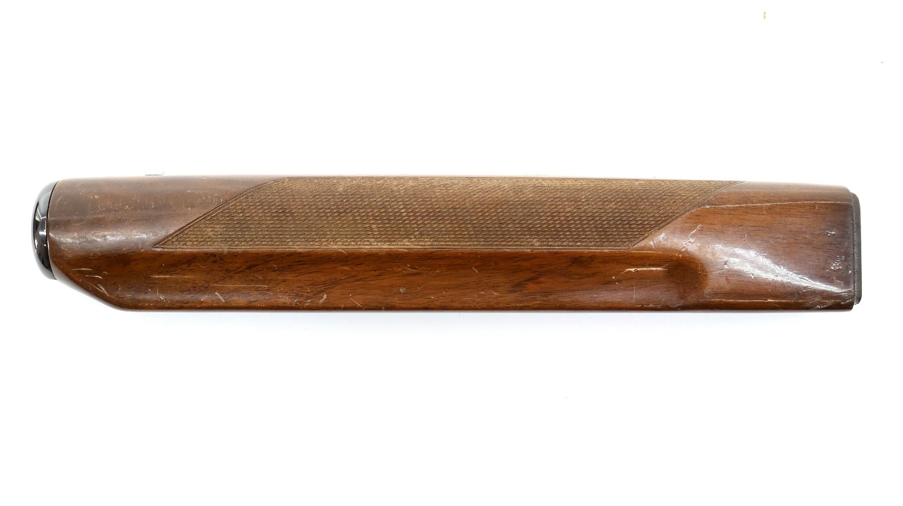 LOT INCLUDES; (1) WOODEN BUTT STOCK, CHECKERED, UNMARKED, OVERALL LENGTH APPROX. 13", SHOWS WEAR / TEAR FROM USE & (1) WOODEN FOREND, CHECKERED, UNMARKED, MAY HAVE SMALL CRACKS & CHIPS, OVERALL LENGTH APPROX. 12.5", SHOWS WEAR / TEAR FROM USE. MAY REQUIRE FITTING. SEE PHOTOS.