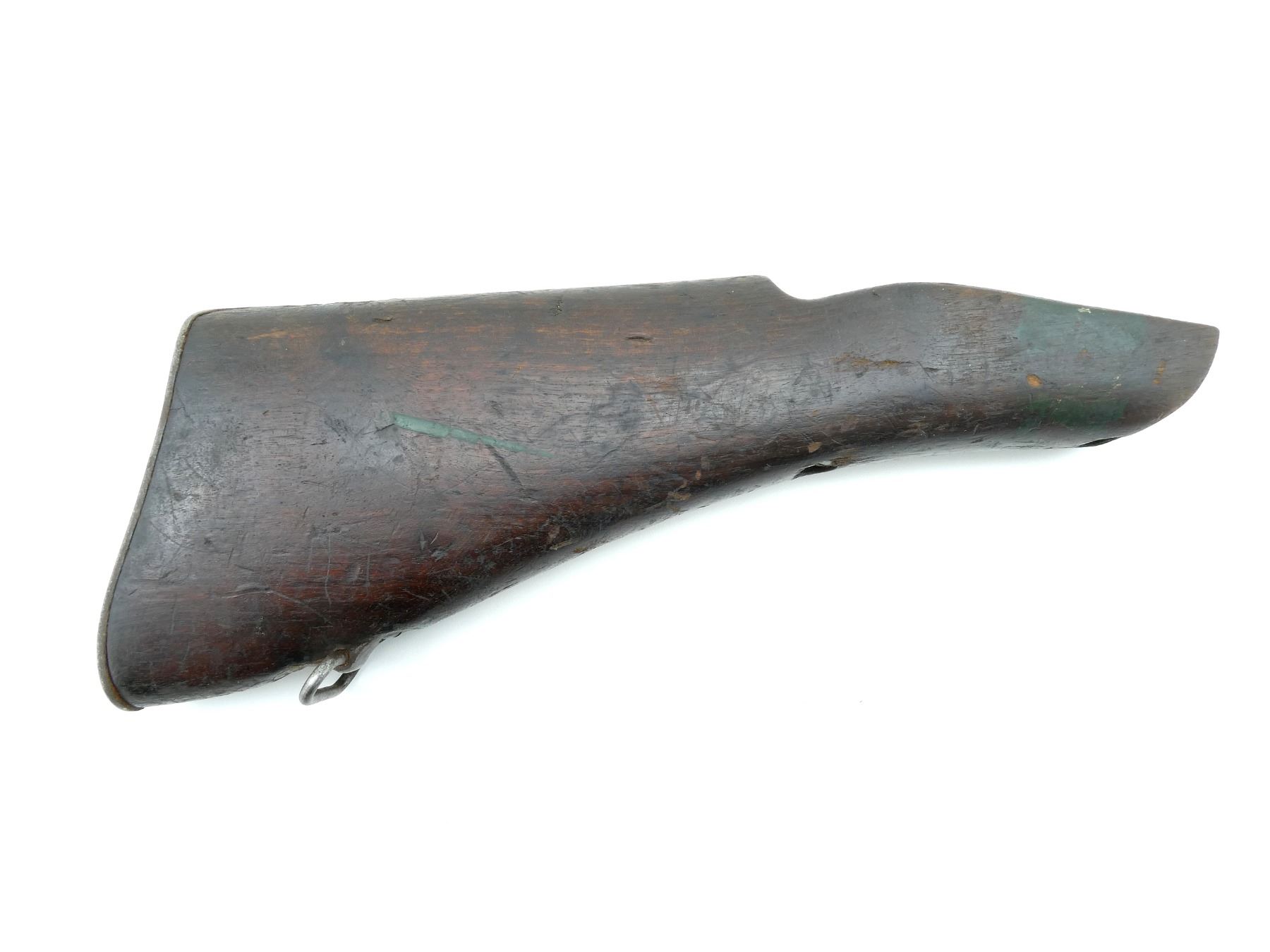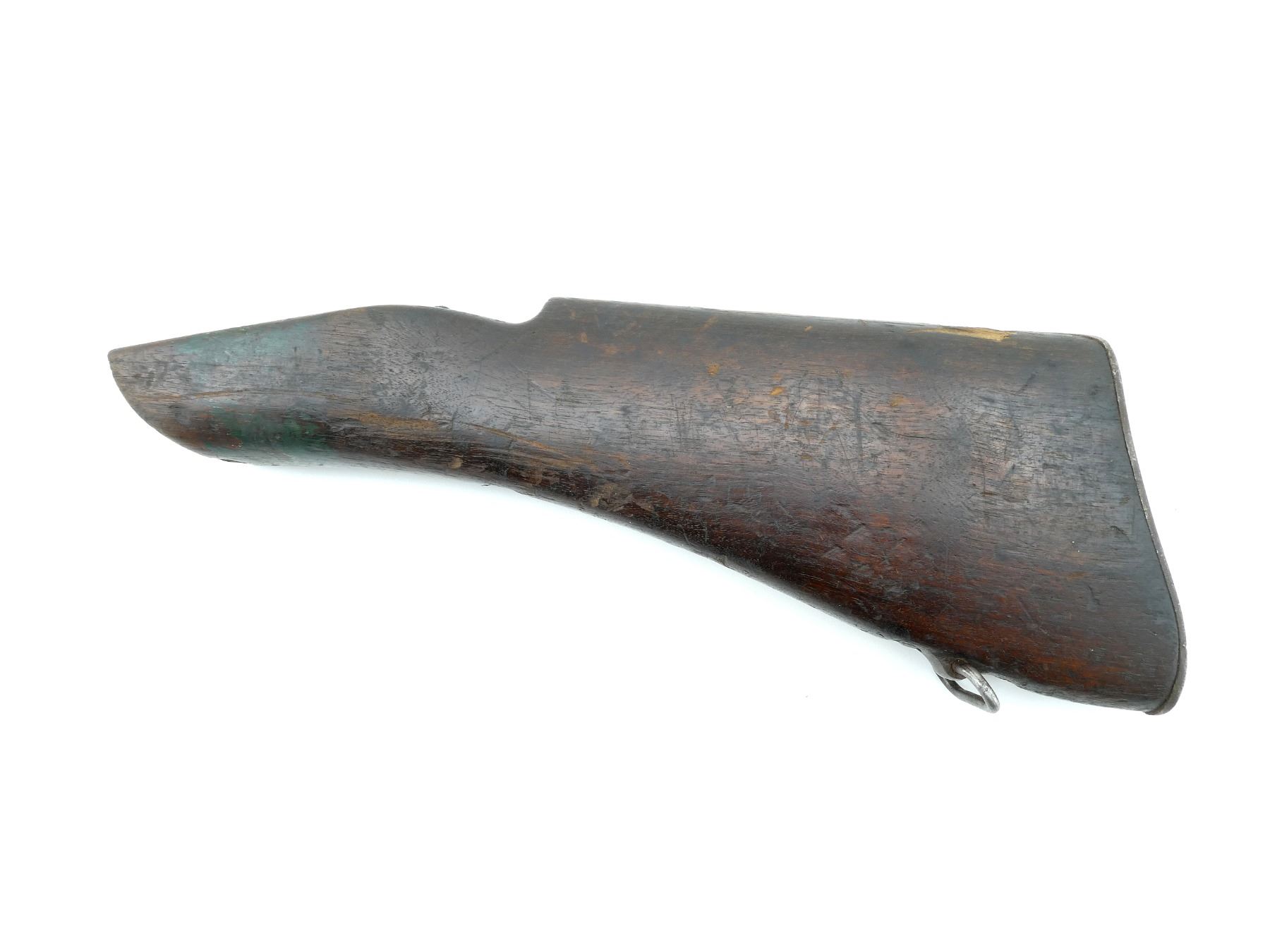 (1) WOOD BUTT STOCK WITH METAL FITTINGS, BOTTOM SLING SWIVEL, UNMARKED, METAL BUTT PLATE, OVERALL LENGTH APPROX. 13.5". MAY REQUIRE FITTING. SEE PHOTOS.