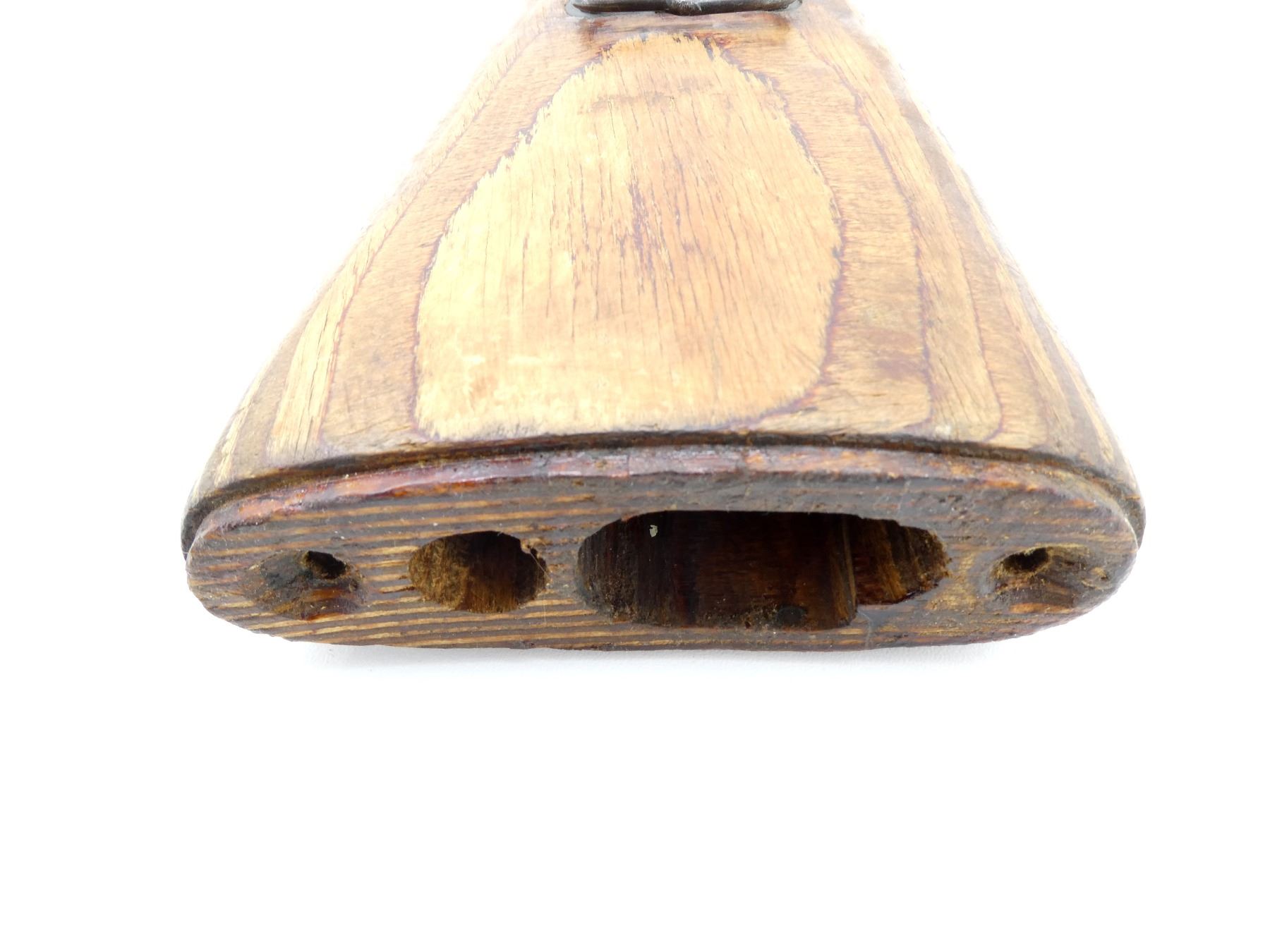(1) WOODEN STOCK, SMOOTH, SIDE SLING SWIVEL, INDISTINCT MARKINGS, MISSING BUTT PLATE, MAY HAVE SMALL CRACKS / CHIPS, OVERALL LENGTH APPROX. 28 7/8". MAY REQUIRE FITTING. SEE PHOTOS.