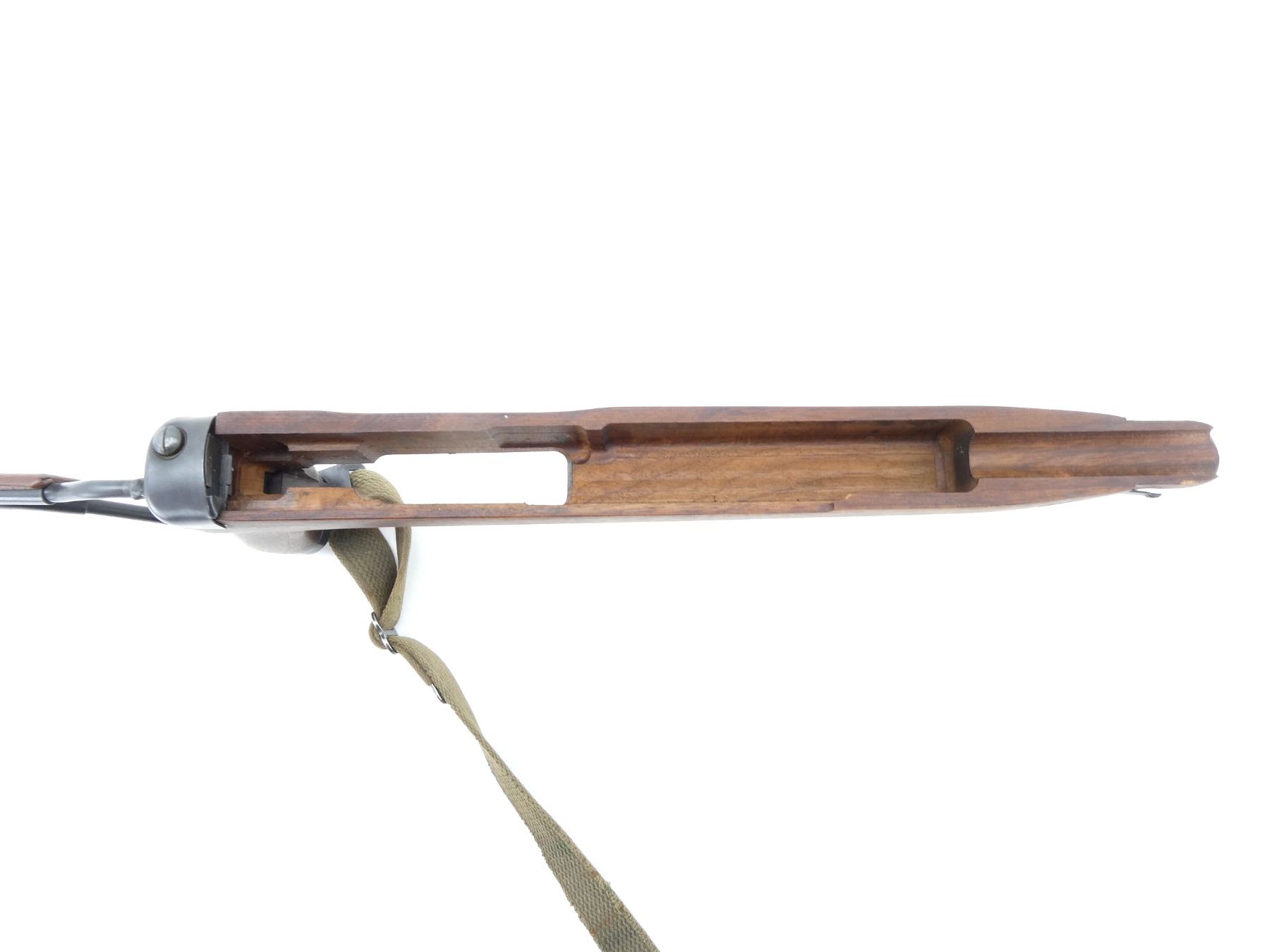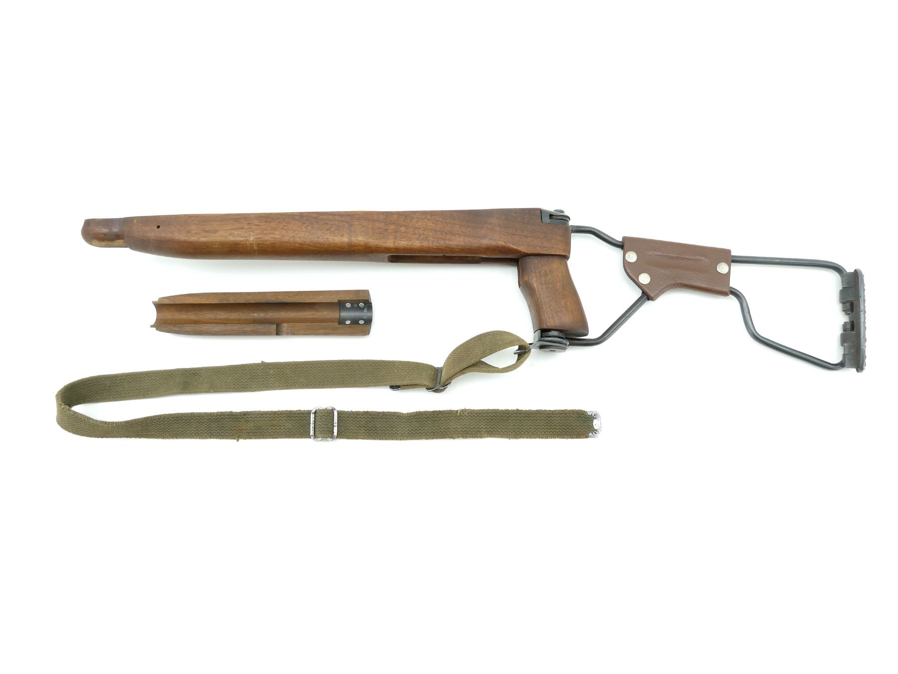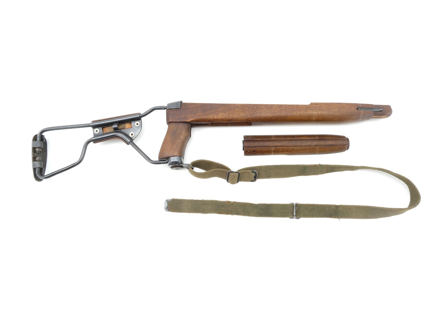 (1) WOODEN BUTT STOCK WITH METAL & POLYMER FOLDING FITTINGS, UNMARKED, METAL BUTT PLATE, BOTTOM SLING SWIVEL WITH GREEN CANVAS SLING ATTACHED, SLING UNMARKED, FOLDED APPROX. 17.5" & OVERALL LENGTH APPROX. 27.75" & (1) WOODEN HAND GUARD, OVERALL LENGTH APPROX. 8". MAY REQUIRE FITTING. SEE PHOTOS.