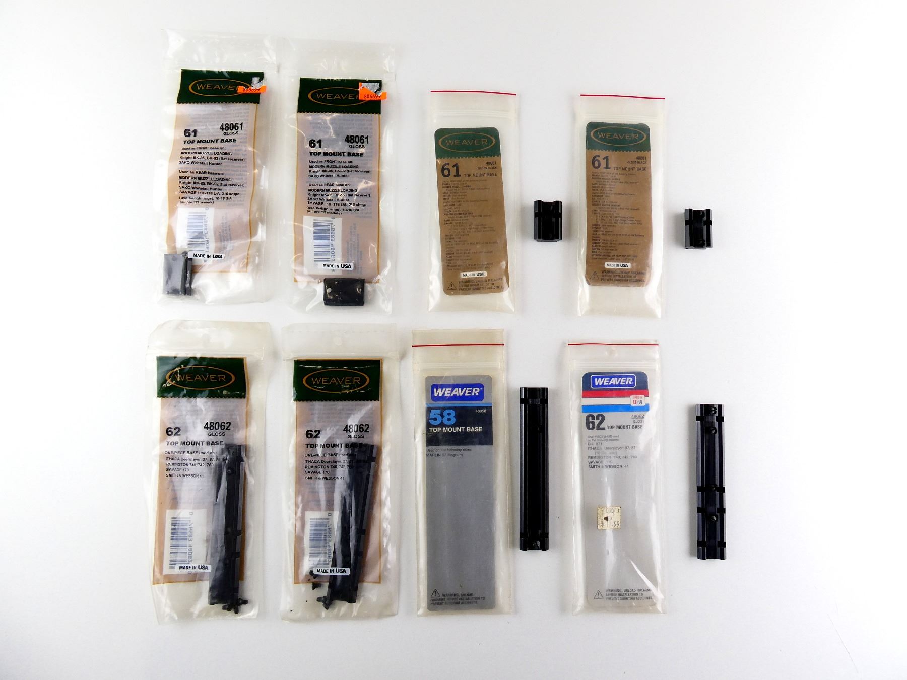 LOT INCLUDES; (8) WEAVER TOP MOUNT BASES, NO. 58 / 61 / 62, PRODUCT #: 48058 / 48061 / 48062, WITH ORIGINAL PACKAGING, 4 SEALED IN PACKAGING. MAY REQUIRE FITTING. SEE PHOTOS.