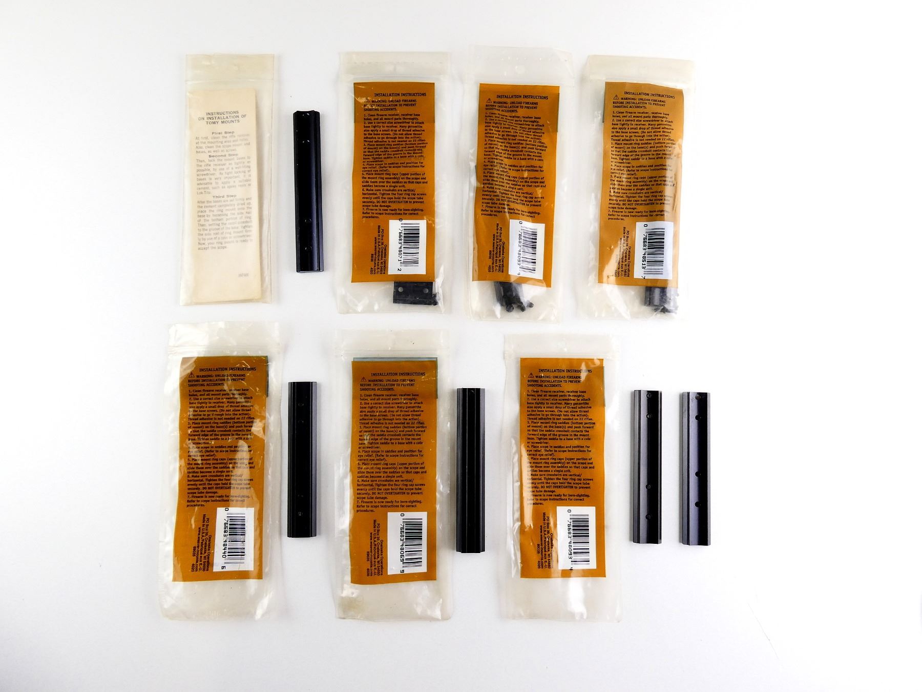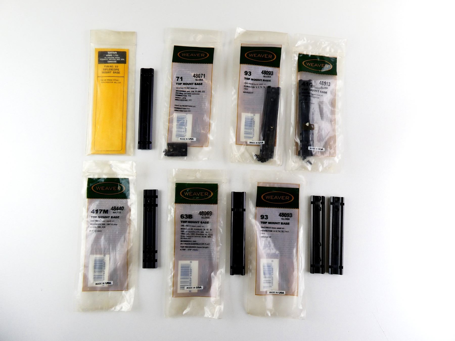LOT INCLUDES; (6) WEAVER TOP MOUNT BASES, NO. 63B / 71 / 93 / 410 / 417M, PRODUCT #: 48069 / 48071 / 48093 / 48513 / 48440, WITH ORIGINAL PACKAGING, 3 SEALED IN PACKAGING, (1) SAFARI ARMS LTD. MOUNT BASE, FITS WINCHESTER 88 / 100, ETC. MAY REQUIRE FITTING. SEE PHOTOS.