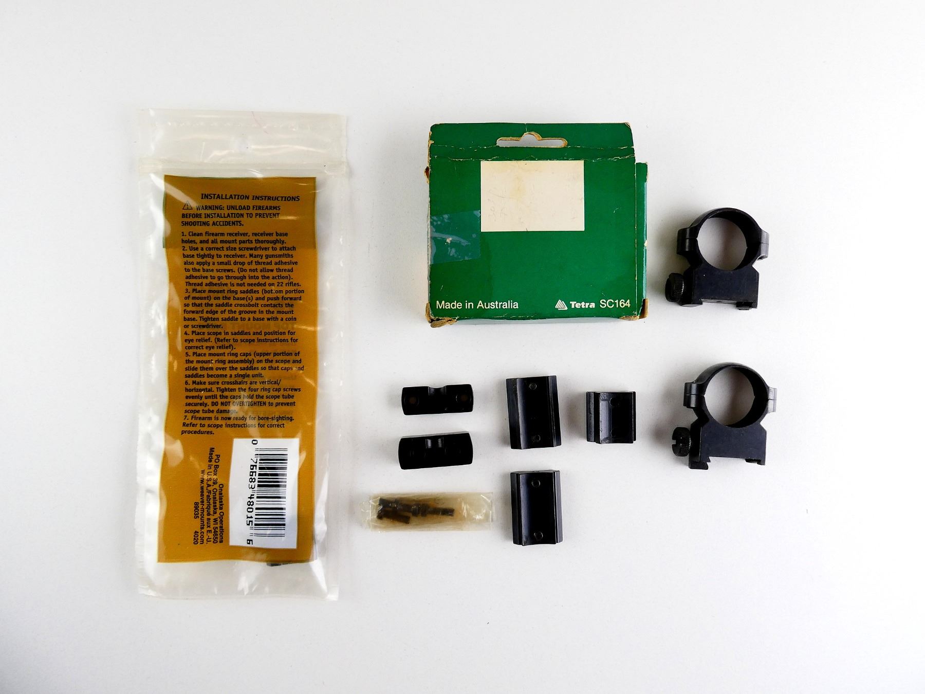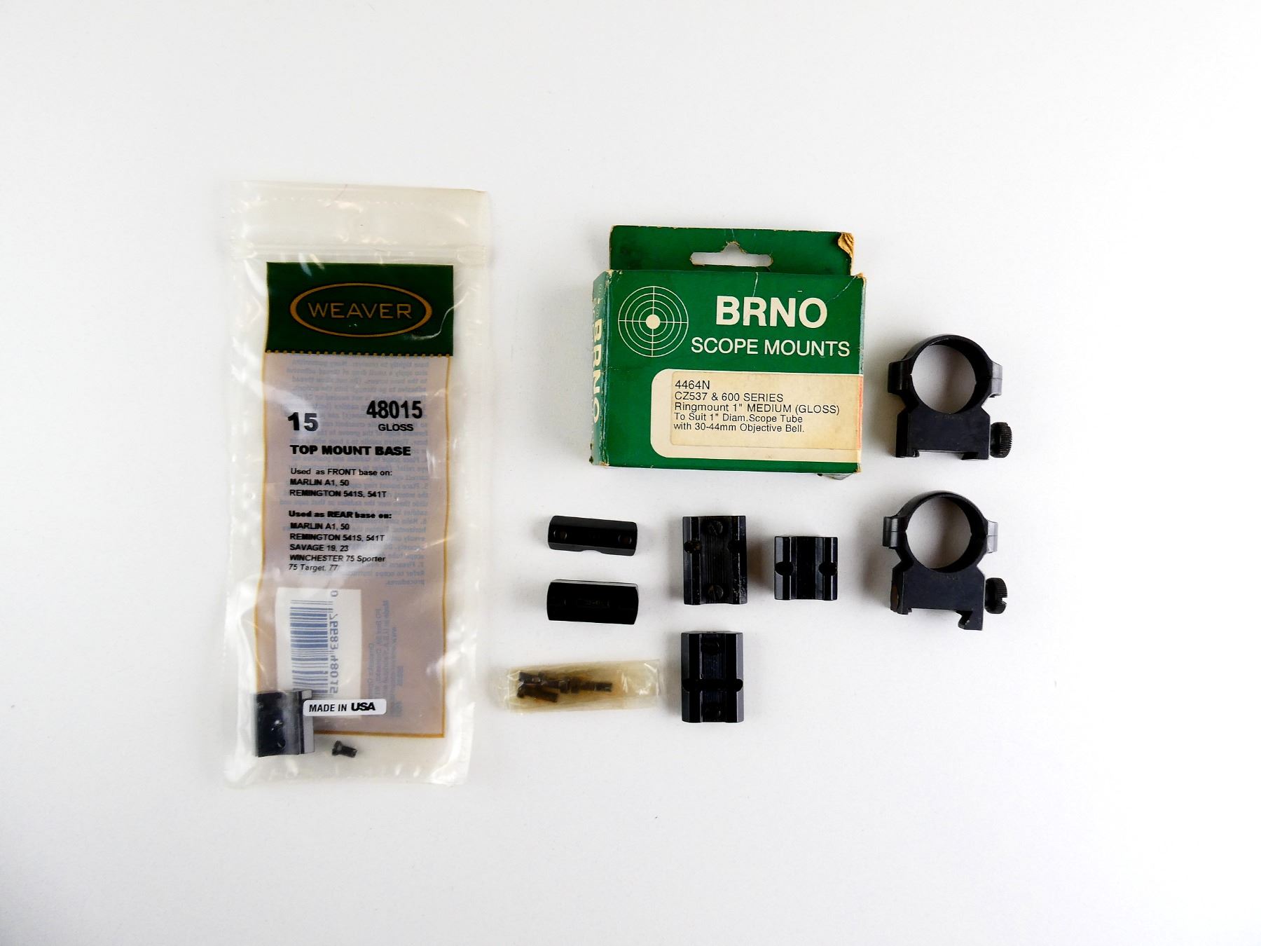 LOT INCLUDES; (1) SET OF BRNO SCOPE RINGS, CZ537 & 600 SERIES, 1" DIAMETER, MEDIUM, PRODUCT #: 4464N, (1) SET OF REDFIELD BIG BORE SCOPE MOUNT BASES, PRODUCT #: 729402 & (1) WEAVER TOP MOUNT BASE, NO. 15, PRODUCT #: 48015, ETC. MAY REQUIRE FITTING. SEE PHOTOS.