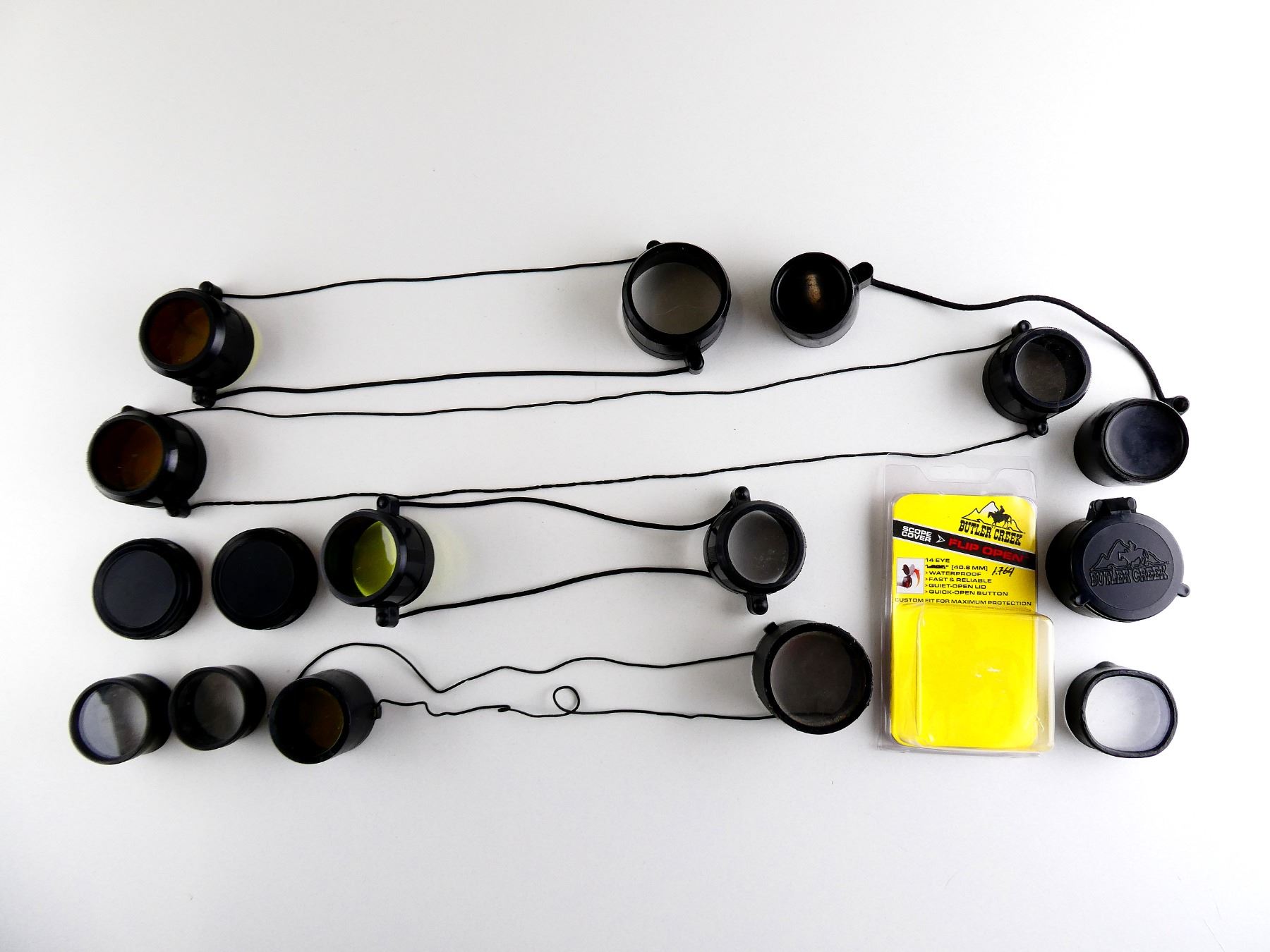LOT INCLUDES; (5) BIKINI STYLE LENS COVER, VARIOUS SIZES & (1) BUTLER CREEK FLIP UP LENS COVER, 1.764", IN ORIGINAL PACKAGING, ETC. SEE PHOTOS.
