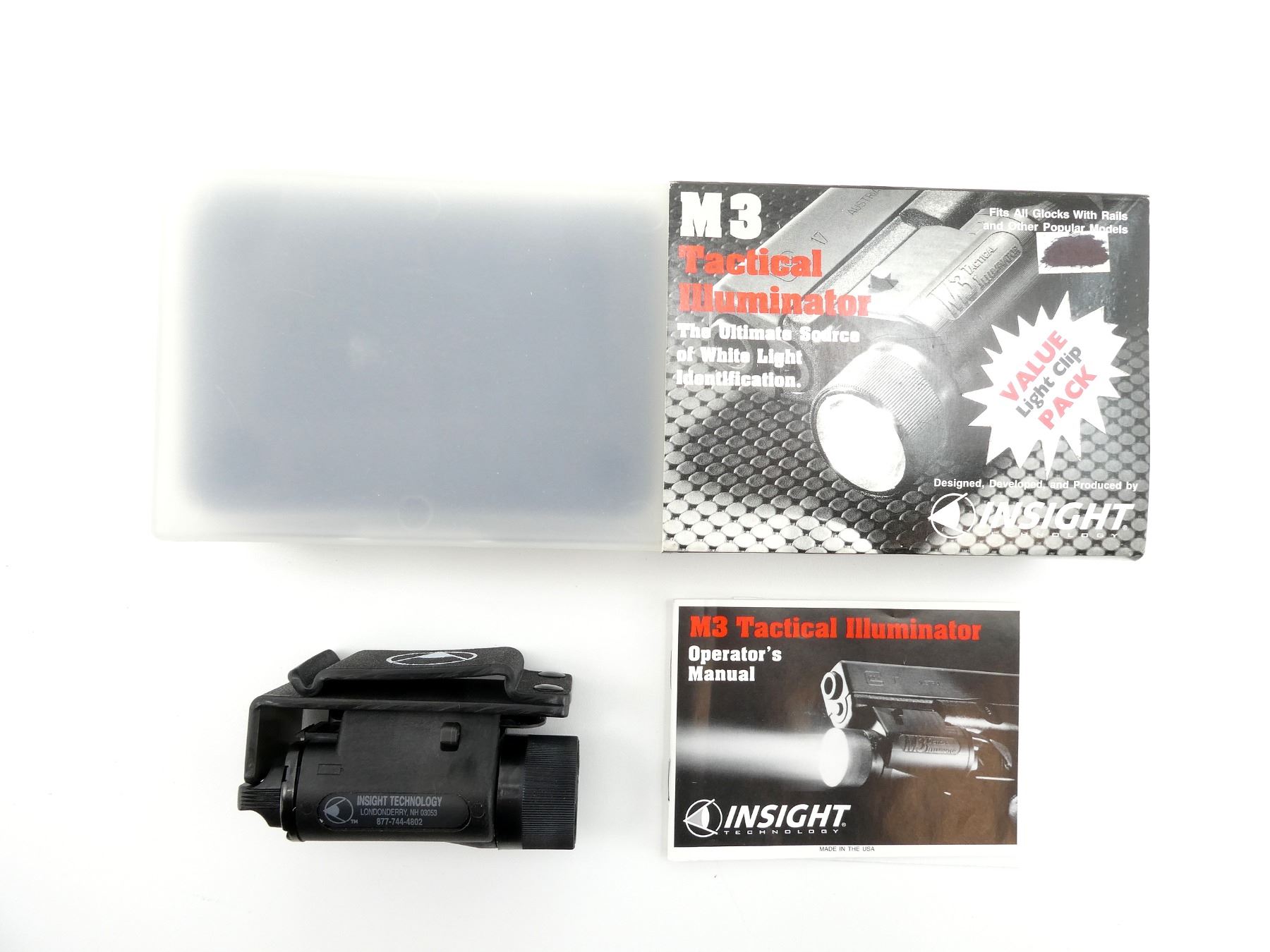 (1) INSIGHT M3 TACTICAL ILLUMINATOR, FITS ALL GLOCKS WITH RAILS, WORKING WHITE LIGHT, NEW OLD STOCK, IN ORIGINAL PACKAGING. MAY REQUIRE FITTING. SEE PHOTOS.