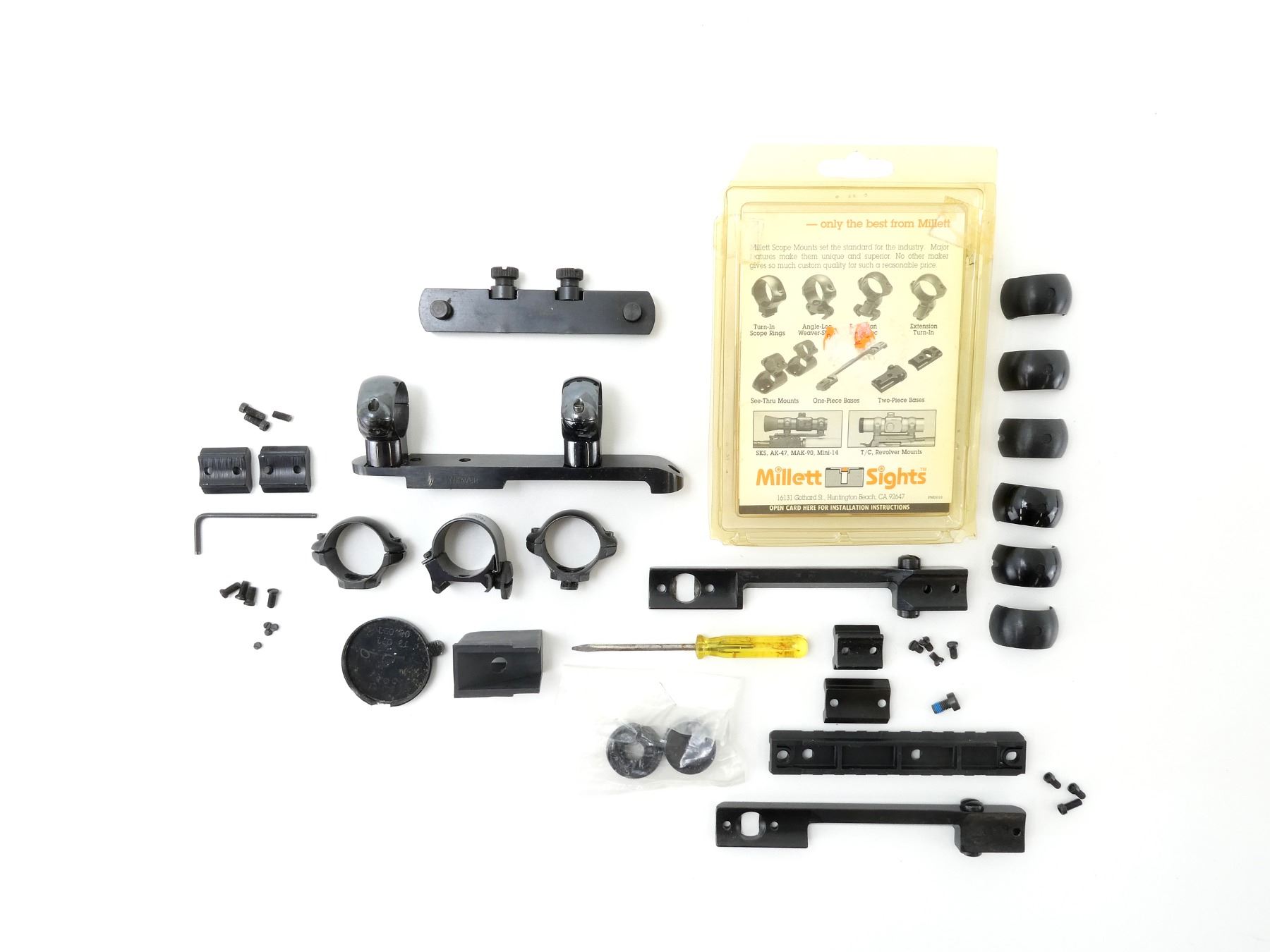 LOT INCLUDES; (1) TASCO U/O QUICK DETACH BASE, BRNO CZ300 & 500 SERIES, PRODUCT #: 1911N, APPEARS NEW OLD STOCK, IN ORIGINAL PACKAGING, (1) REDFIELD JR 70-AH BASE, FITS WINCHESTER 70, 300 & .375 H&H MAGNUM ABOVE SERIAL NO. 700,000, PRODUCT #: 511113, APPEARS NEW OLD STOCK, IN ORIGINAL PACKAGING, (1) UNKNOWN BASE, UNMARKED, APPEARS NEW OLD STOCK, (1) WEAVER TOP MOUNT BASE, USED AS FRONT & REAR BASE, APPEARS NEW OLD STOCK, (1) BURRIS OFFSET RINGS INSERTS, PRODUCT #: 626019, APPEARS NEW OLD STOCK, (1) WEAVER MOUNT WITH 1" DIAMETER RINGS & (1) PACK OF MILLETT SCOPE RINGS, MEDIUM, 1" DIAMETER, PRODUCT #: CP00002, APPEARS NEW OLD STOCK, IN ORIGINAL PACKAGING, ETC. MAY NOT BE COMPLETE / PIECES MAY BE MISSING. MAY REQUIRE FITTING. SEE PHOTOS.