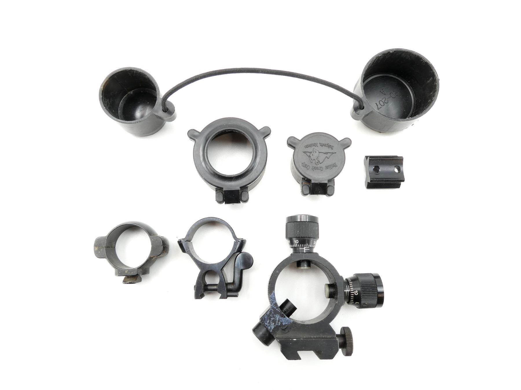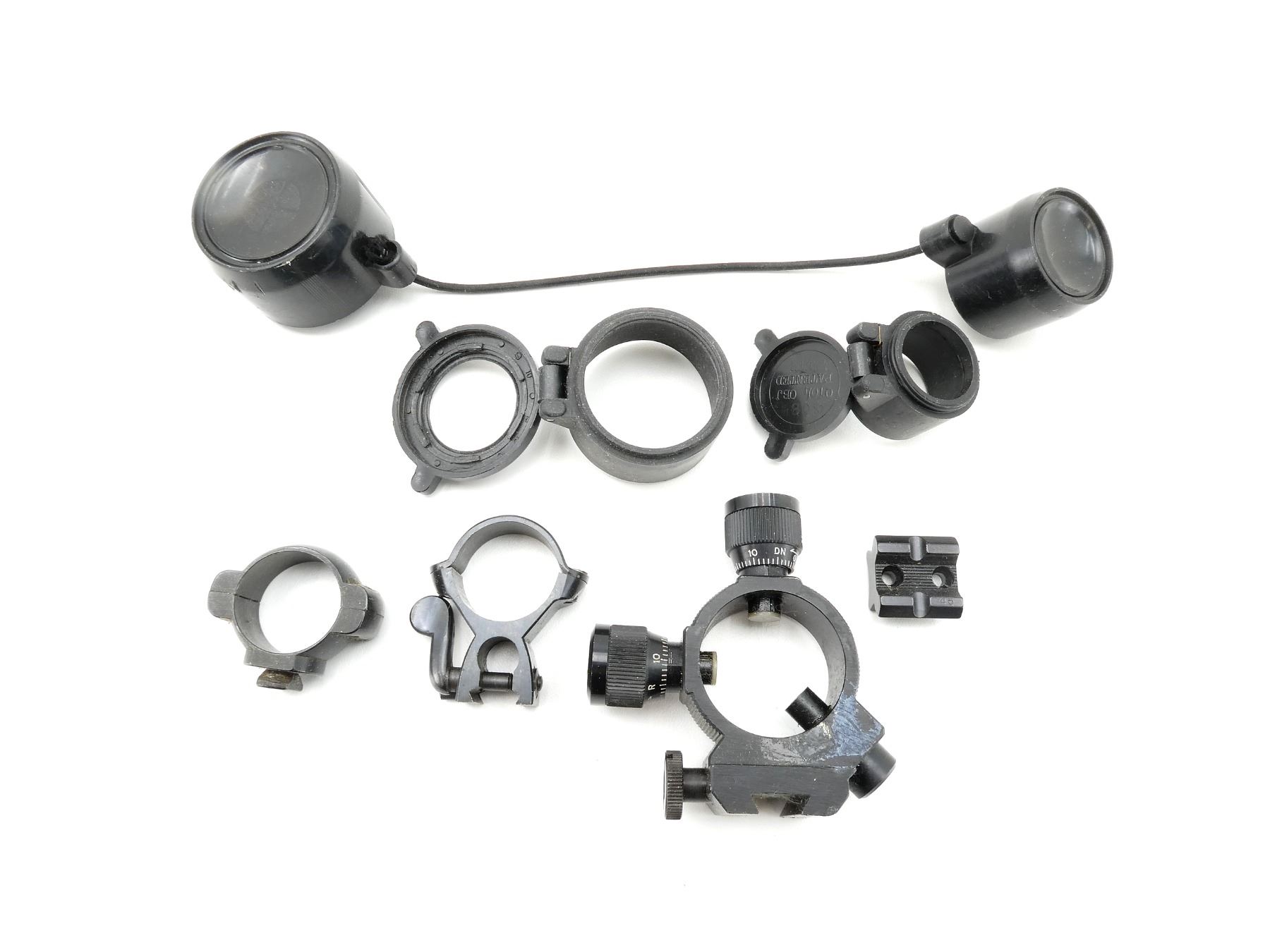 LOT INCLUDES; (1) EXTERNAL WINDAGE & ELEVATION ADJUSTMENTS, WINDAGE & ELEVATION KNOBS TURN & (2) UNKNOWN SCOPE RINGS, 1" DIAMETER, ETC. MAY REQUIRE FITTING. SEE PHOTOS.