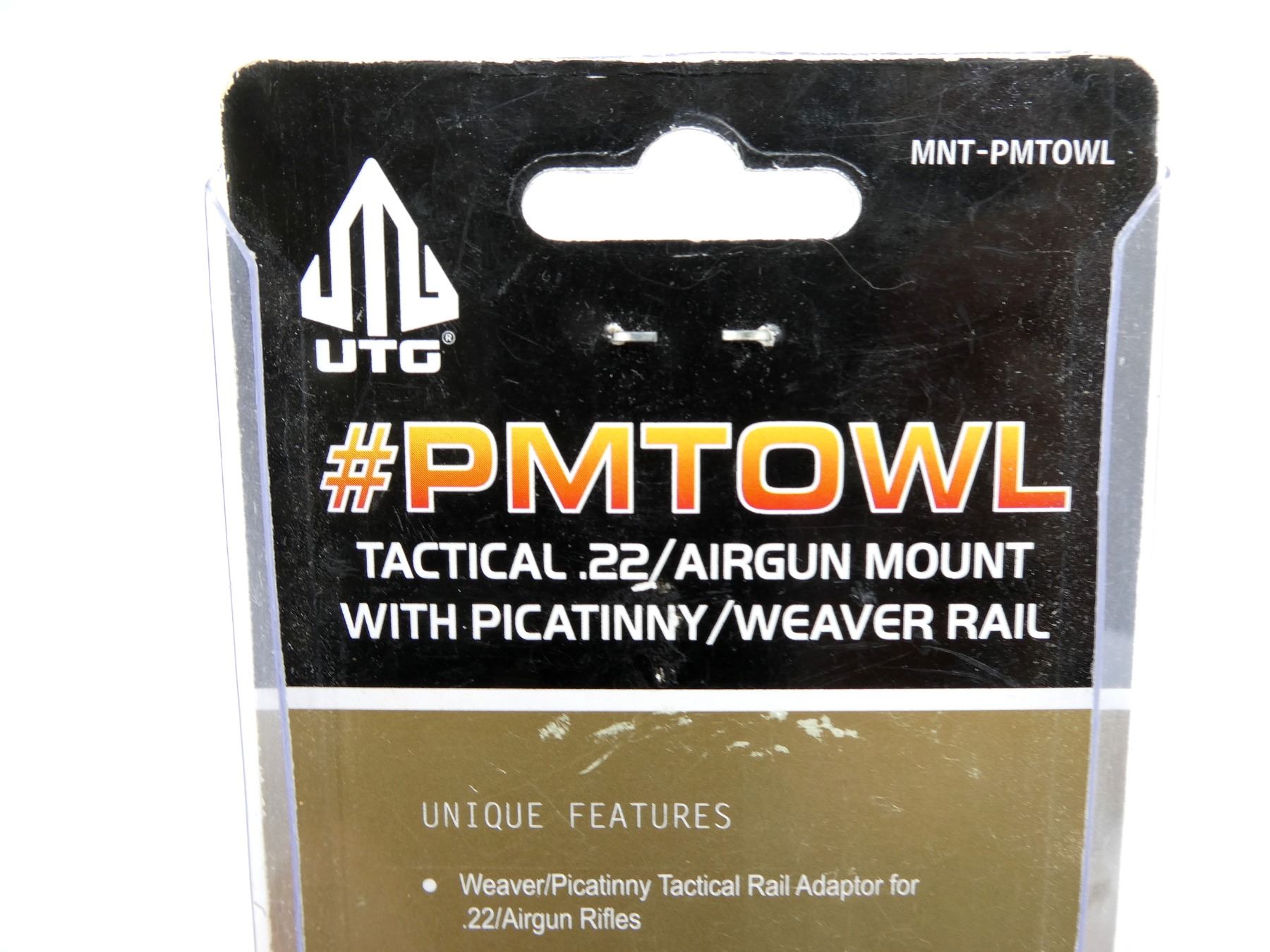 LOT INCLUDES; (2) UTG RAIL MOUNTS, FOR .22/AIRGUN RIFLES, PRODUCT #: MNT-PMTOWL, NEW OLD STOCK, IN ORIGINAL PACKAGING. MAY REQUIRE FITTING. SEE PHOTOS.