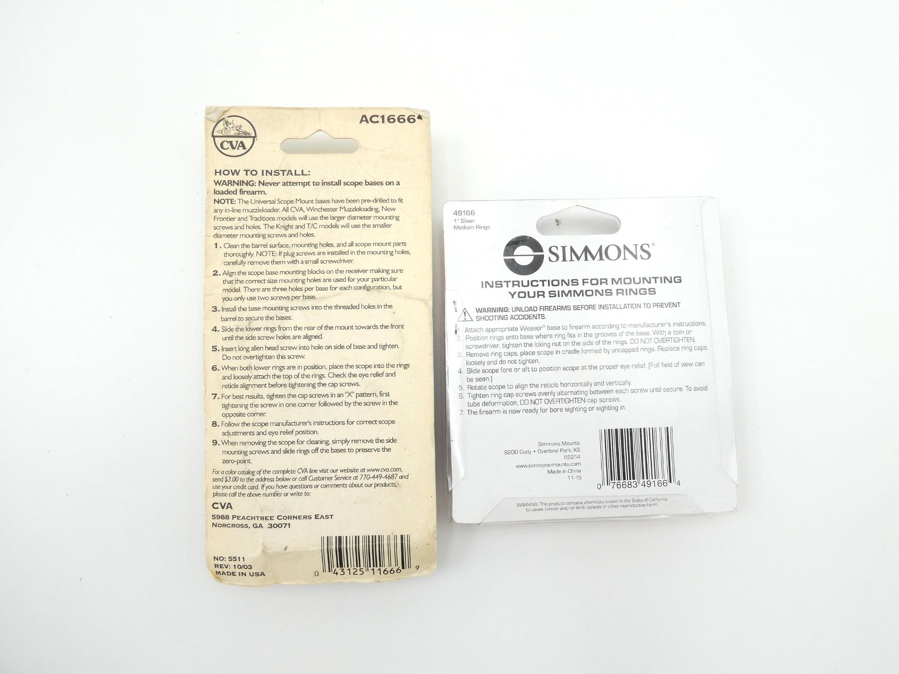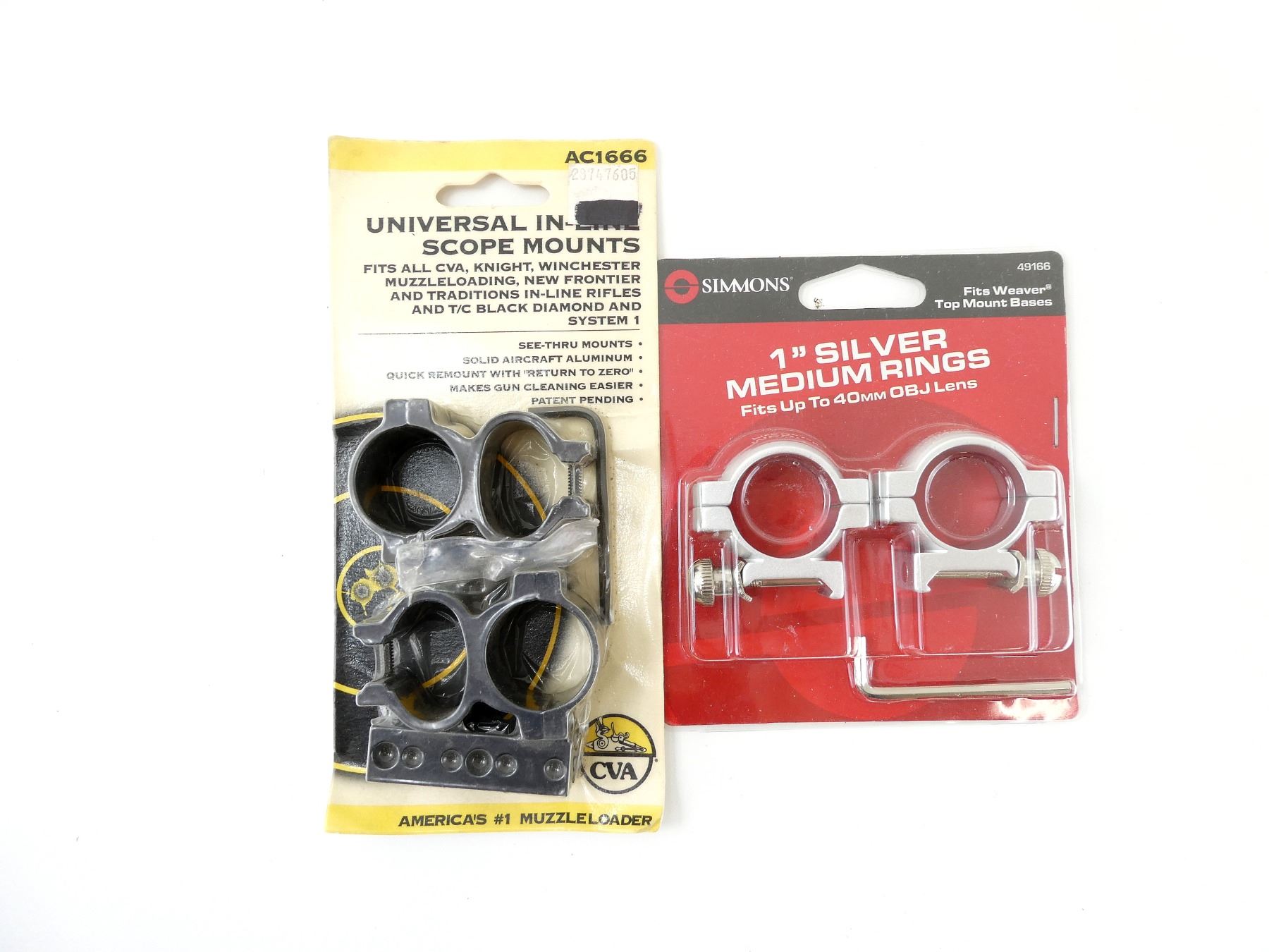 LOT INCLUDES; (1) SIMMONS 1" SILVER RINGS, MEDIUM, FITS UP TO 40MM OBJ LENS, MODEL #: 49166, NEW OLD STOCK, SEALED IN ORIGINAL PACKAGING & (1) CVA UNIVERSAL IN-LINE SCOPE RINGS, SEE-THRU, ALUMINUM, MODEL #: AC1666, NEW OLD STOCK, SEALED IN ORIGINAL PACKAGING. MAY REQUIRE FITTING. SEE PHOTOS.