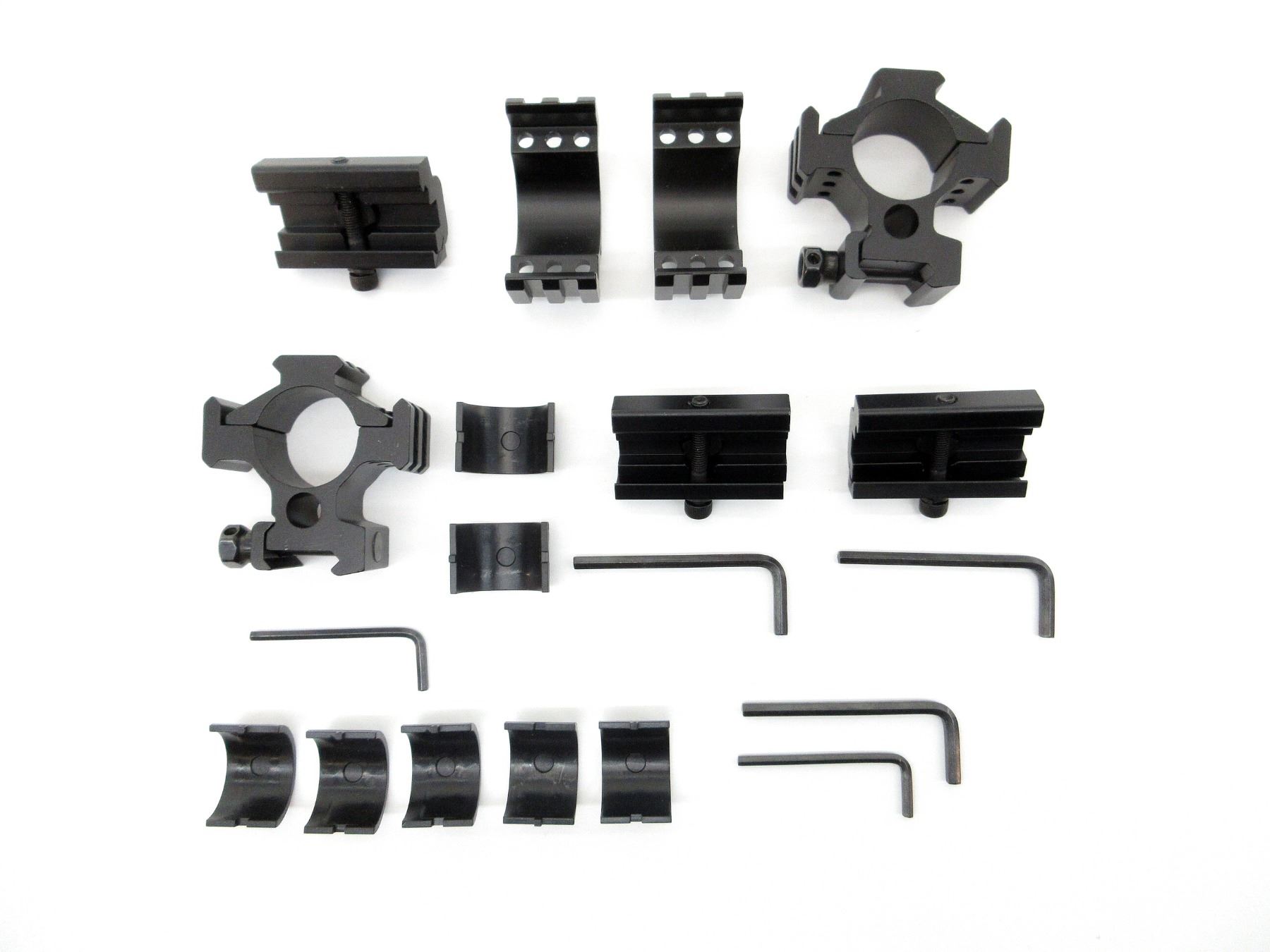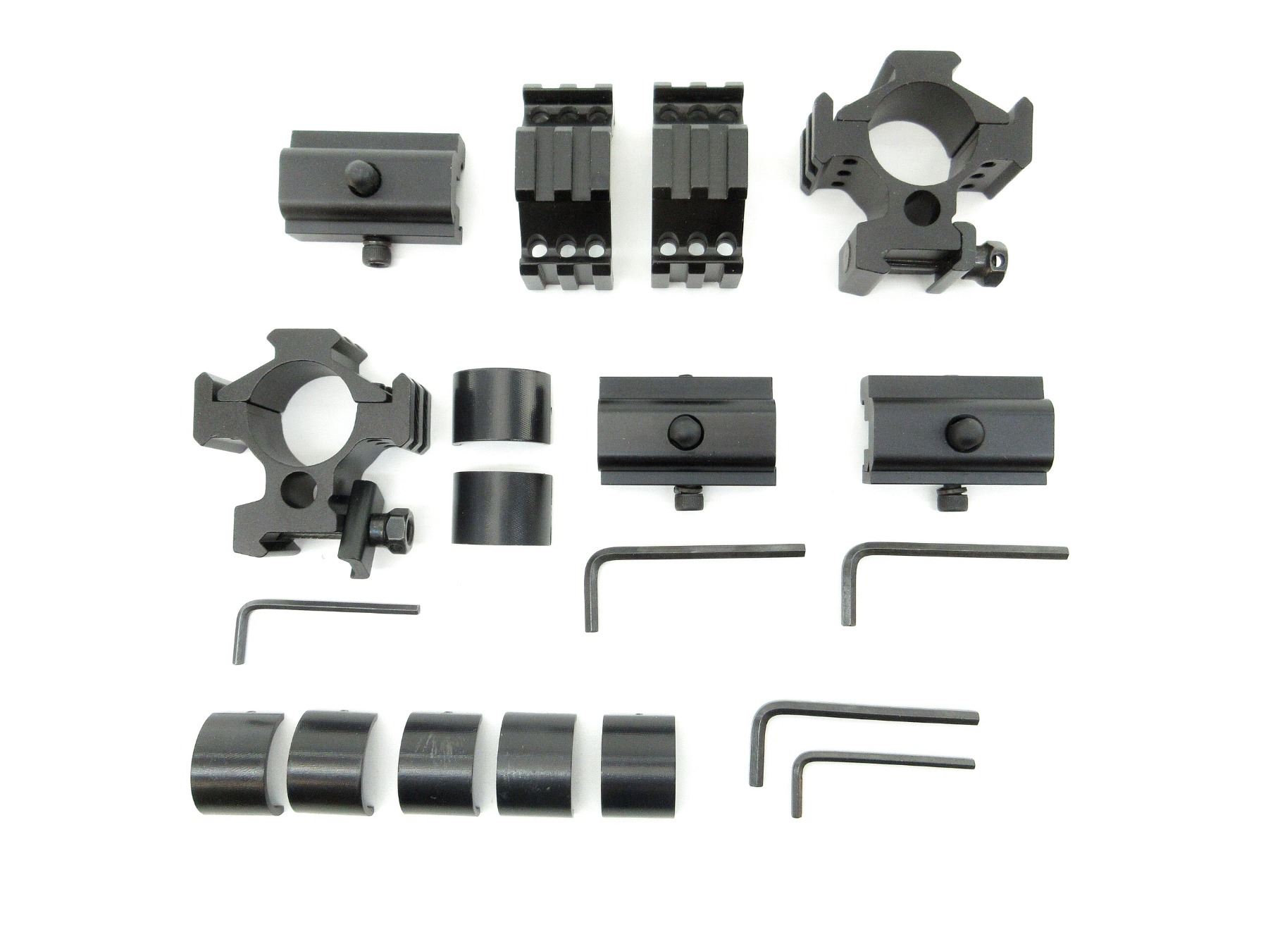 LOT INCLUDES; (3) 30MM SCOPE RINGS, BLACK METAL CONSTRUCTION, WITH INSERTS TO REDUCE TO 1" RINGS, MAY NOT BE COMPLETE / PIECES MAY BE MISSING & (3) SCOPE BASES, BLACK METAL CONSTRUCTION, MAY NOT BE COMPLETE / PIECES MAY BE MISSING. MAY REQUIRE FITTING. SEE PHOTOS.
