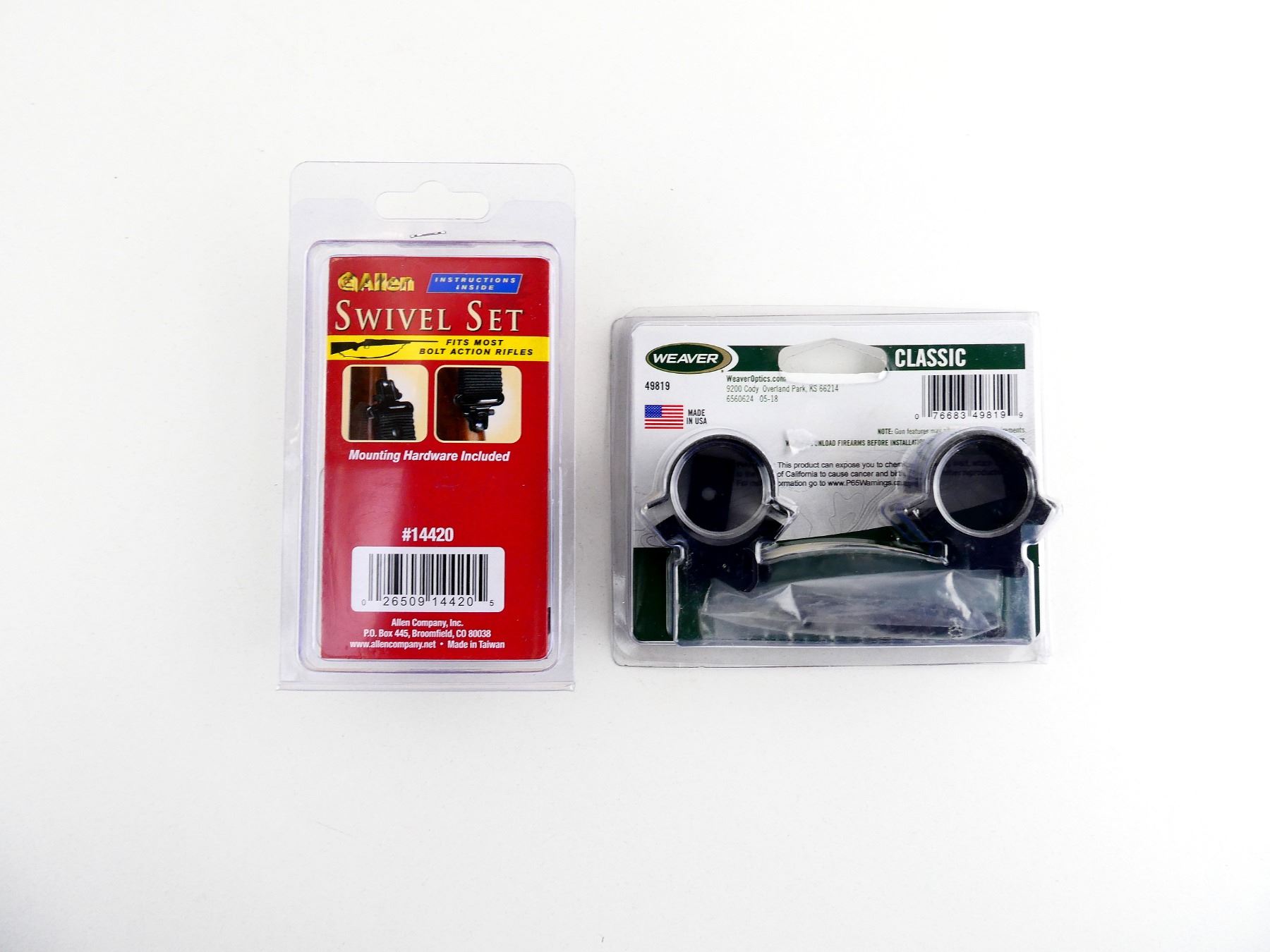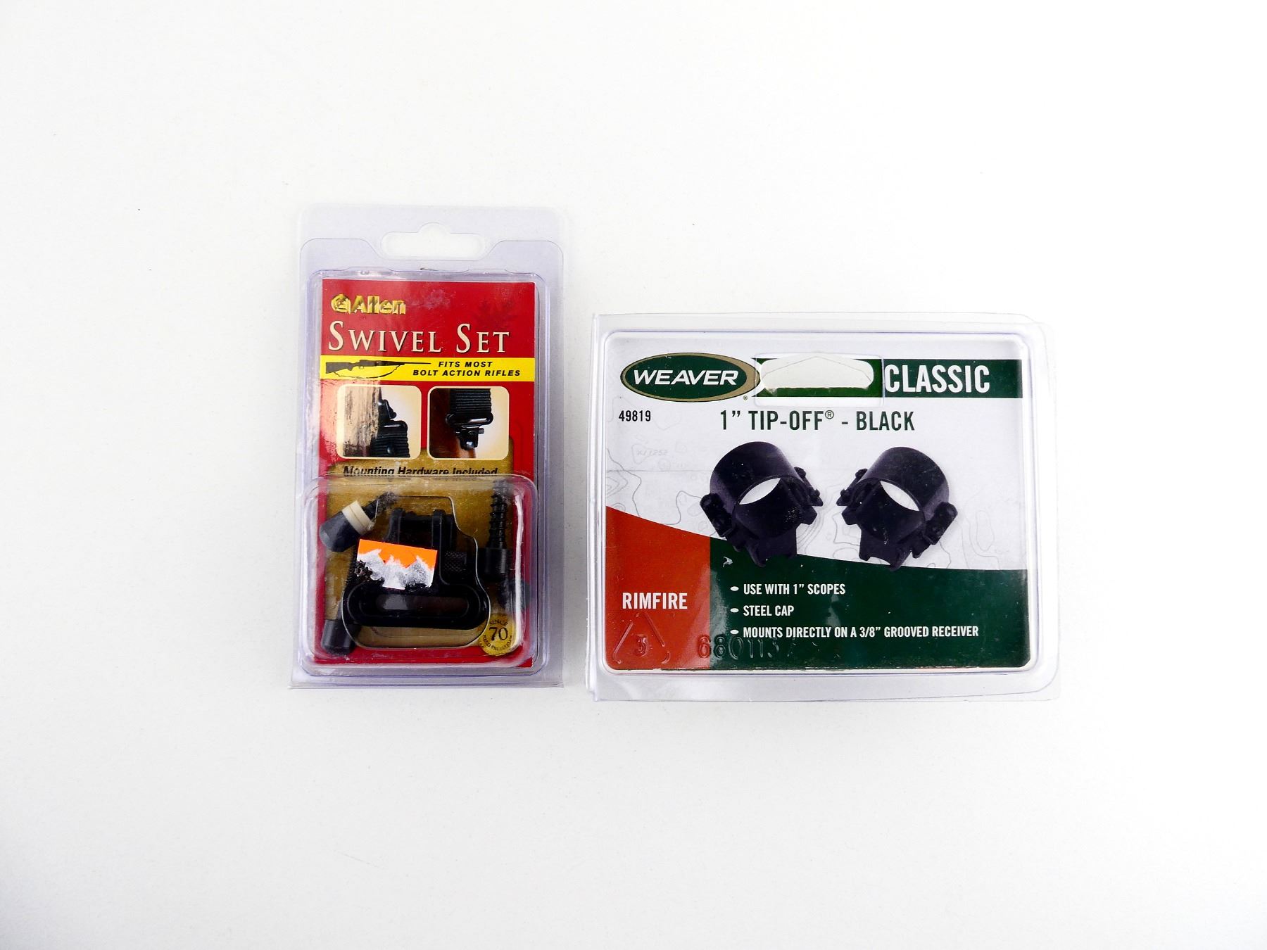 LOT INCLUDES; (1) SET OF 1" SCOPE RINGS, BLACK ALLOY & STEEL CONSTRUCTION, CLASSIC, PART #: 49819, APPEARS NEW OLD STOCK IN ORIGINAL PACKAGING, MAY NOT BE COMPLETE & (1) ALLEN SWIVEL SET, BLACK STEEL CONSTRUCTION, PART #: 14420, APPEARS NEW OLD STOCK IN ORIGINAL PACKAGING, MAY NOT BE COMPLETE. MAY REQUIRE FITTING. SEE PHOTOS.