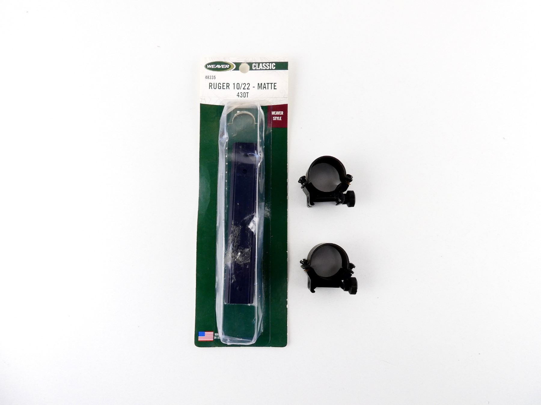 LOT INCLUDES; (1) SET OF 1" SCOPE RINGS, BLACK STEEL CONSTRUCTION, MARKED: "WEAVER, 1 - USA", MAY NOT BE COMPLETE & (1) WEAVER RUGER 10/22 SCOPE RAIL, MATTE BLACK STEEL CONSTRUCTION, PART #: 48335, MAY NOT BE COMPLETE. MAY REQUIRE FITTING. SEE PHOTOS.