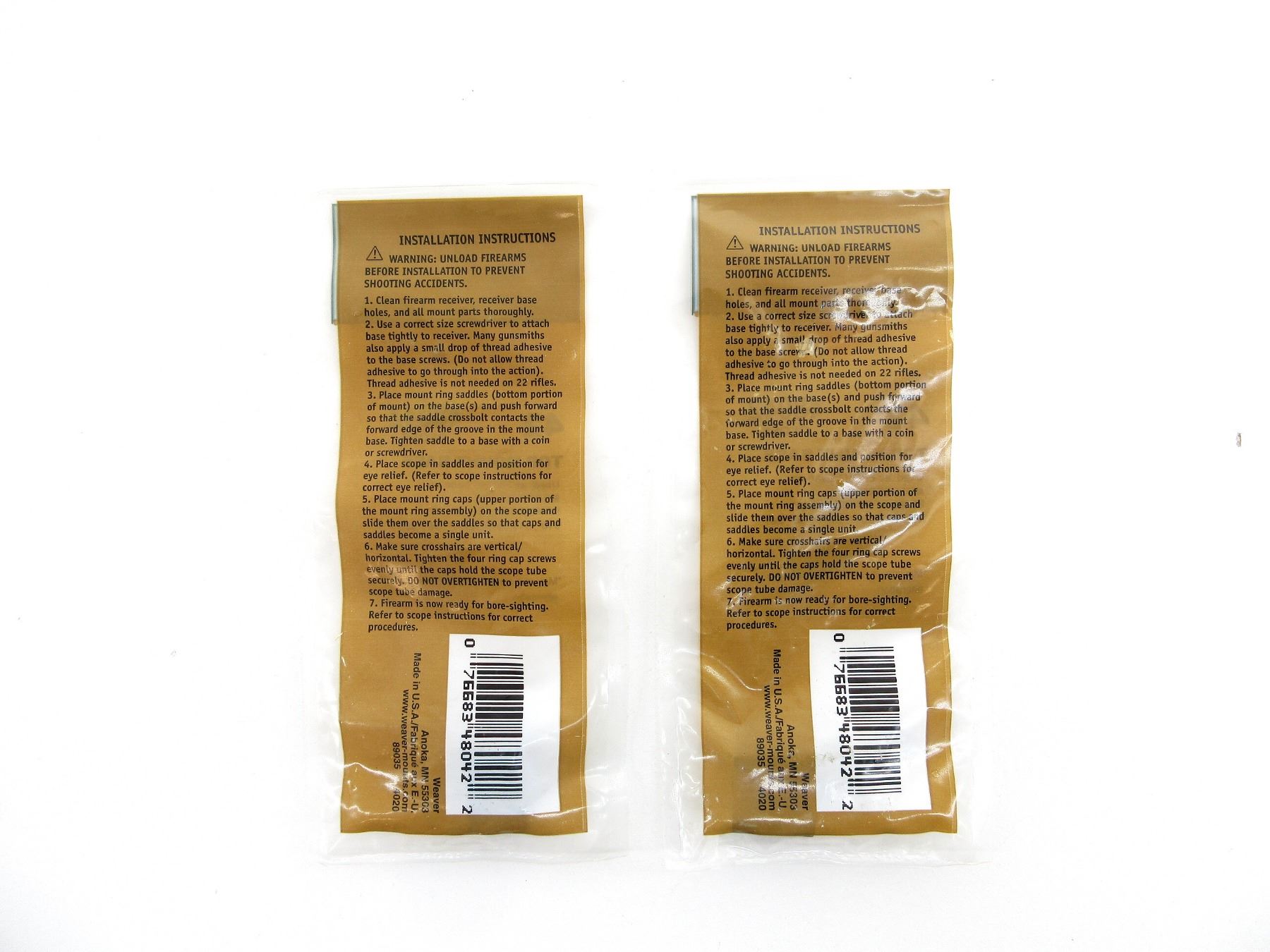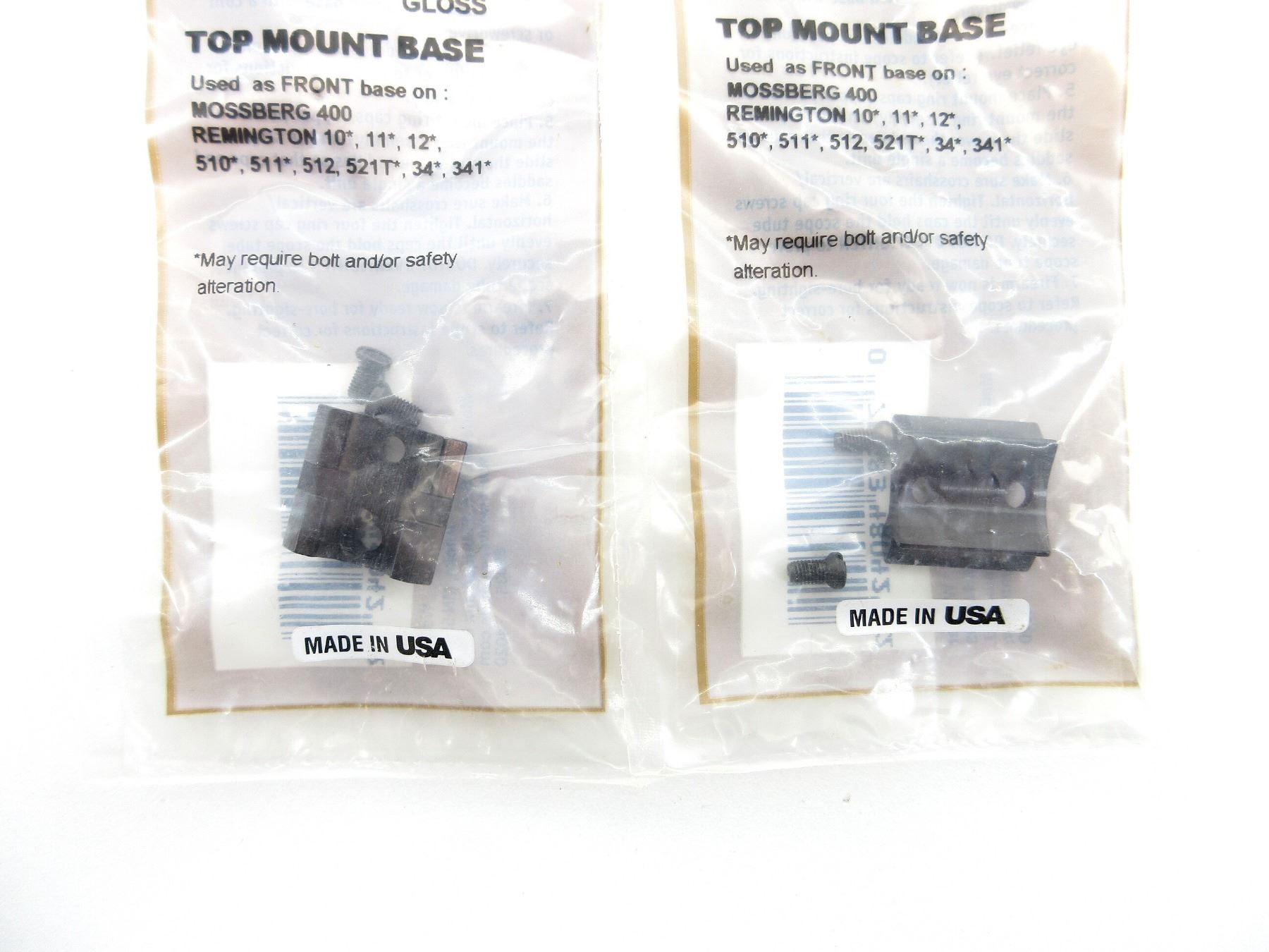 LOT INCLUDES; (2) SCOPE RING BASES, GLOSS BLACK ALLOY CONSTRUCTION, FITS MOSSBERG 400 / REMINGTON 510 / 511 / ETC., PART #: 48042, APPEARS NEW OLD STOCK IN ORIGINAL PACKAGING, MAY NOT BE COMPLETE. MAY REQUIRE FITTING. SEE PHOTOS.