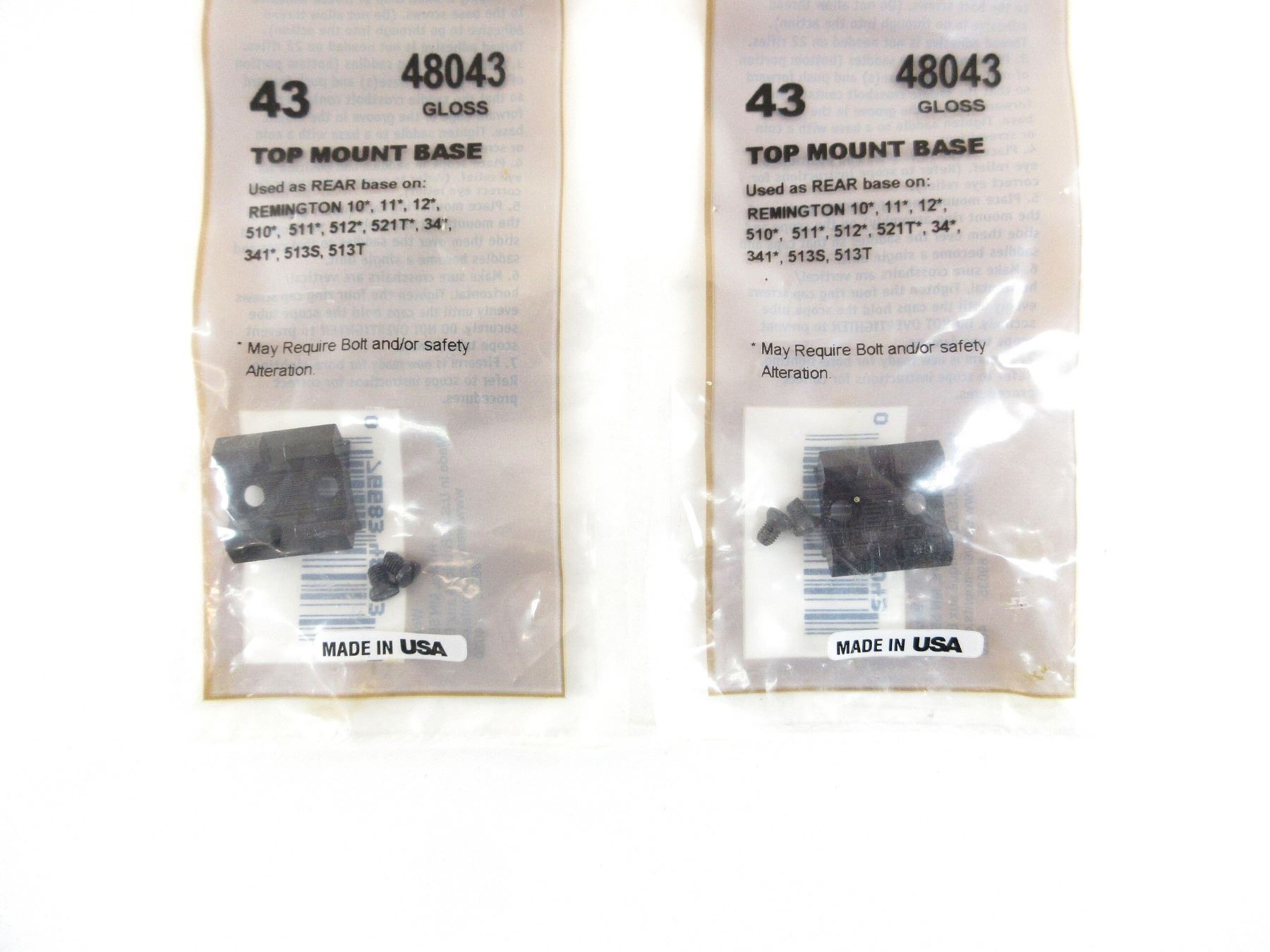 LOT INCLUDES; (2) SCOPE RING BASES, GLOSS BLACK ALLOY CONSTRUCTION, FITS REMINGTON 510 / 511 / 512 / 521T / ETC., PART #: 48043, APPEARS NEW OLD STOCK IN ORIGINAL PACKAGING, MAY NOT BE COMPLETE. MAY REQUIRE FITTING. SEE PHOTOS.