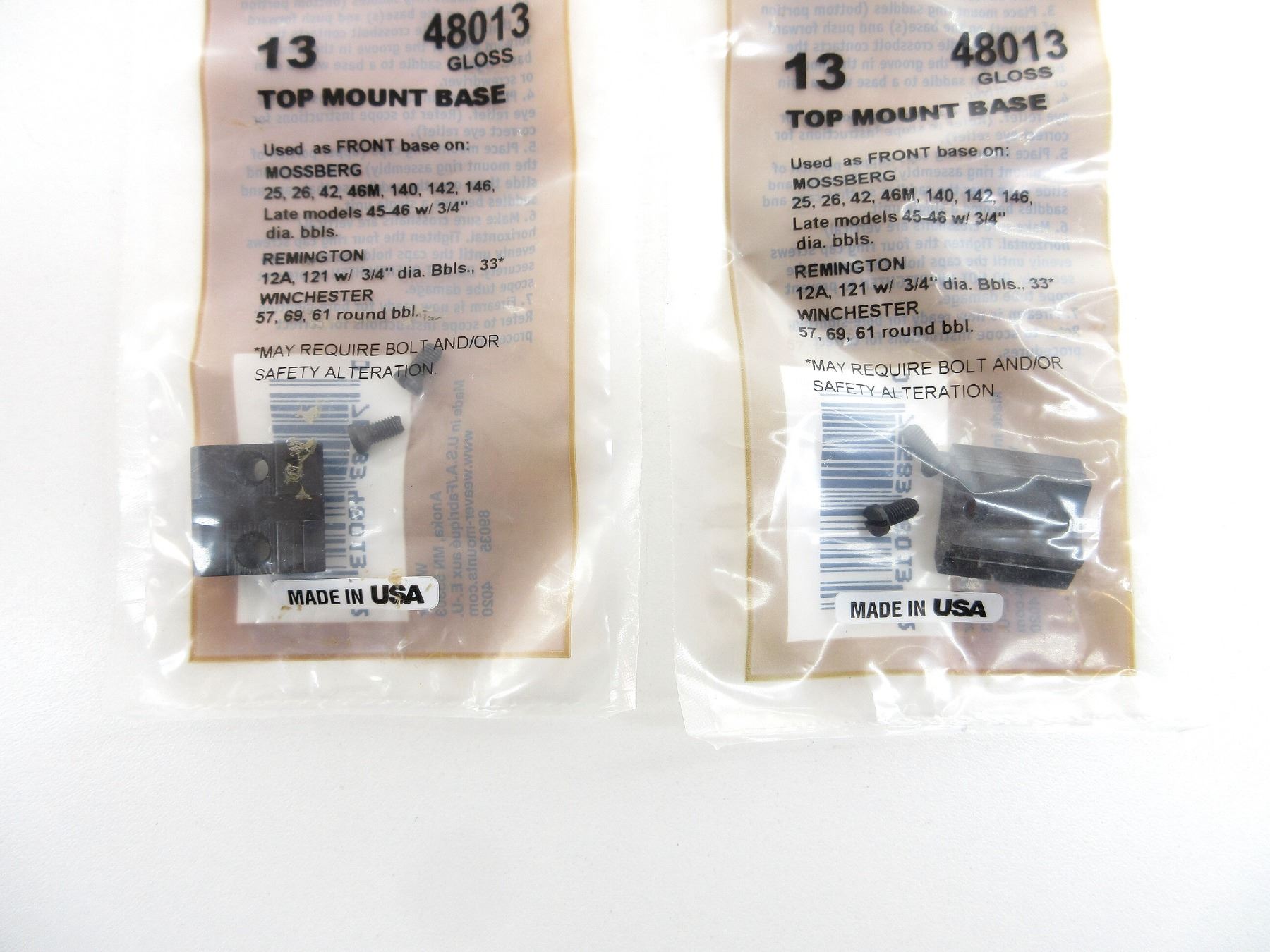 LOT INCLUDES; (2) SCOPE RING BASES, GLOSS BLACK ALLOY CONSTRUCTION, FITS ASSORTED MOSSBERG'S / ASSORTED REMINGTON'S / WINCHESTER 57 / 69 / ETC., PART #: 48013, APPEARS NEW OLD STOCK IN ORIGINAL PACKAGING, MAY NOT BE COMPLETE. MAY REQUIRE FITTING. SEE PHOTOS.