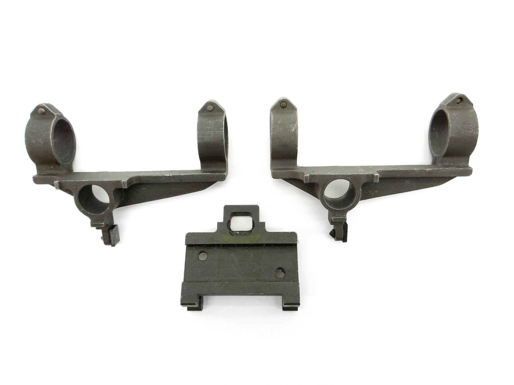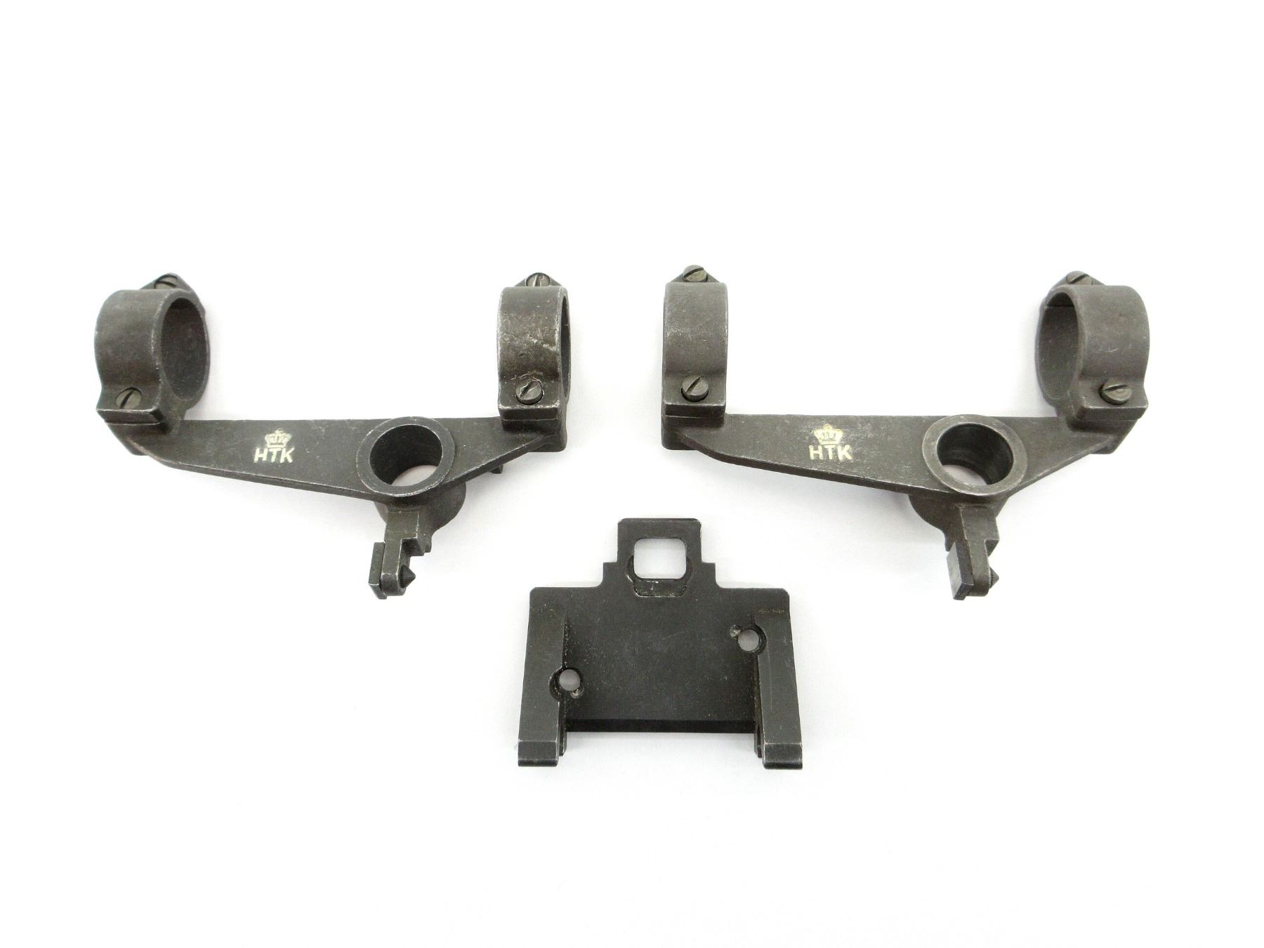 LOT INCLUDES; (2) SETS OF SCOPE RINGS, PARKERIZED STEEL CONSTRUCTION, NOT COMPLETE - MISSING QD PARTS, MARKED: CROWN & "HTK" & (1) SCOPE MOUNT BASE, PARKERIZED STEEL CONSTRUCTION, NO SCREWS, UNMARKED. MAY REQUIRE FITTING. SEE PHOTOS.