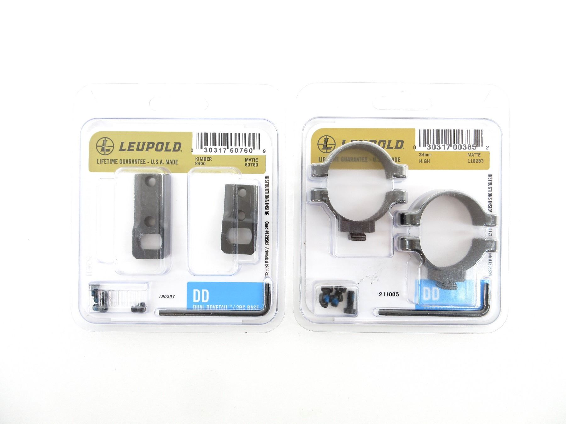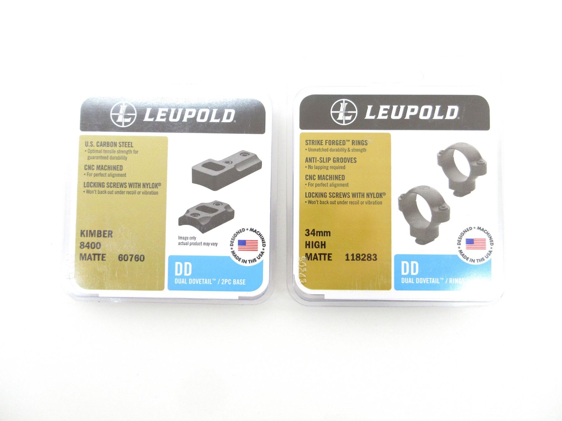 LOT INCLUDES; (1) SET OF 34MM SCOPE RINGS, BLACK MATTE, HIGH, DUAL DOVETAIL, PART #: 118283, APPEARS NEW OLD STOCK IN ORIGINAL PACKAGING & (1) KIMBER 8400 SCOPE BASE, MATTE BLACK STEEL CONSTRUCTION, DUAL DOVETAIL, PART #: 60760, APPEARS NEW OLD STOCK IN ORIGINAL PACKAGING. MAY REQUIRE FITTING. SEE PHOTOS.