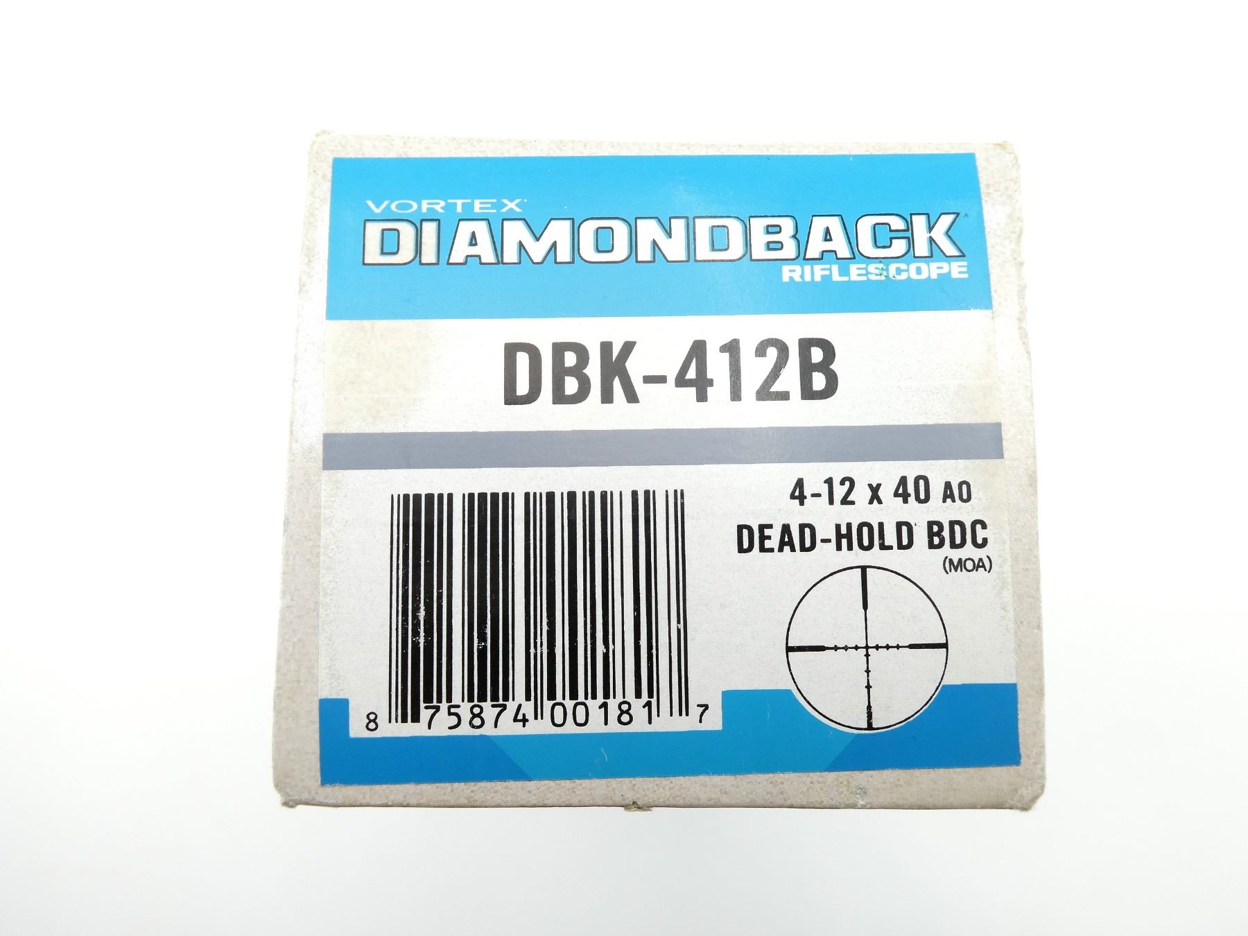 (1) CLEAR OPTICS, DEAD-HOLD BDC RETICLE, 1" TUBE DIAMETER, WORKING MAGNIFICATION RING, WINDAGE & ELEVATION KNOBS TURN, MARKED "VORTEX DIAMONDBACK 4-12X40AO", ETC., WITH INSTRUCTIONS IN ORIGINAL PACKAGING, SHOWS WEAR & TEAR / USE MARKINGS. MAY REQUIRE FITTING. SEE PHOTOS.