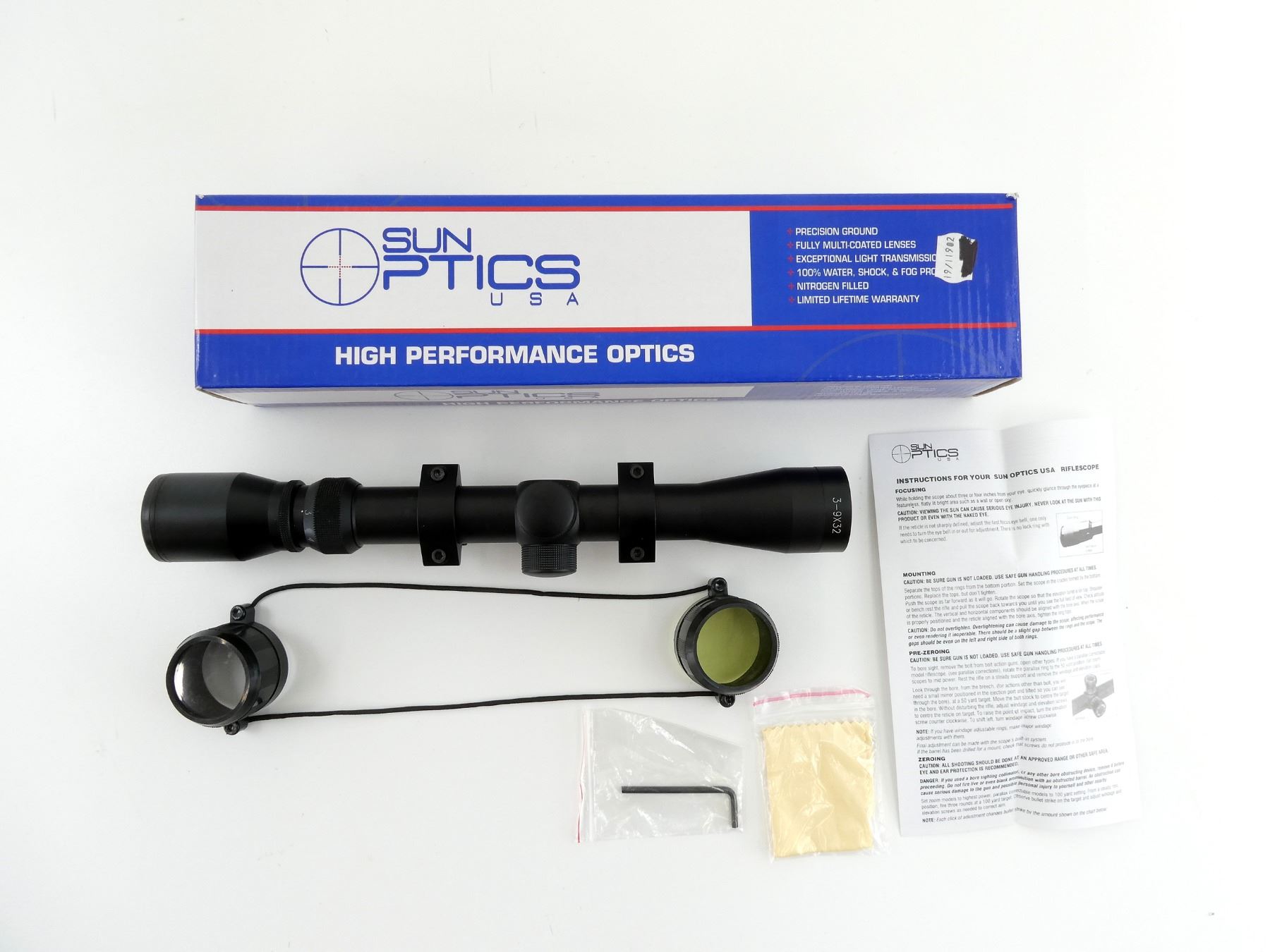 SUN OPTICS USA 3-9 X 32MM RIFLE SCOPE WITH ATTACHED RINGS