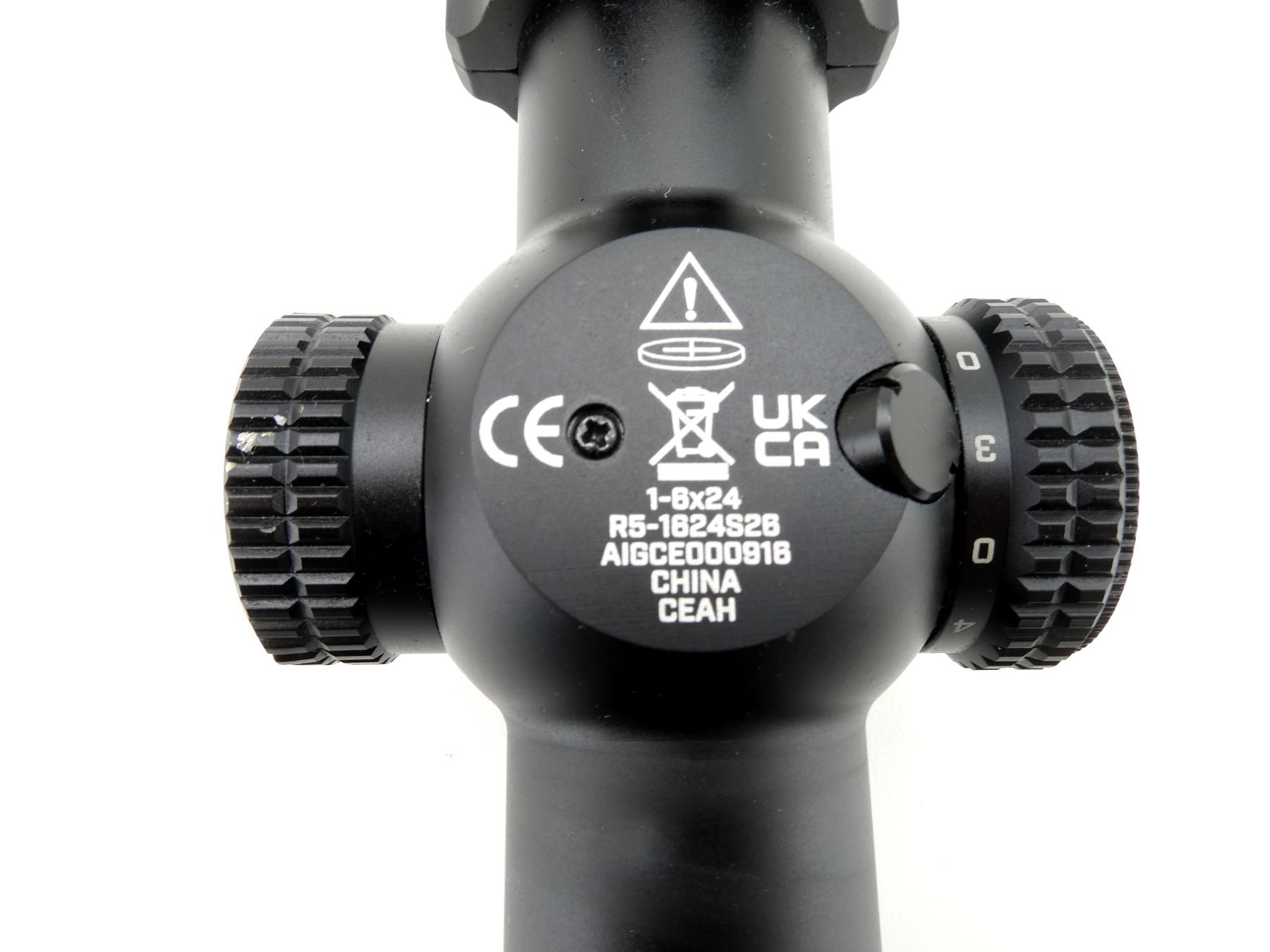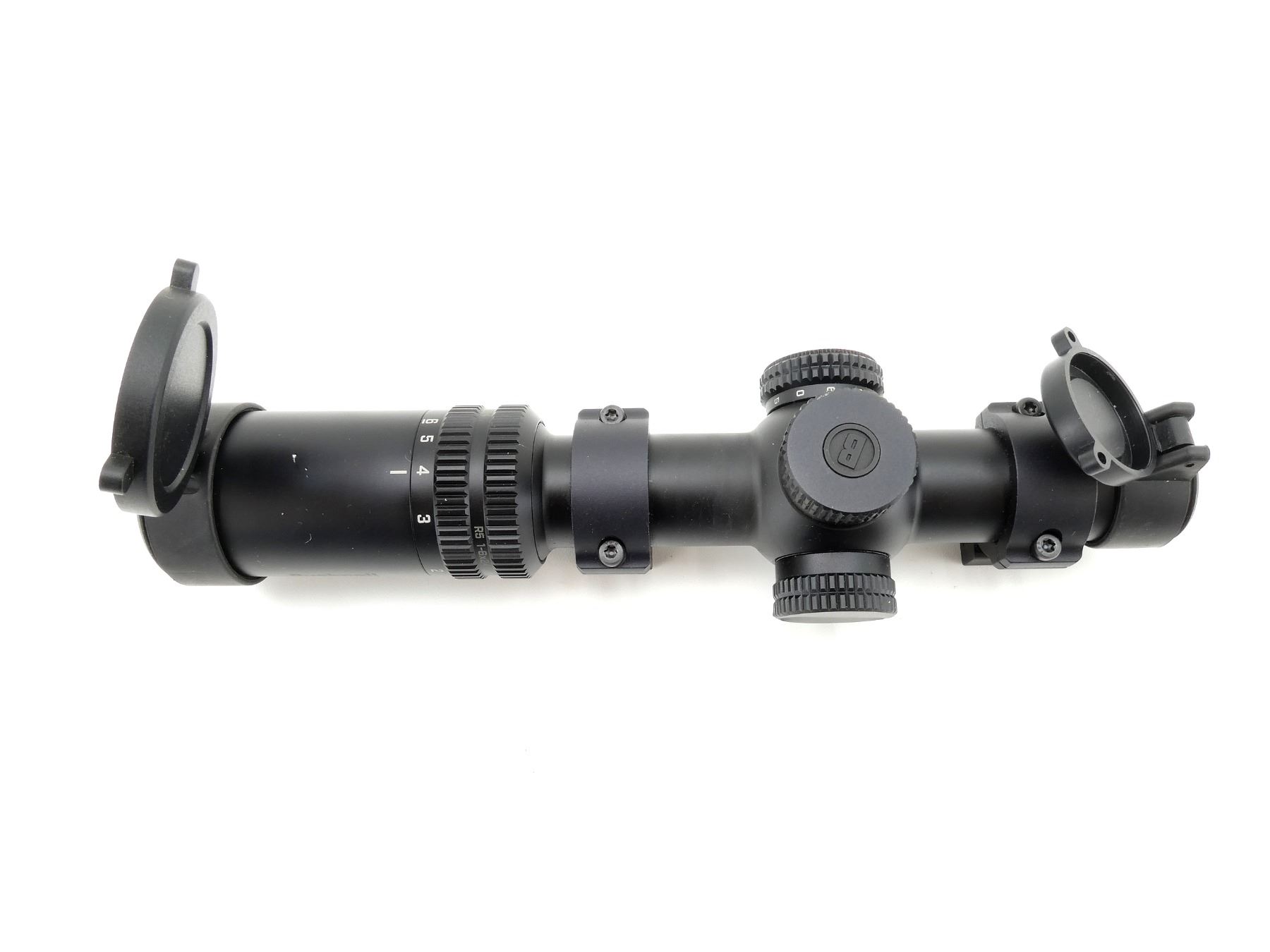 (1) CLEAR OPTICS, ILLUMINATED DD2-QA RETICLE, 30MM TUBE DIAMETER, WORKING MAGNIFICATION RING, WINDAGE & ELEVATION KNOBS TURN, MARKED: "BUSHNELL", "R-SERIES R5", "1-6X24, R5-1624S26", ETC., WITH LENS PROTECTORS & 30MM SCOPE RINGS ATTACHED, SHOWS LIGHT WEAR & TEAR / USE MARKINGS. MAY REQUIRE FITTING. SEE PHOTOS.