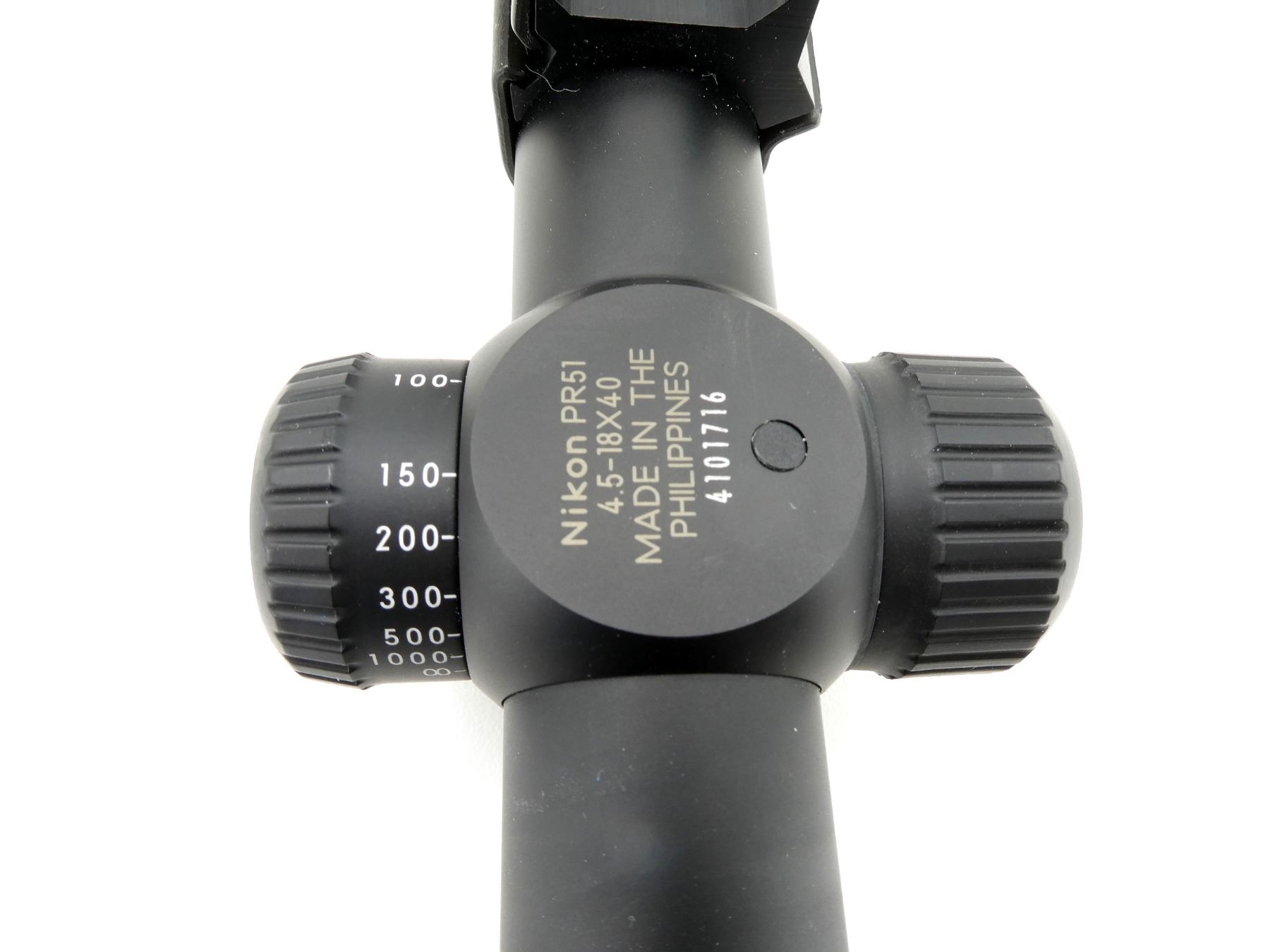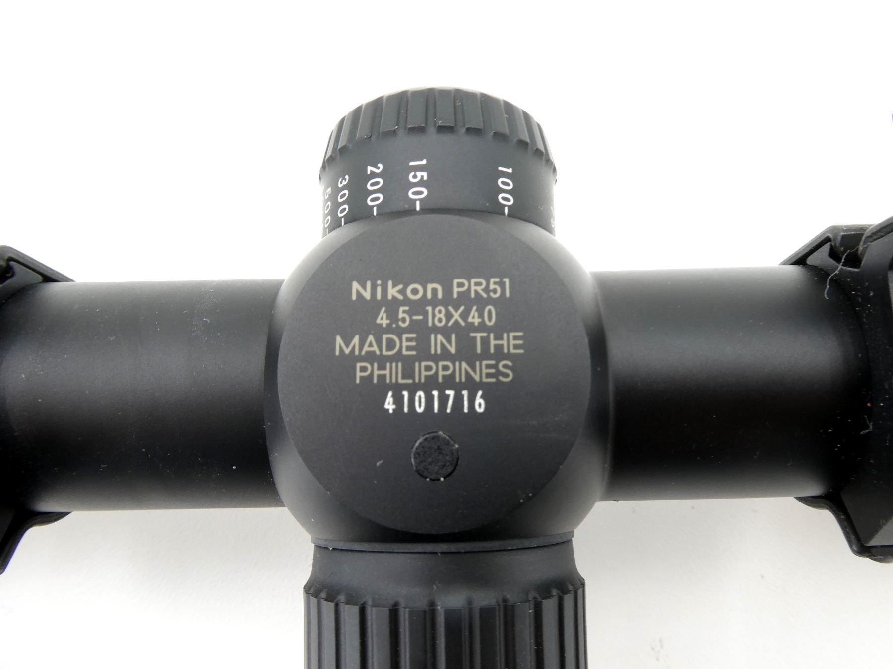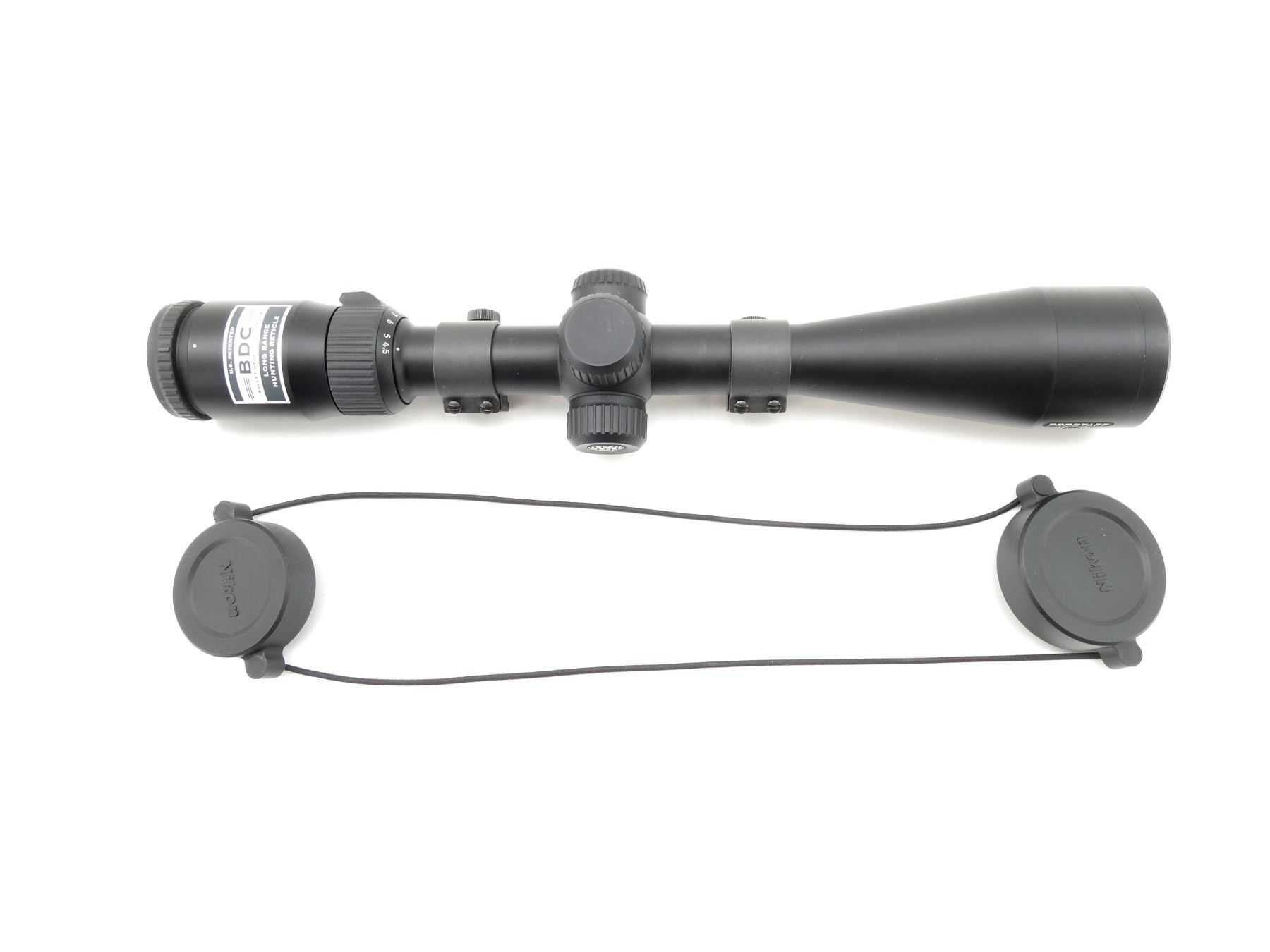 (1) CLEAR OPTICS, BDC LONG RANGE HUNTING RETICLE, 1" TUBE DIAMETER, WORKING MAGNIFICATION RING, WINDAGE & ELEVATION KNOBS TURN, MARKED: "NIKON", "PROSTAFF 5", "4.5-18X40", "4101716", ETC., WITH LENS PROTECTORS & 1" WEAVER SCOPE RINGS ATTACHED, SHOWS LIGHT WEAR & TEAR / USE MARKINGS. MAY REQUIRE FITTING. SEE PHOTOS.